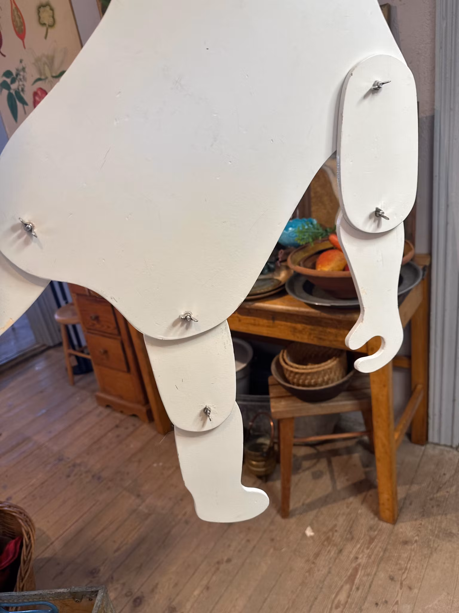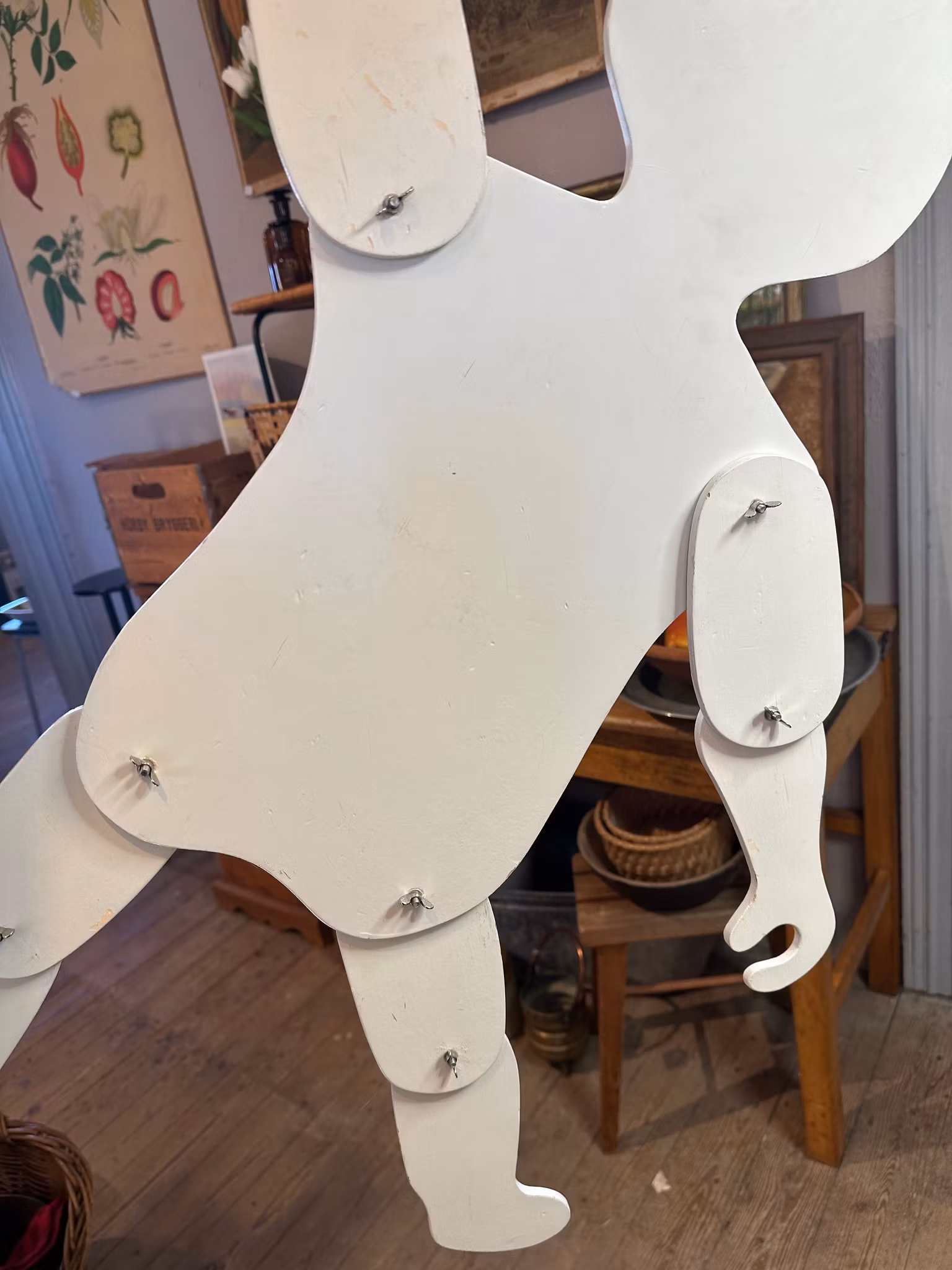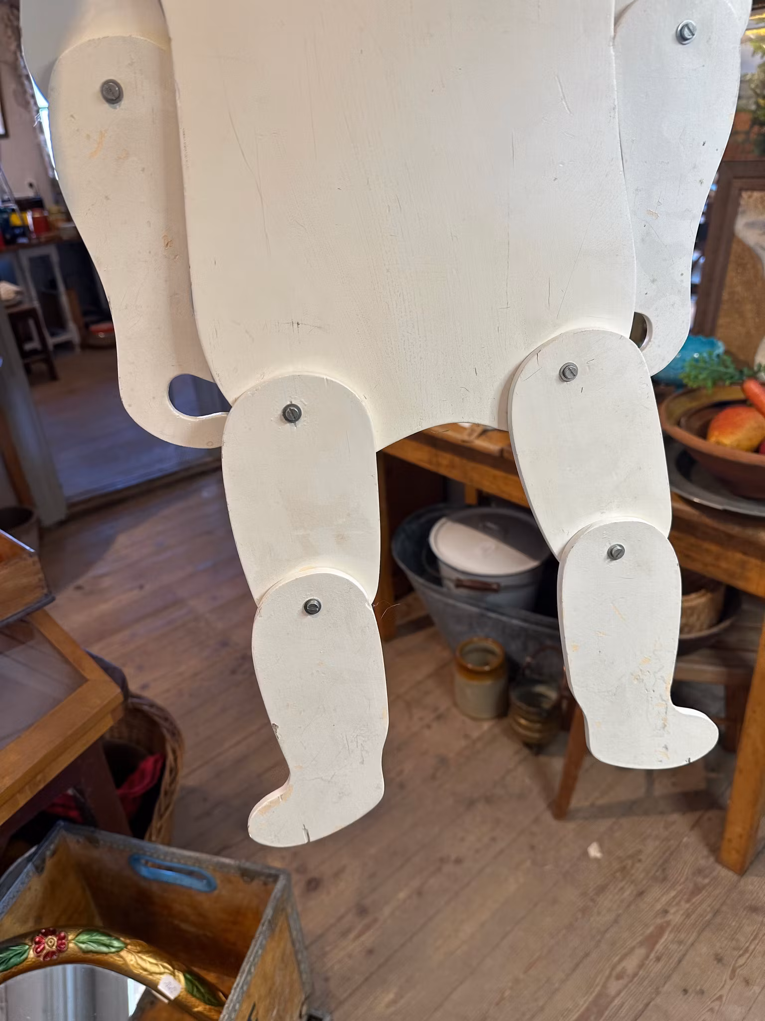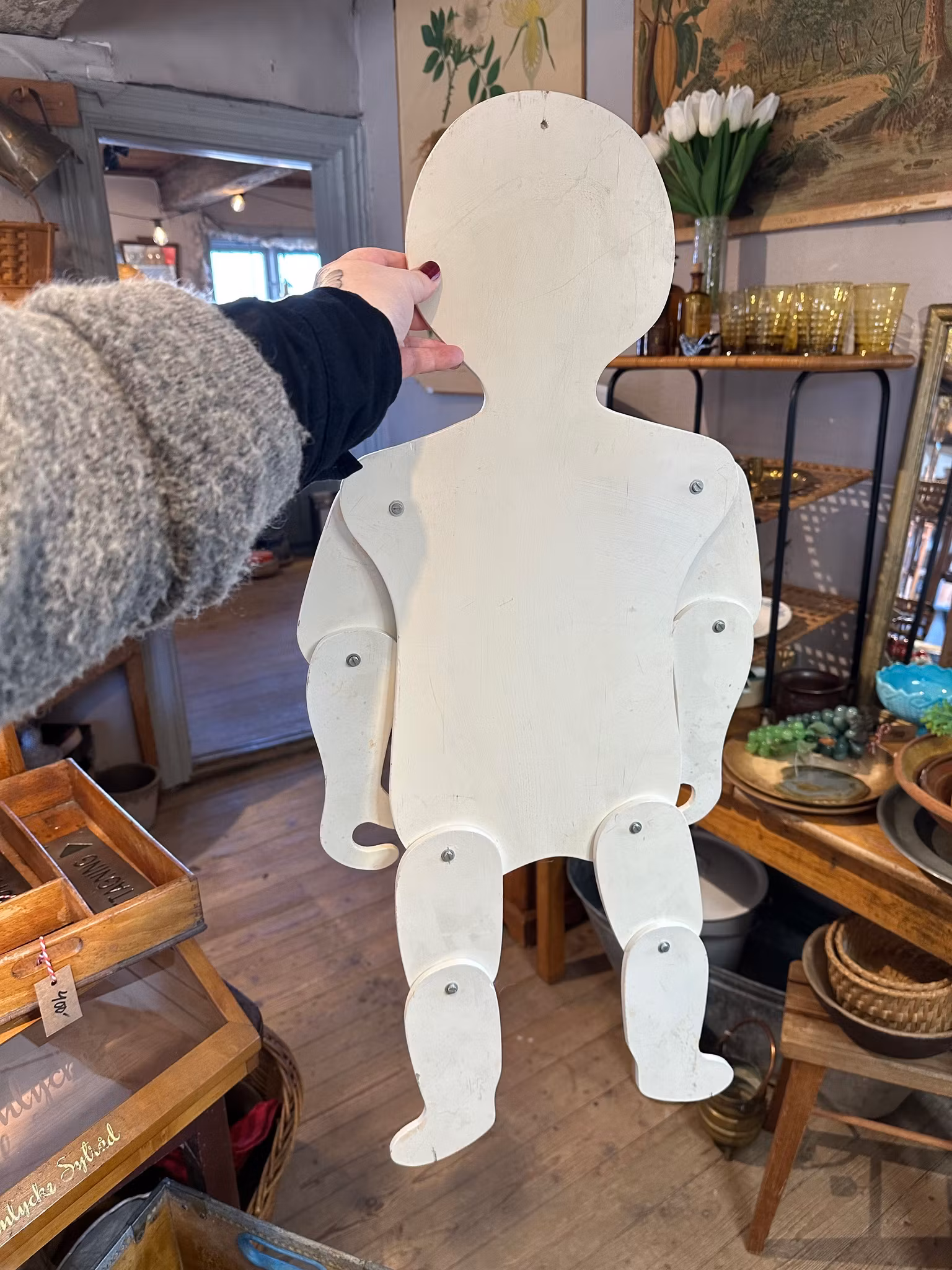 Charmig figur i trä. Vitmålad men varit typ hudfärgad vid något tillfälle då det lyser igenom. Ska vara från en klädaffär där den använts vid skyltning.