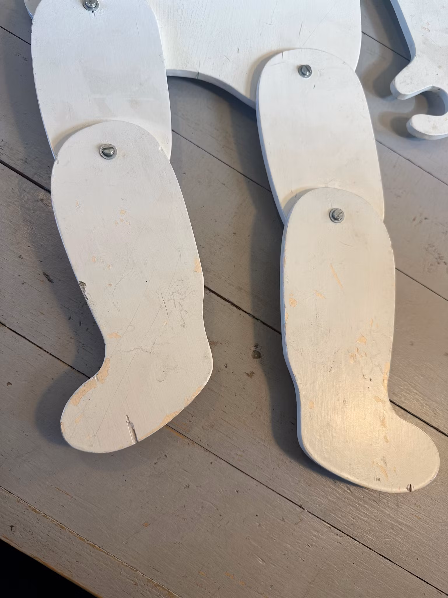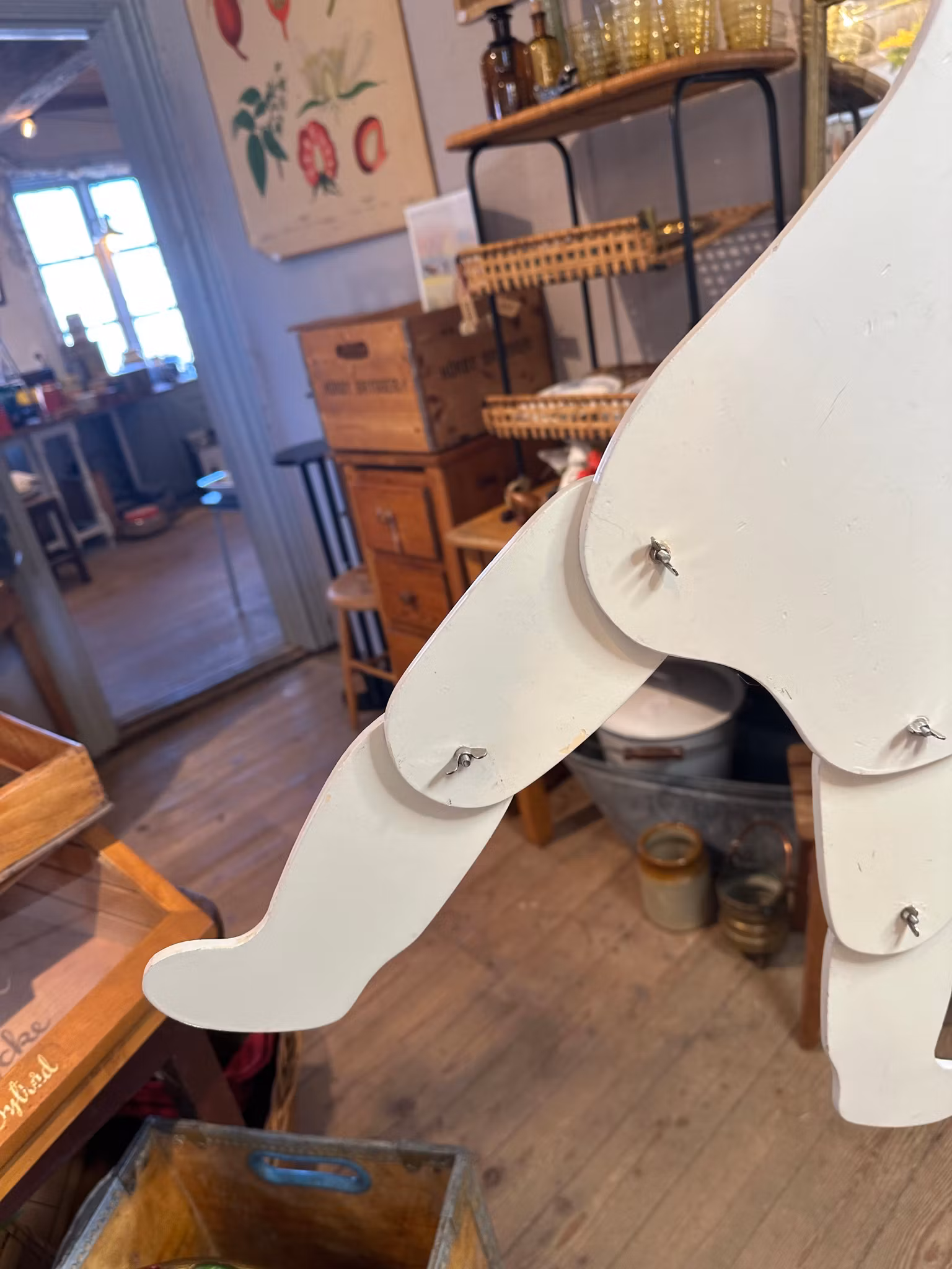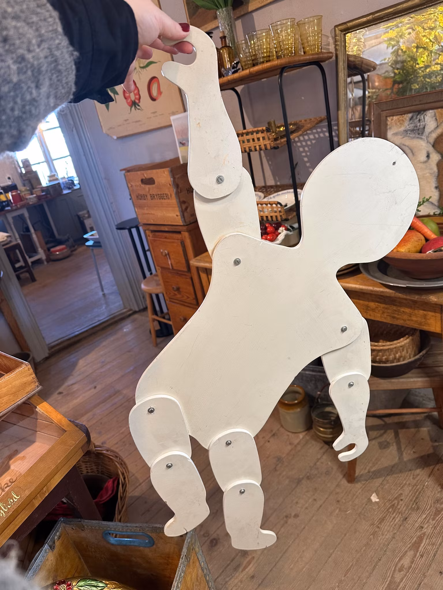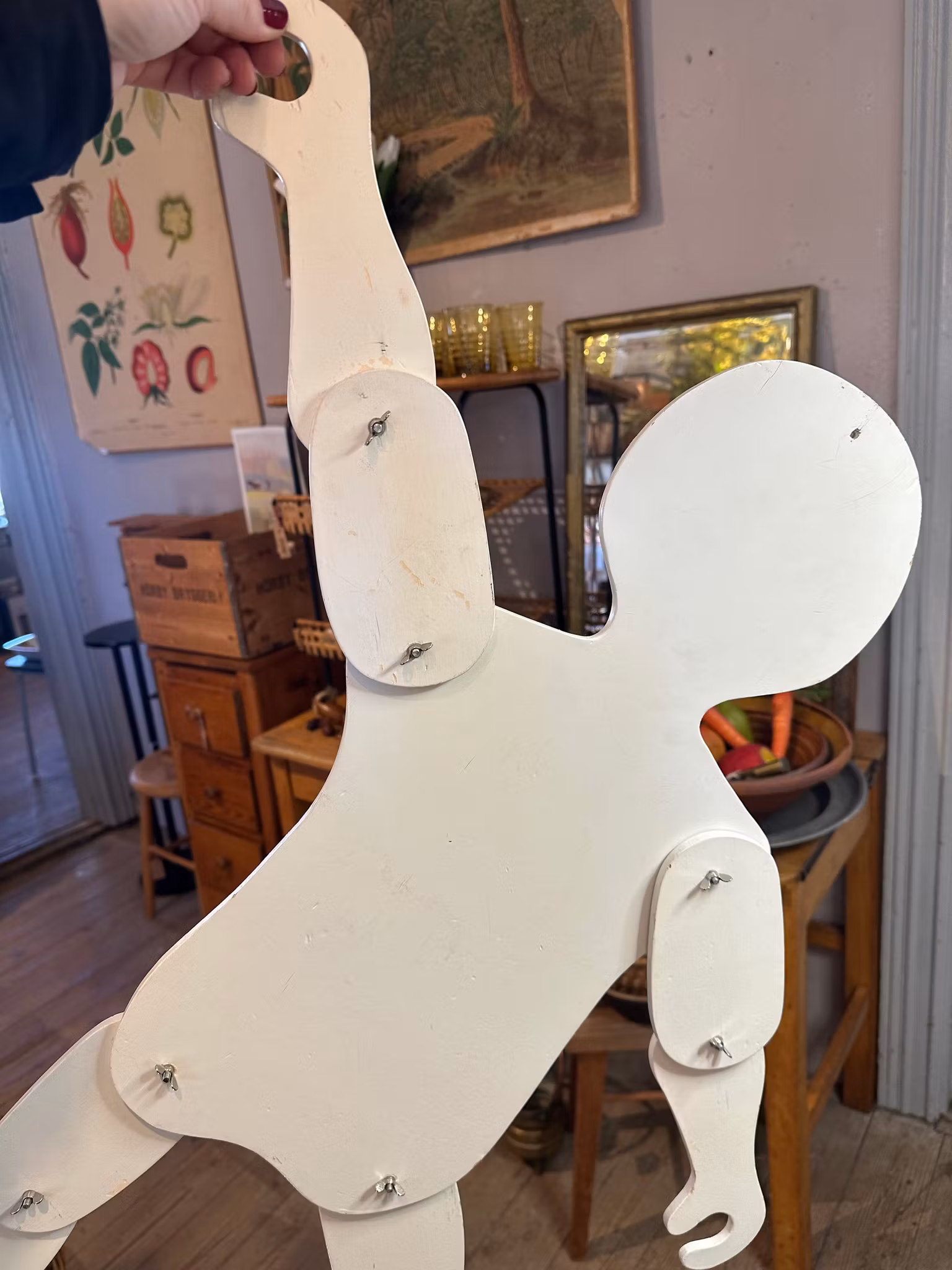 Charmig figur i trä. Vitmålad men varit typ hudfärgad vid något tillfälle då det lyser igenom. Ska vara från en klädaffär där den använts vid skyltning.