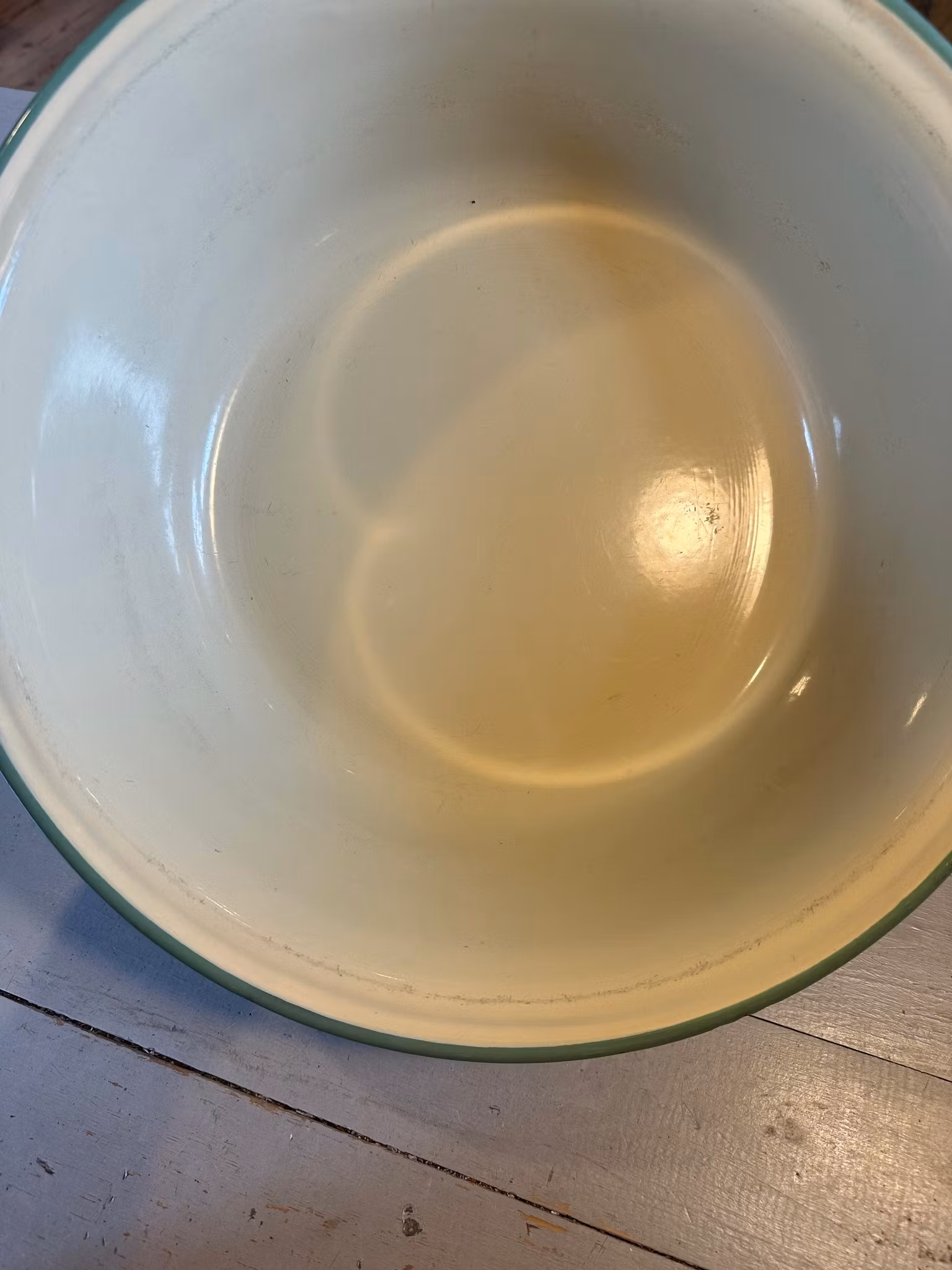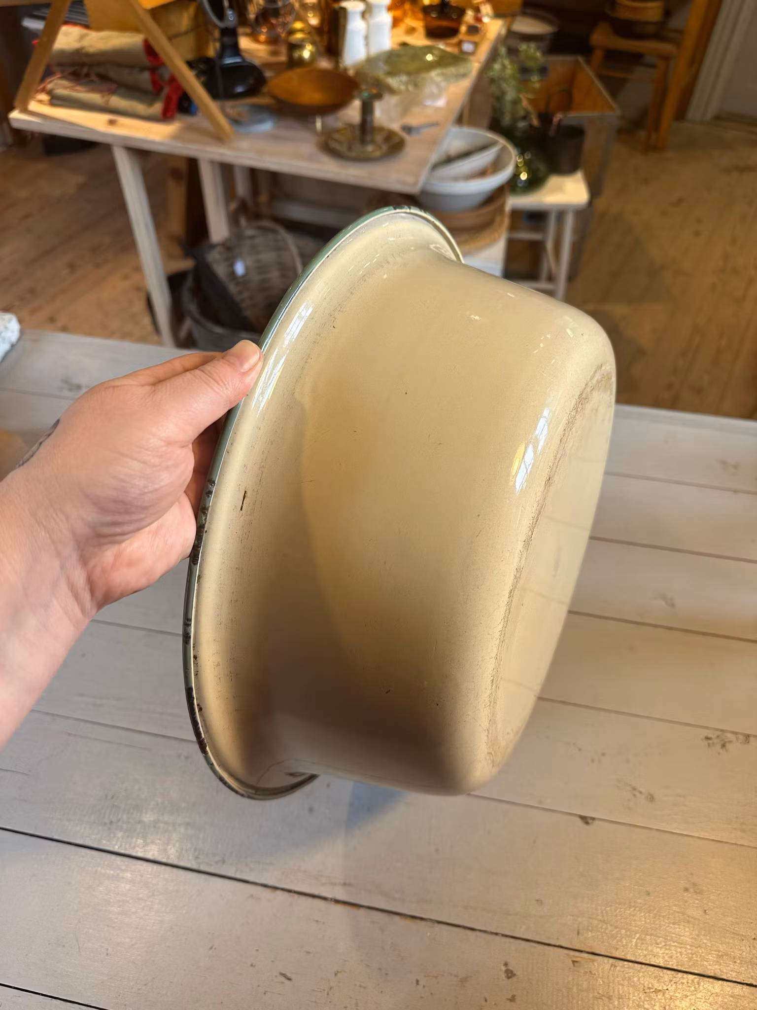 I gott använt och åldrat skick. Spår av användning finns över hela. Se bilder för skick. Slitage finns över hela då det använts. Avslag i emaljen finns här och där runt kanterna.