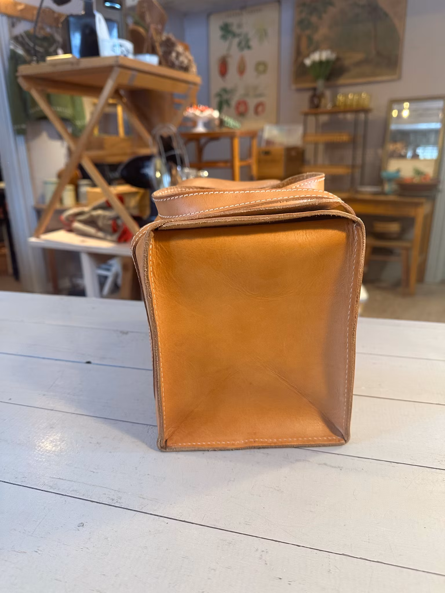 Fin liten läderväska i annorlunda modell. Ålder okänd. Ett stort innerfack med en liten sidoficka.