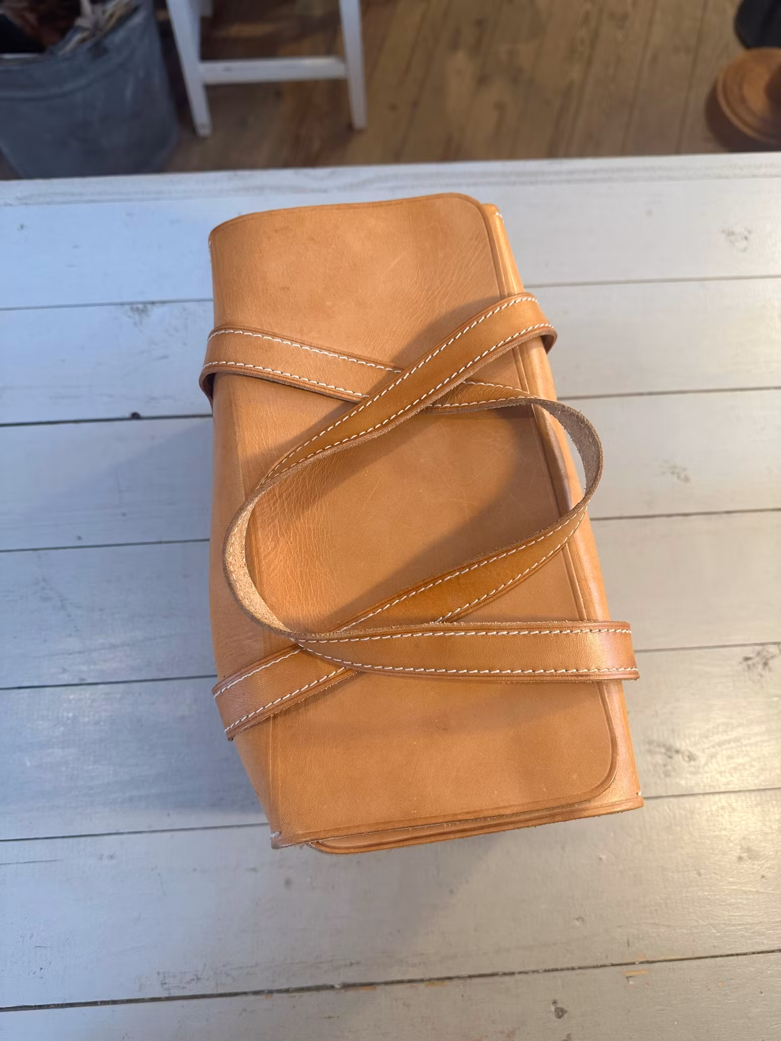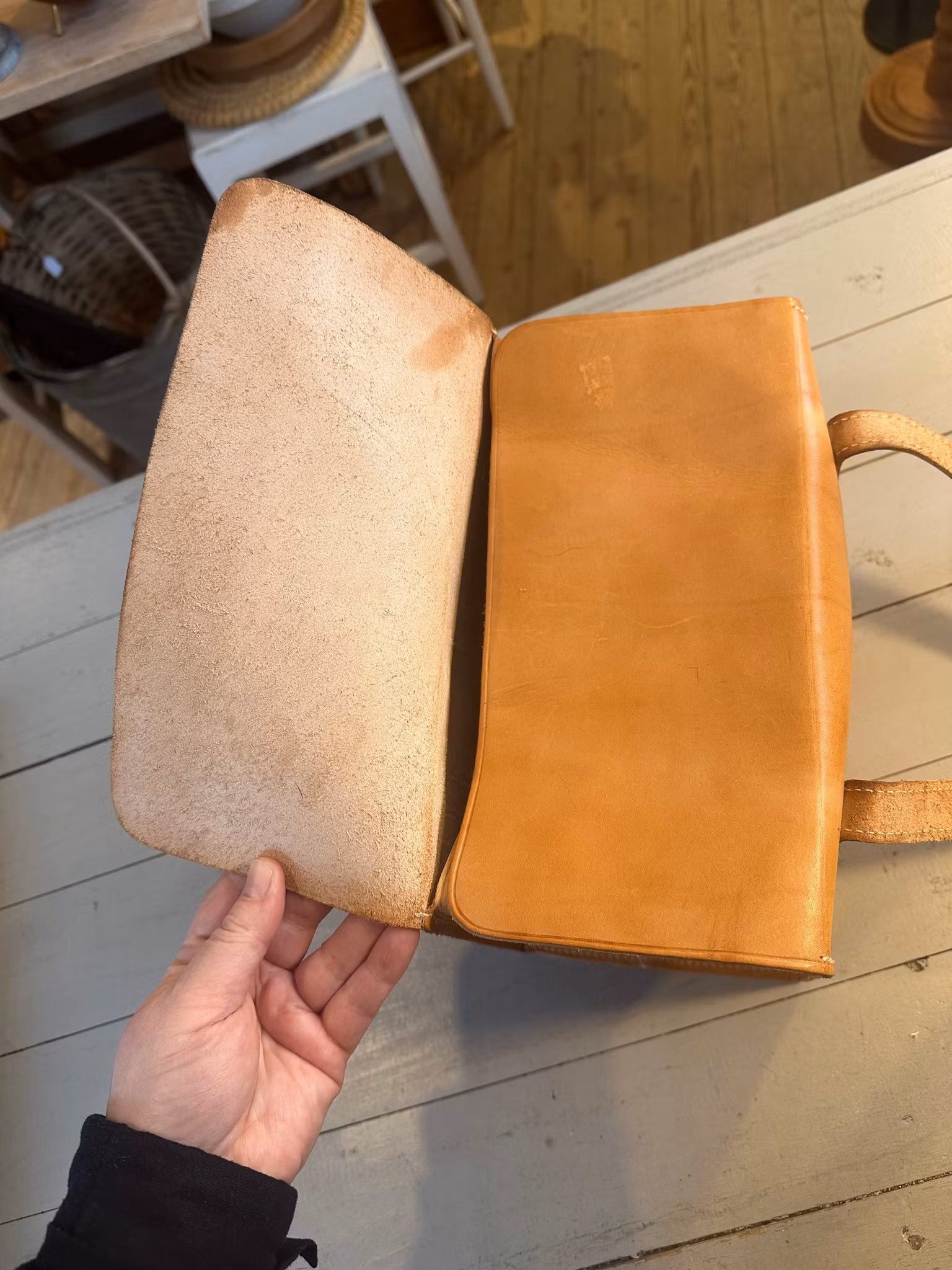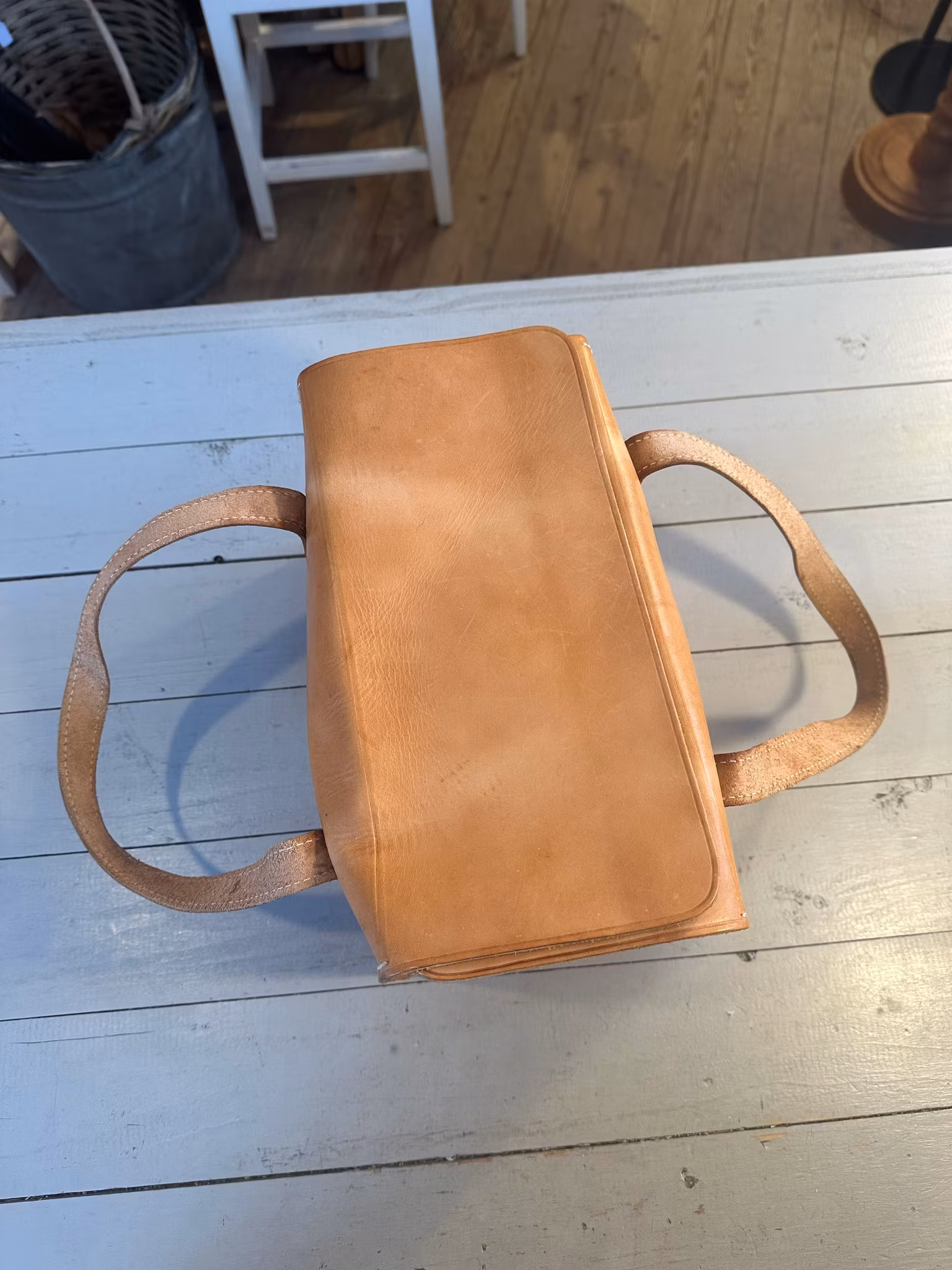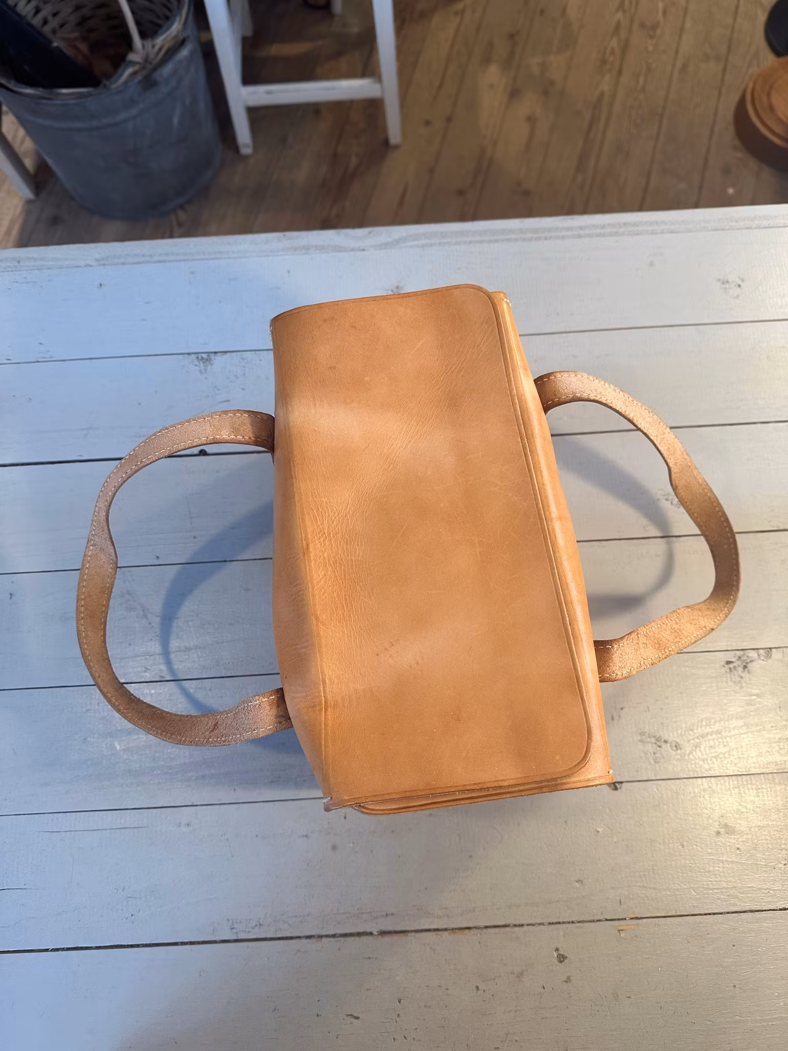 I gott använt och åldrat skick. Spår av användning och ålder finns över hela. Se bilder för skick. Något skav och små fläckar finns samt någon färgskiftning i lädret.