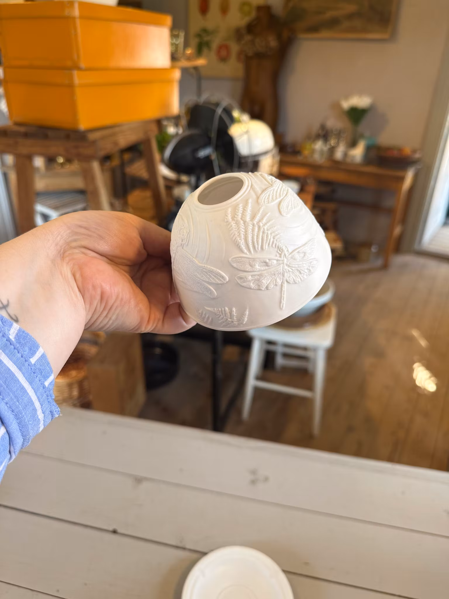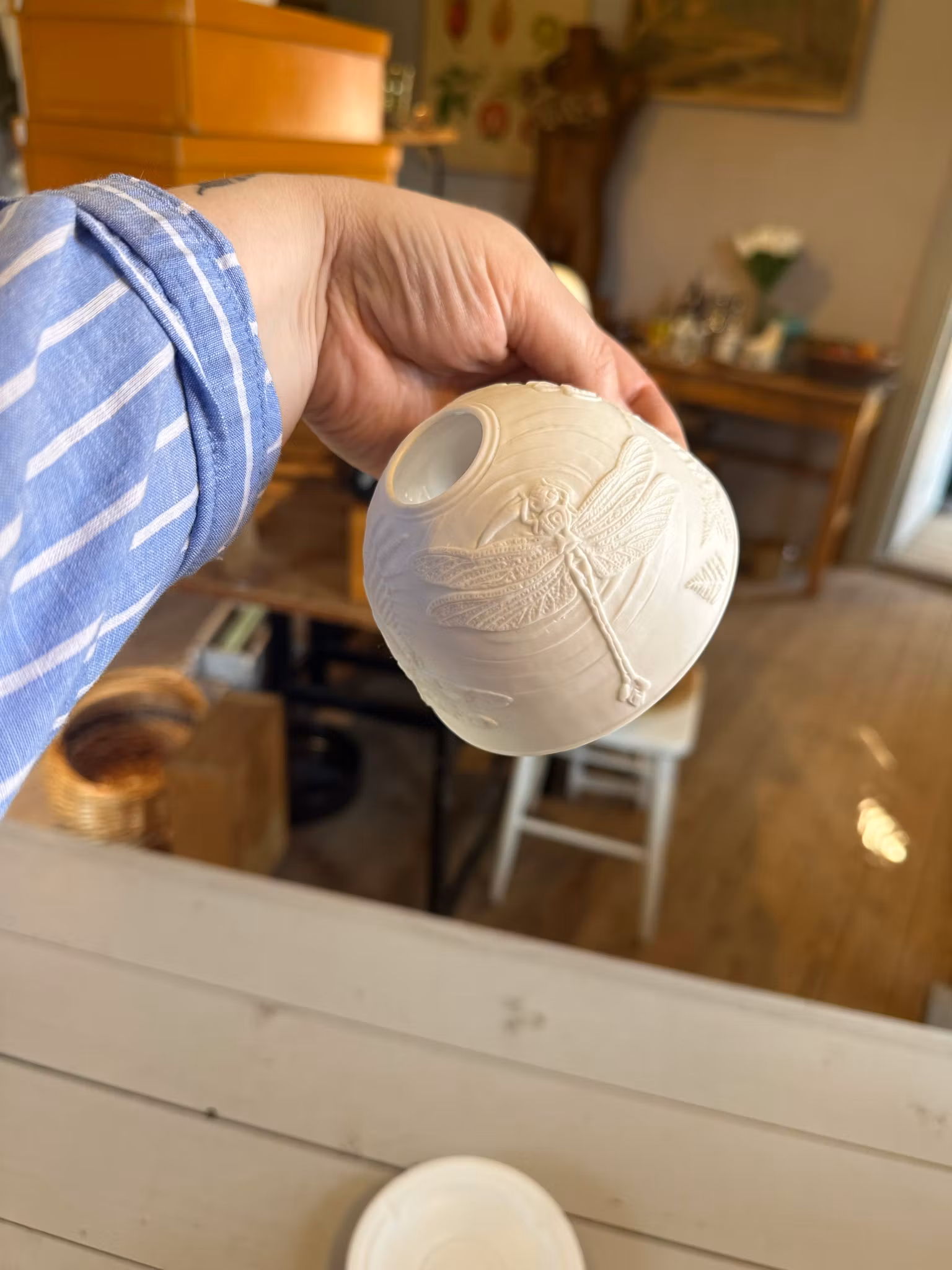 Söt liten ljuslykta i vitt. Lyser vackert när den tänds. Motiv av trollsländor och annat, se bilder.