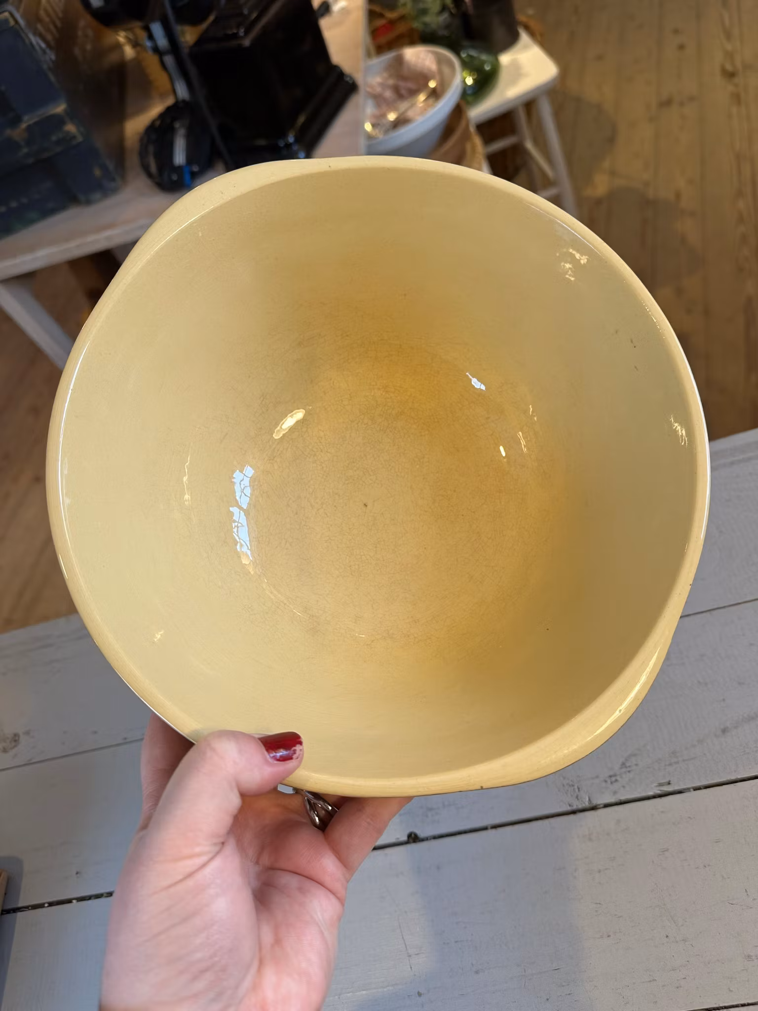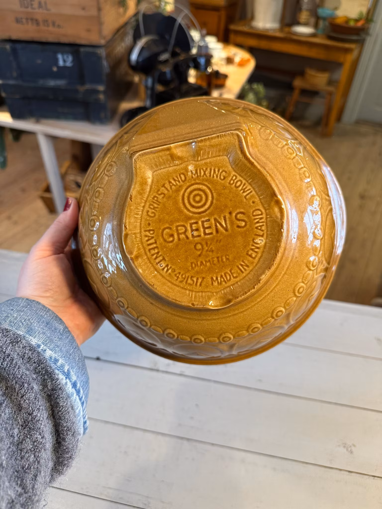 Otroligt fin engelsktillverkad ”mixingbowl” med väldigt vacker gulbrun glasyr utanpå. Märkning undertill, Green’s Gripstand Mixing Bowl.