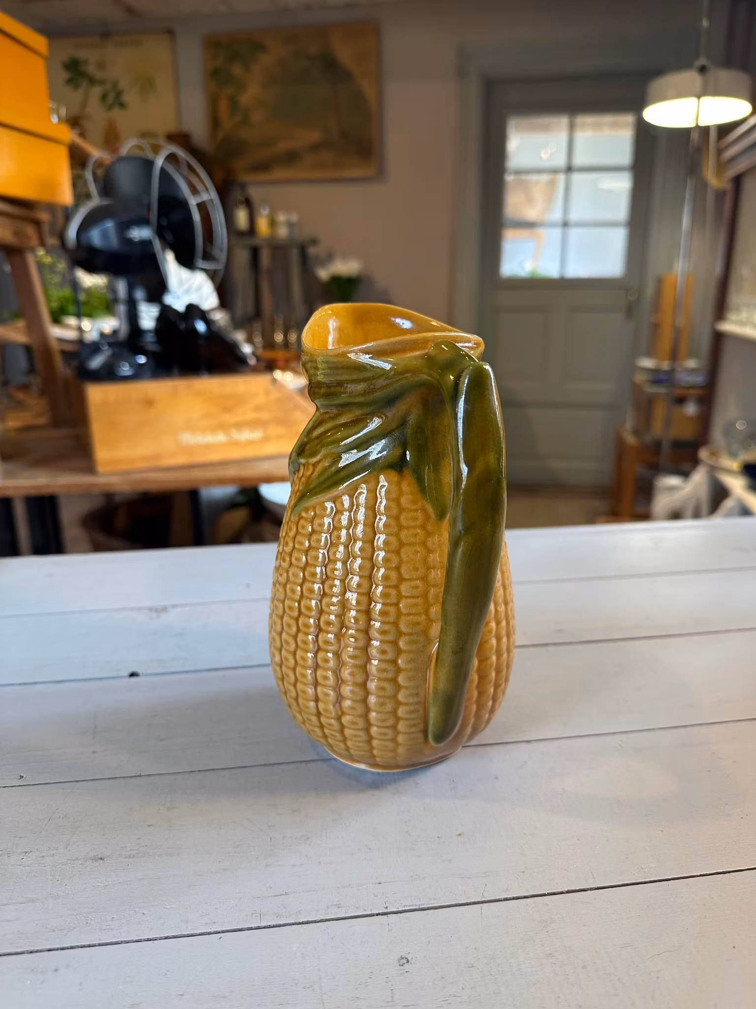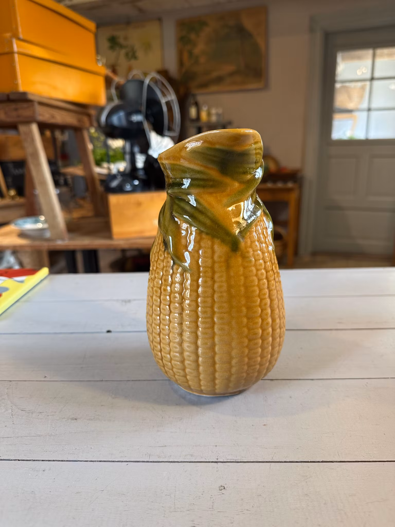 Kanna i keramik med majs-look. I gott använt och åldrat skick. Spår av användning och ålder finns. Se bilder för skick. Höjd ca 18,5cm framtill vid hällpipen.