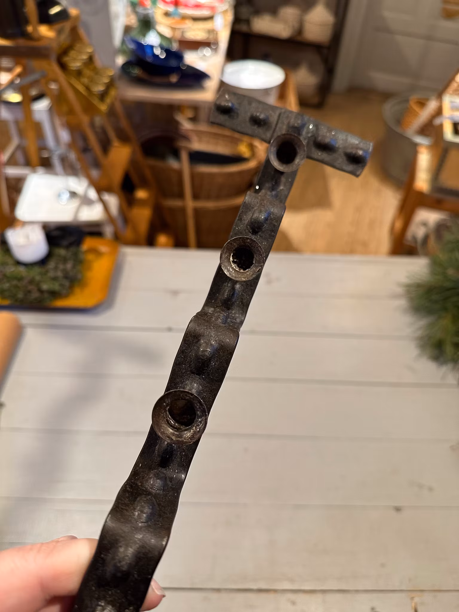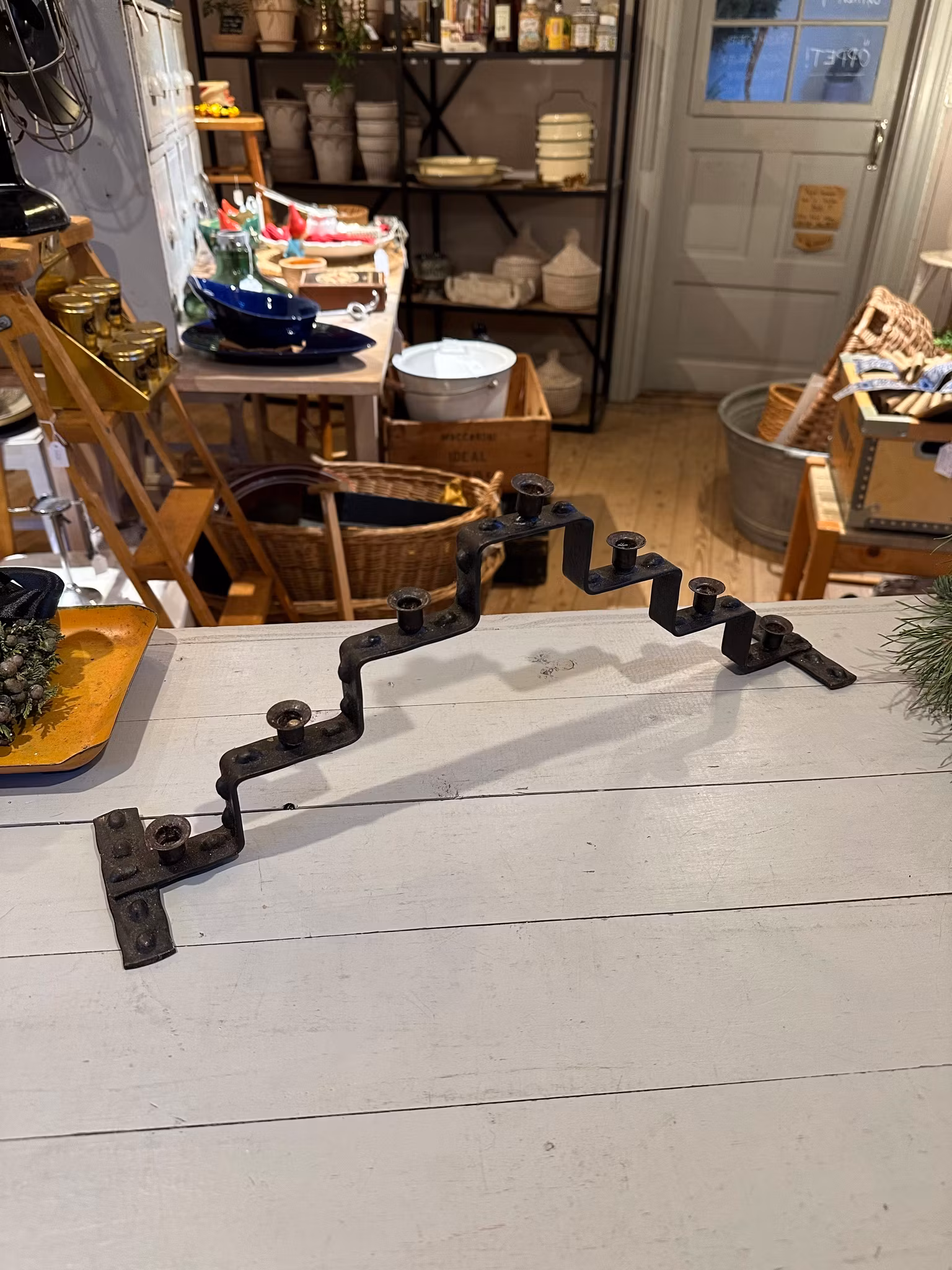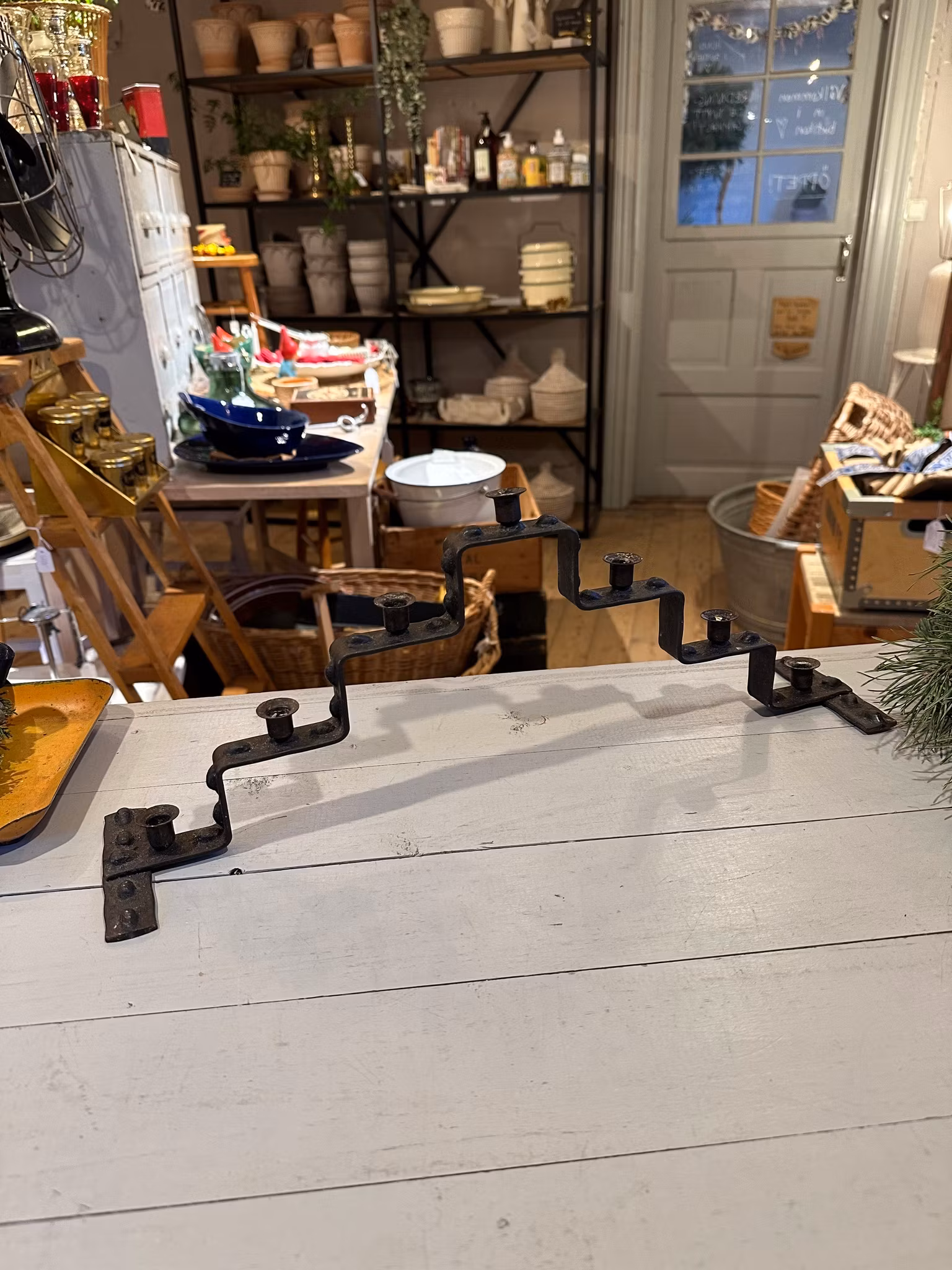 I gott använt och åldrat skick. Spår av användning/ålder finns över hela. Se bilder för skick. Står lite vippigt. Några ljushållare har lite lutning.