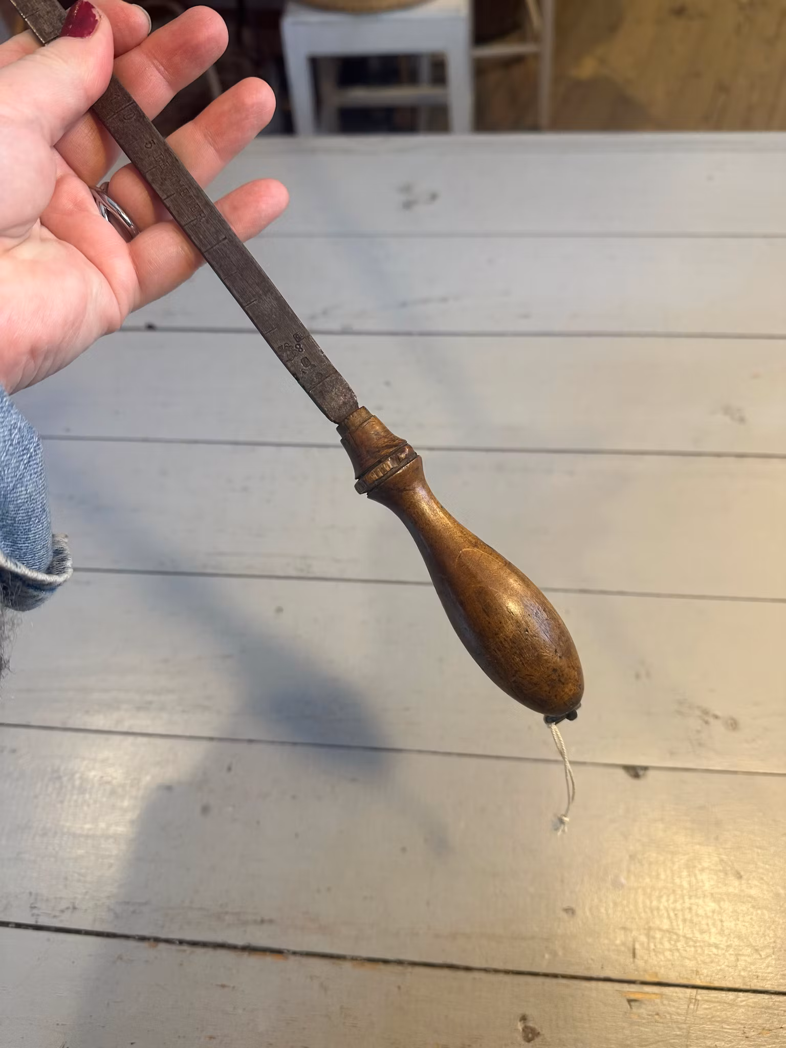 Underbart gammalt alnmått med handtag i trä.