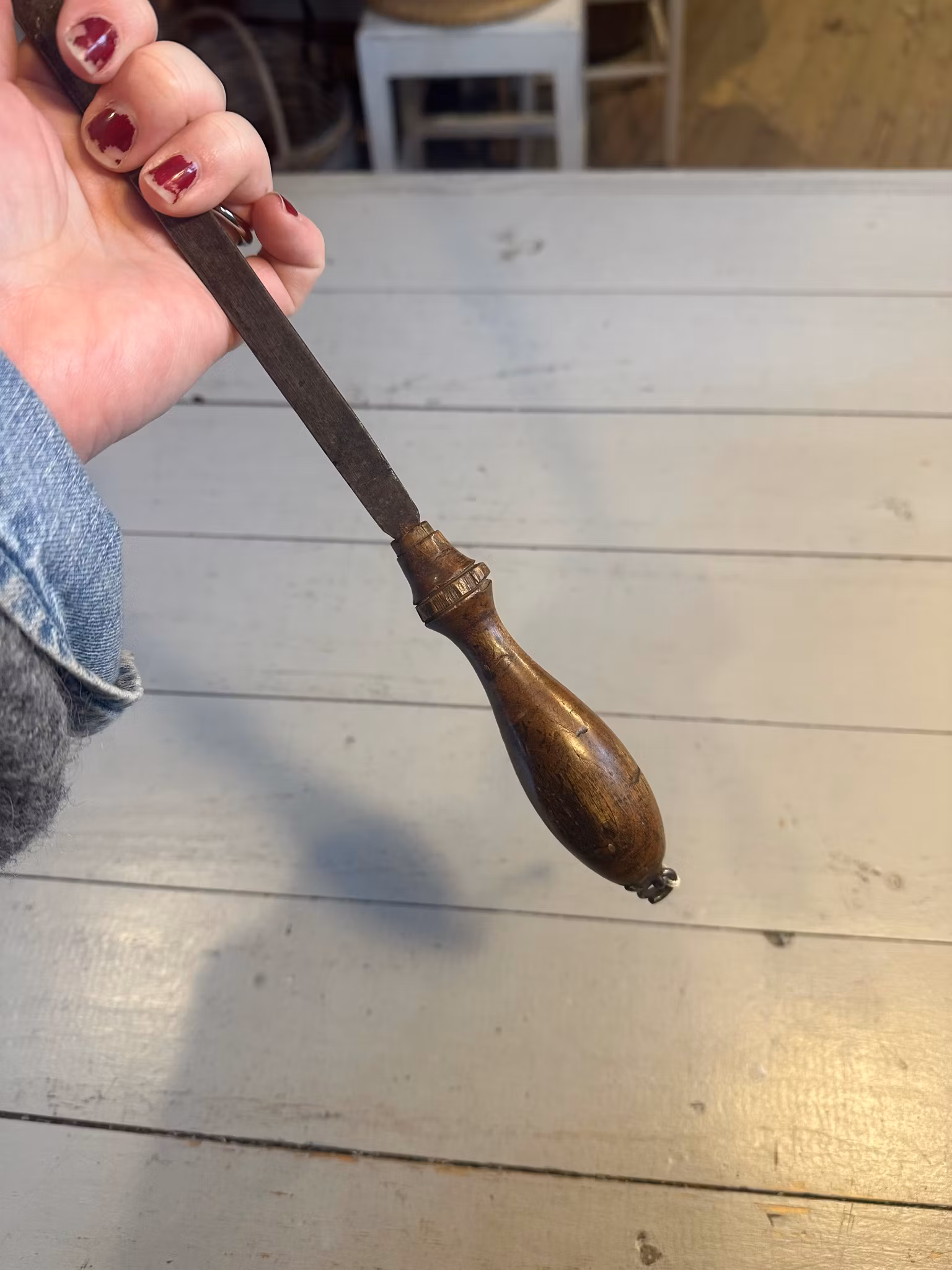 I gott använt och åldrat skick. Spår av användning finns över hela. Se bilder för skick. Handtaget har gamla avslag. Metall åldrad.