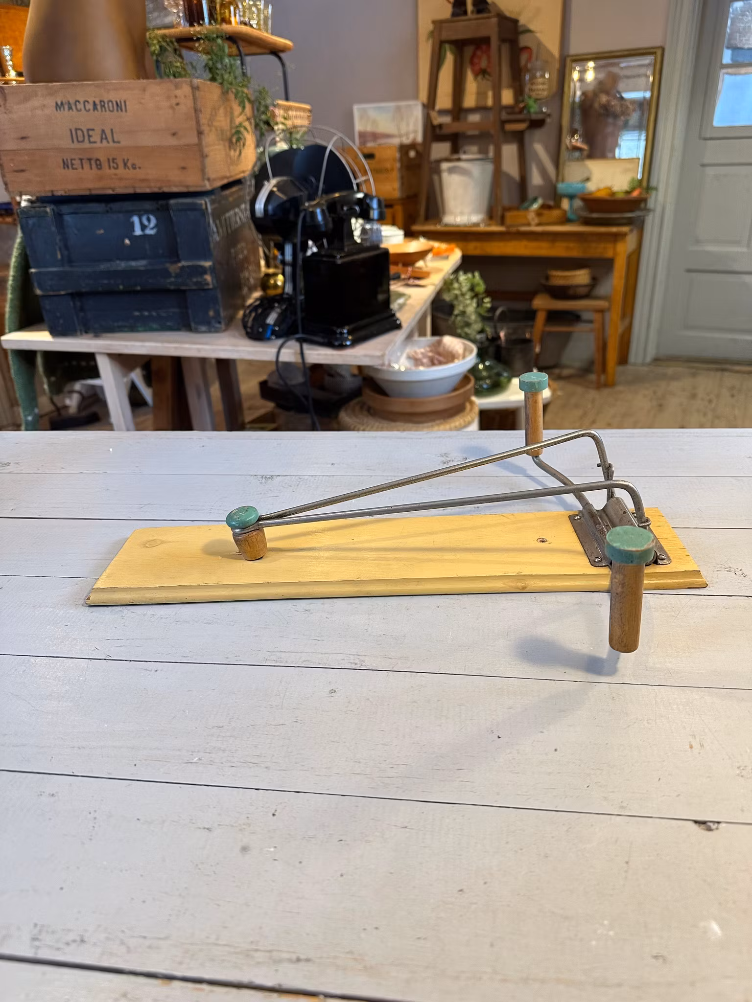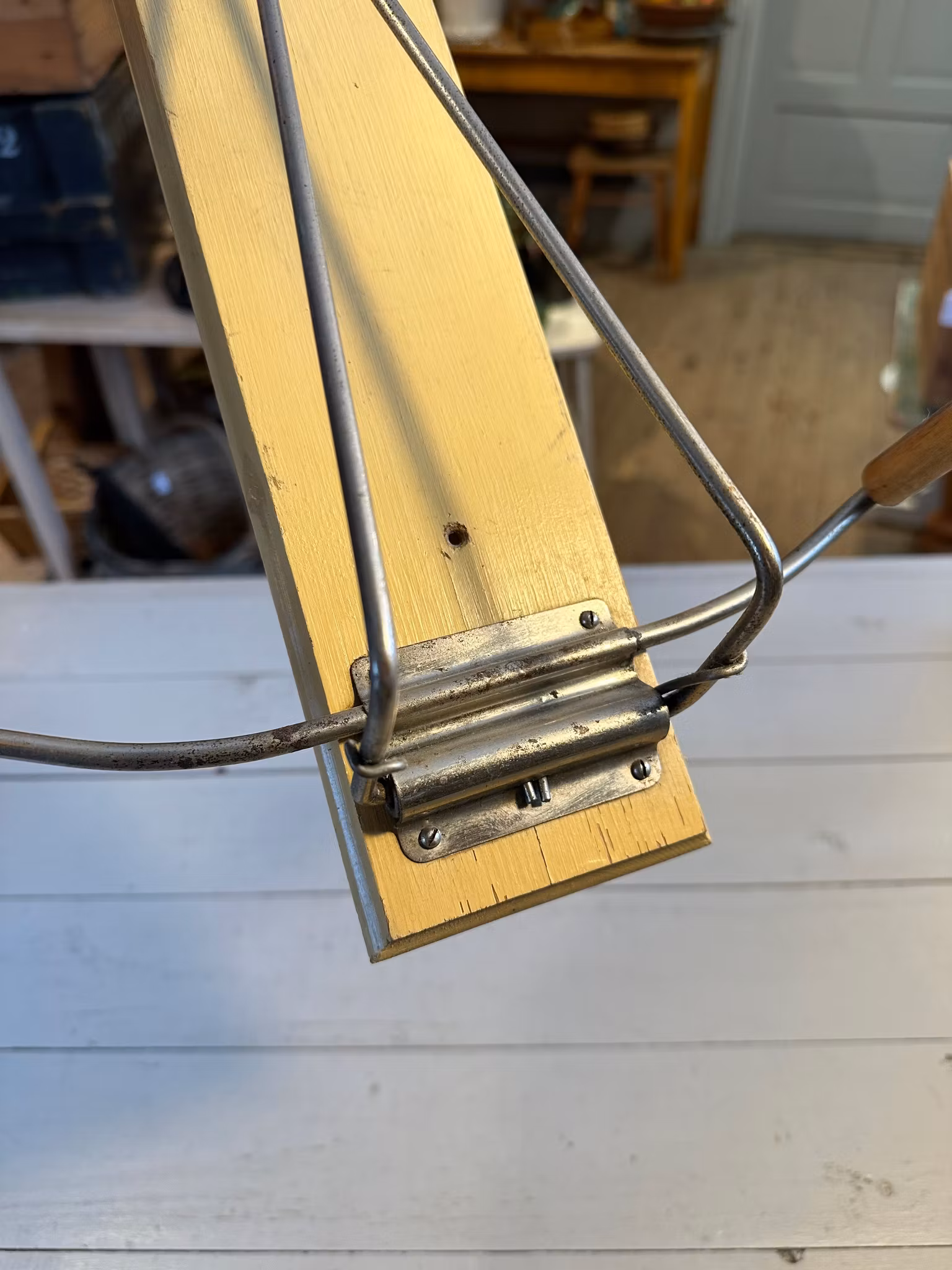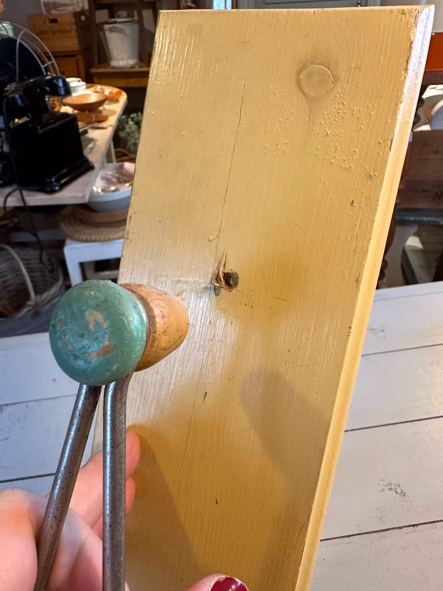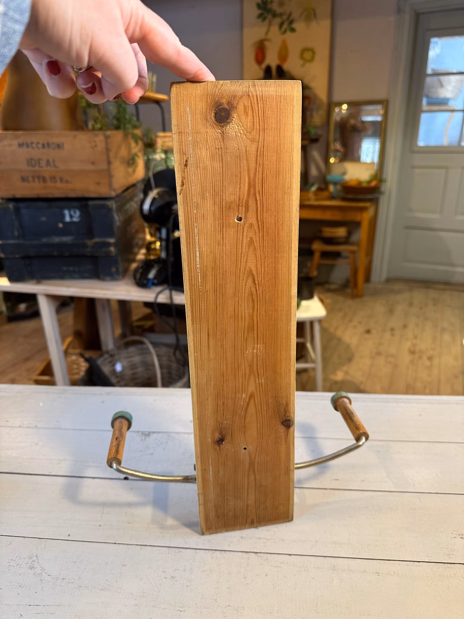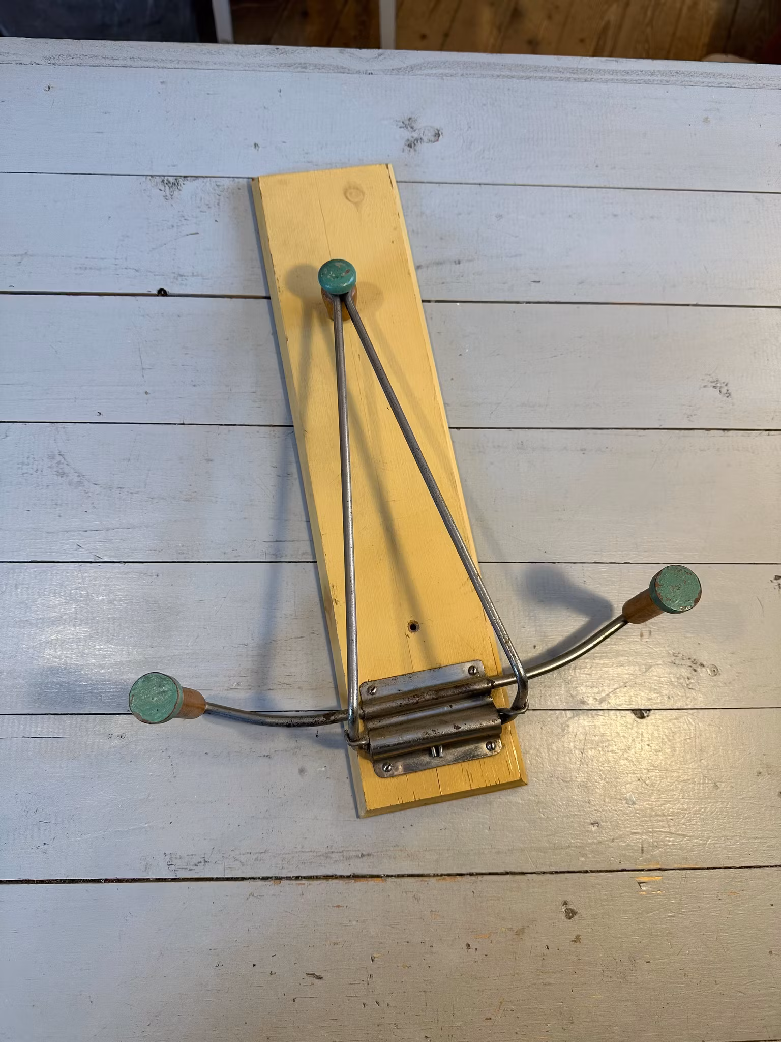 Charmig gammal brickhållare i trä och metall. Ljust gul och grön. Smart och snygg förvaring!