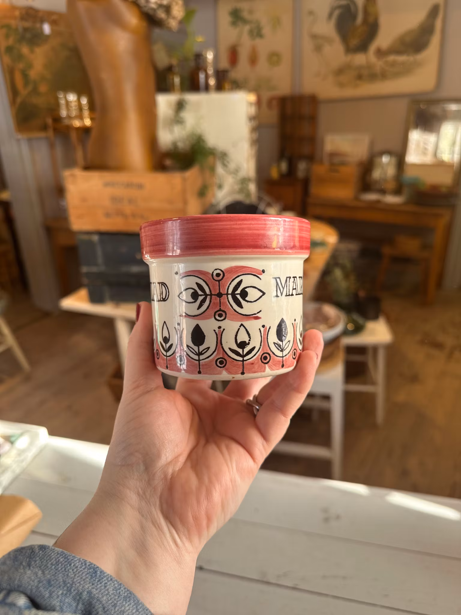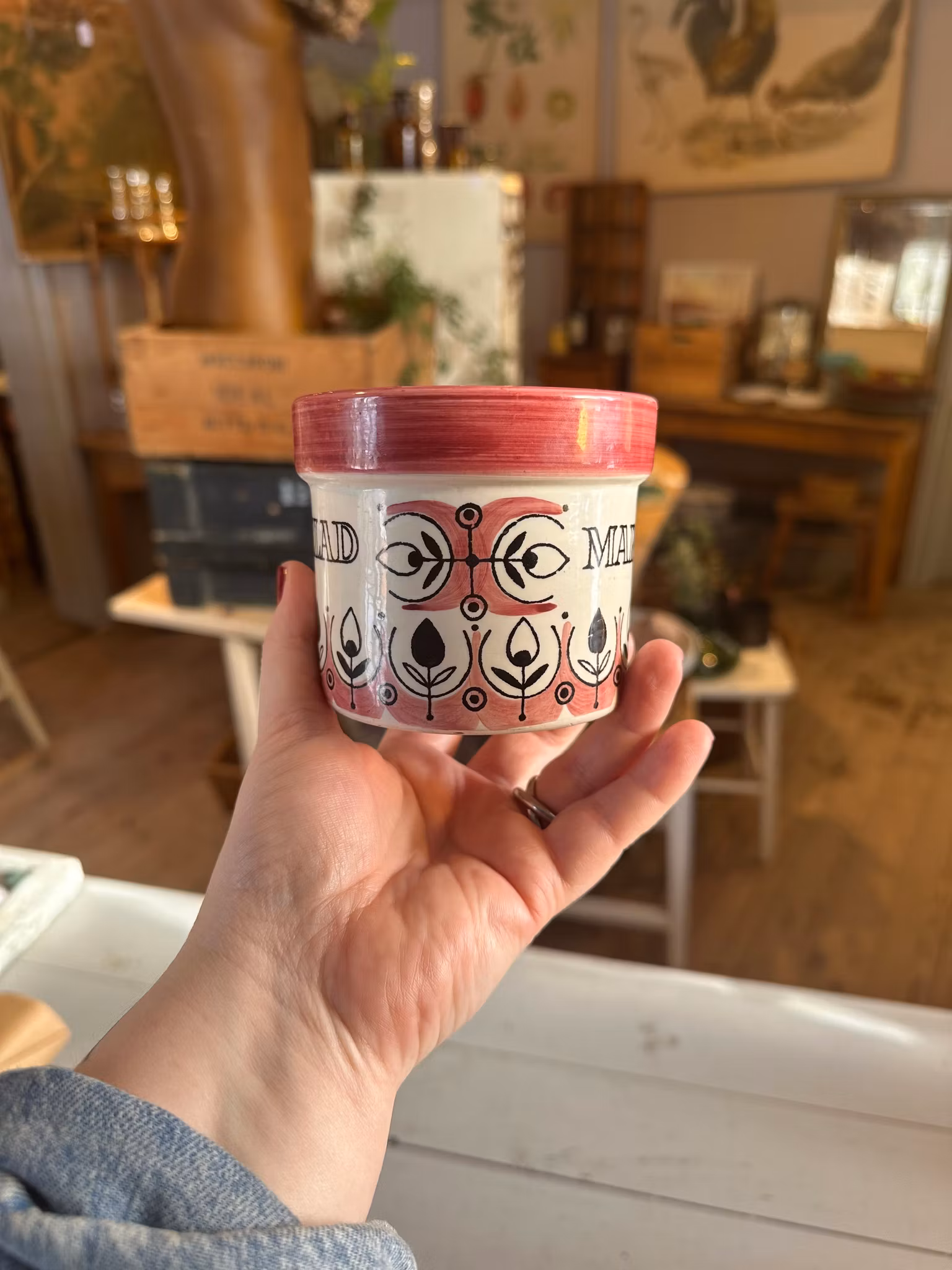 Söt liten marmeladburk från svenska Jie Keramik. Rosa och svart dekor. Har säkert haft ett lock en gång men fin som den är till att duka upp frukost eller liknande med.