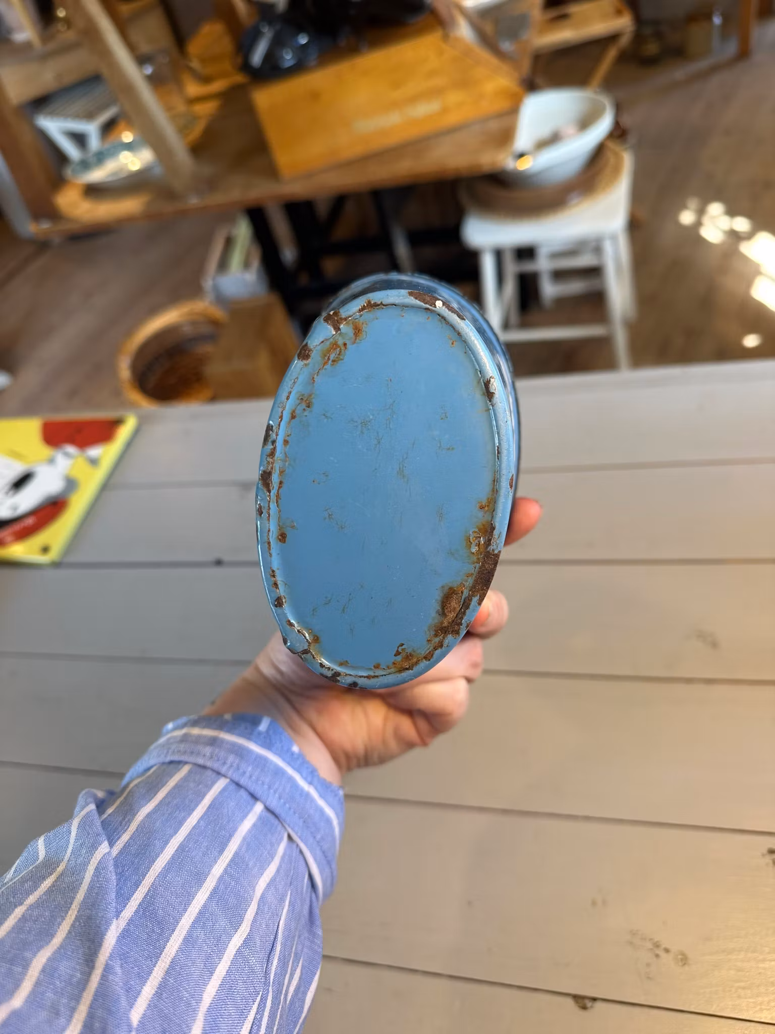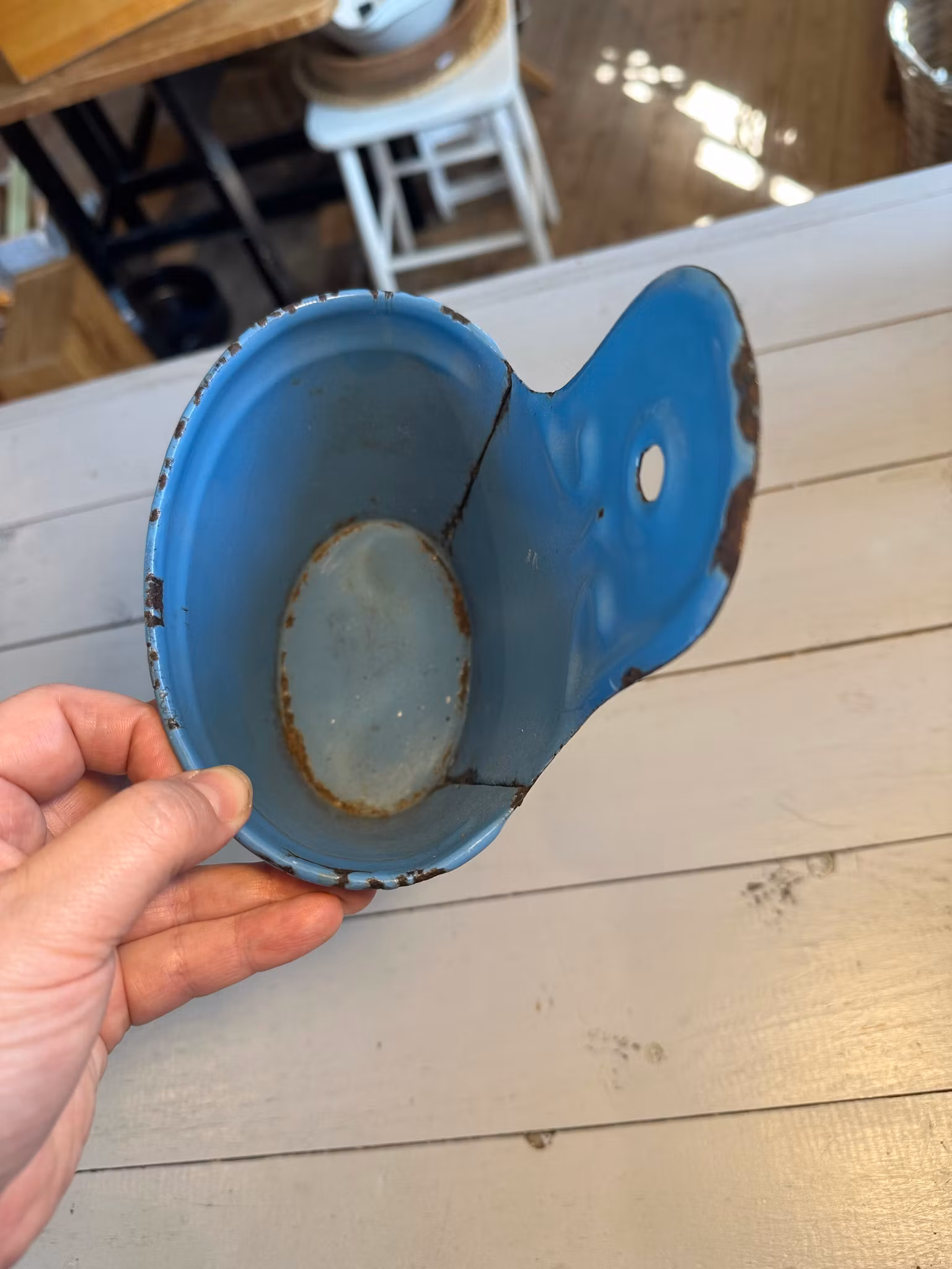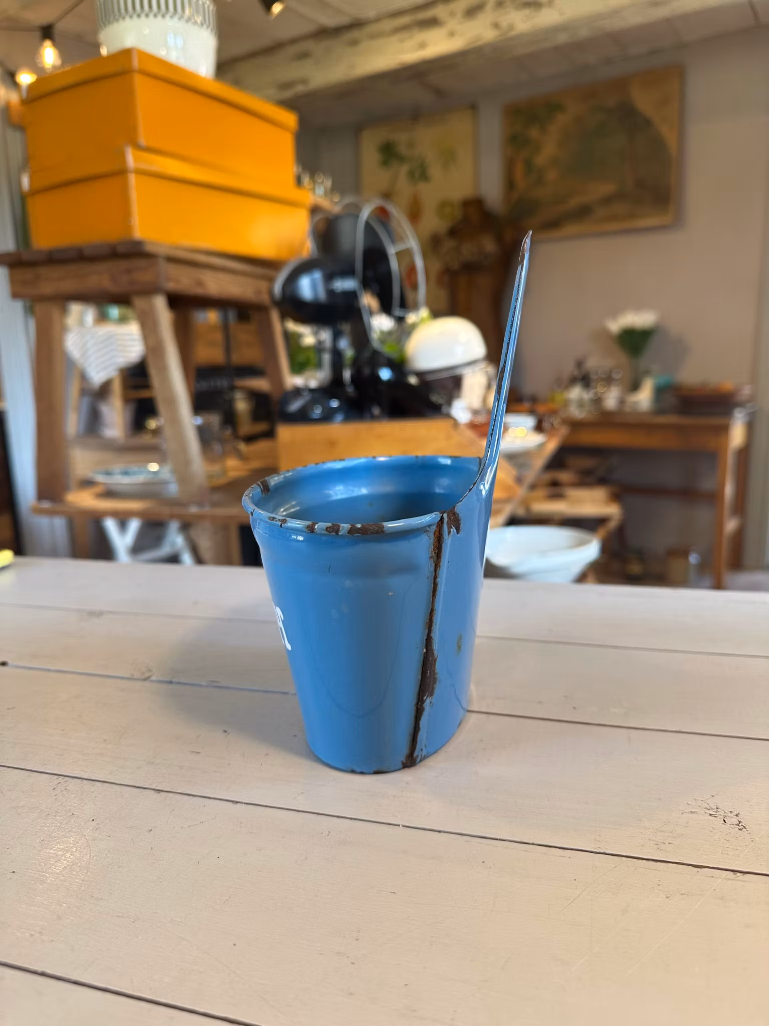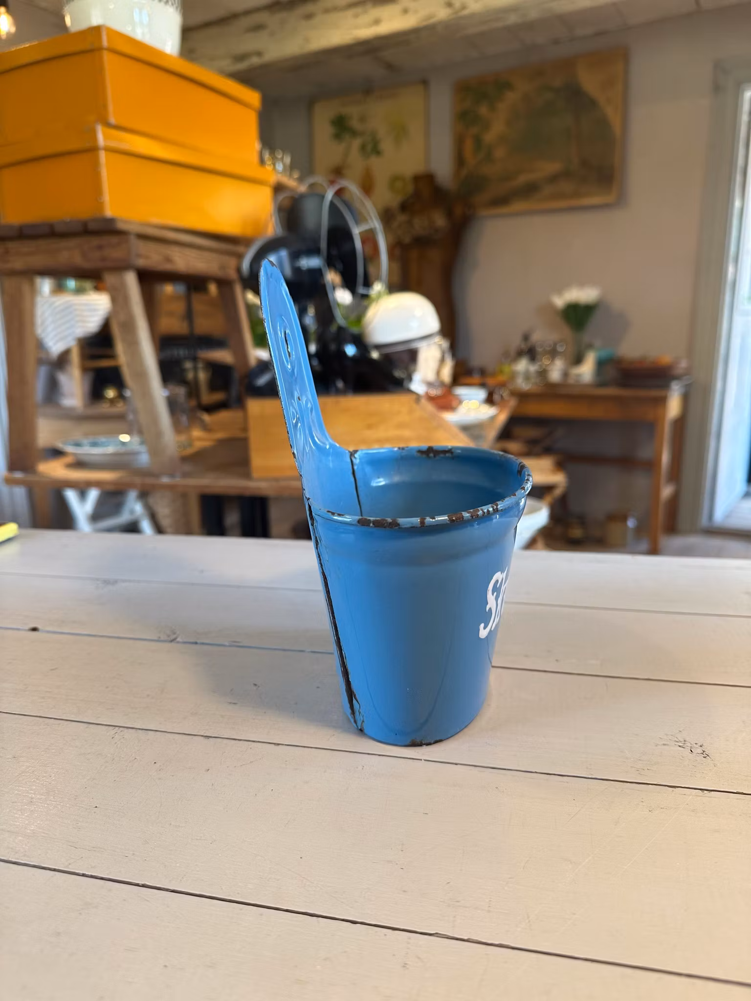 Emaljerad skeppa i blått med dansk text skurepulver.