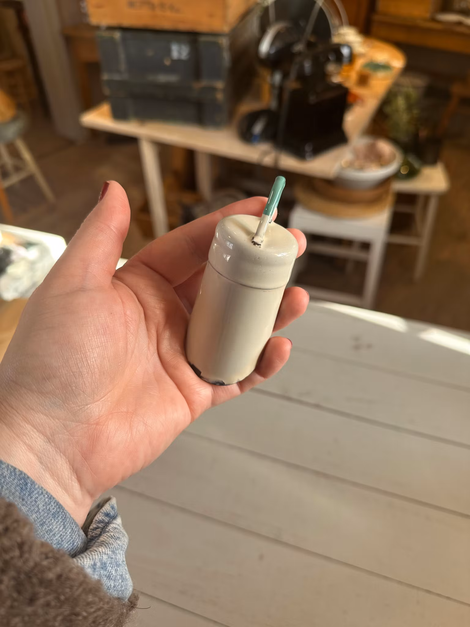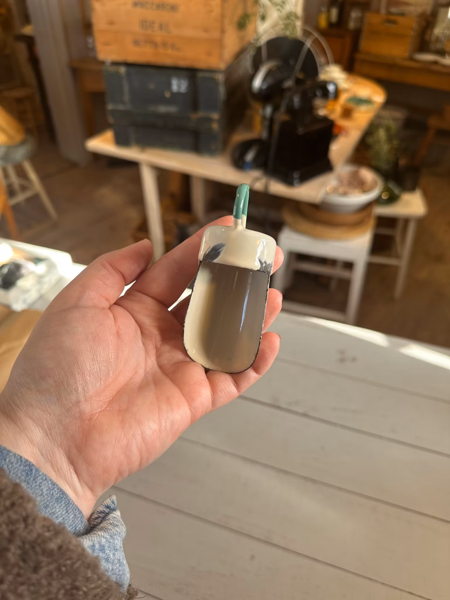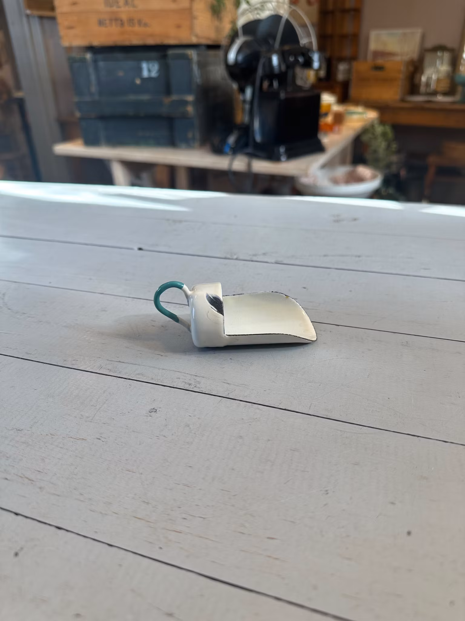 Underbar liten emaljerad skopa i ljusgult/grönt. Omärkt.