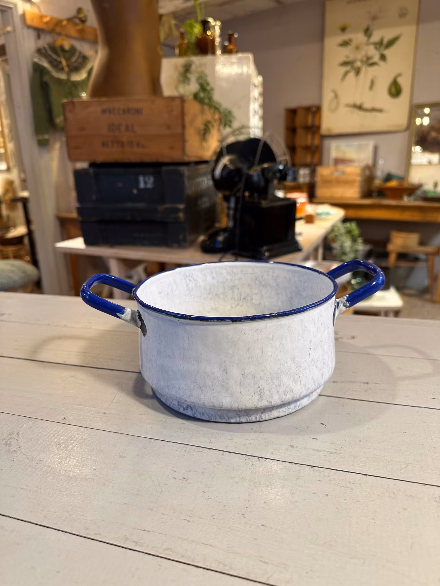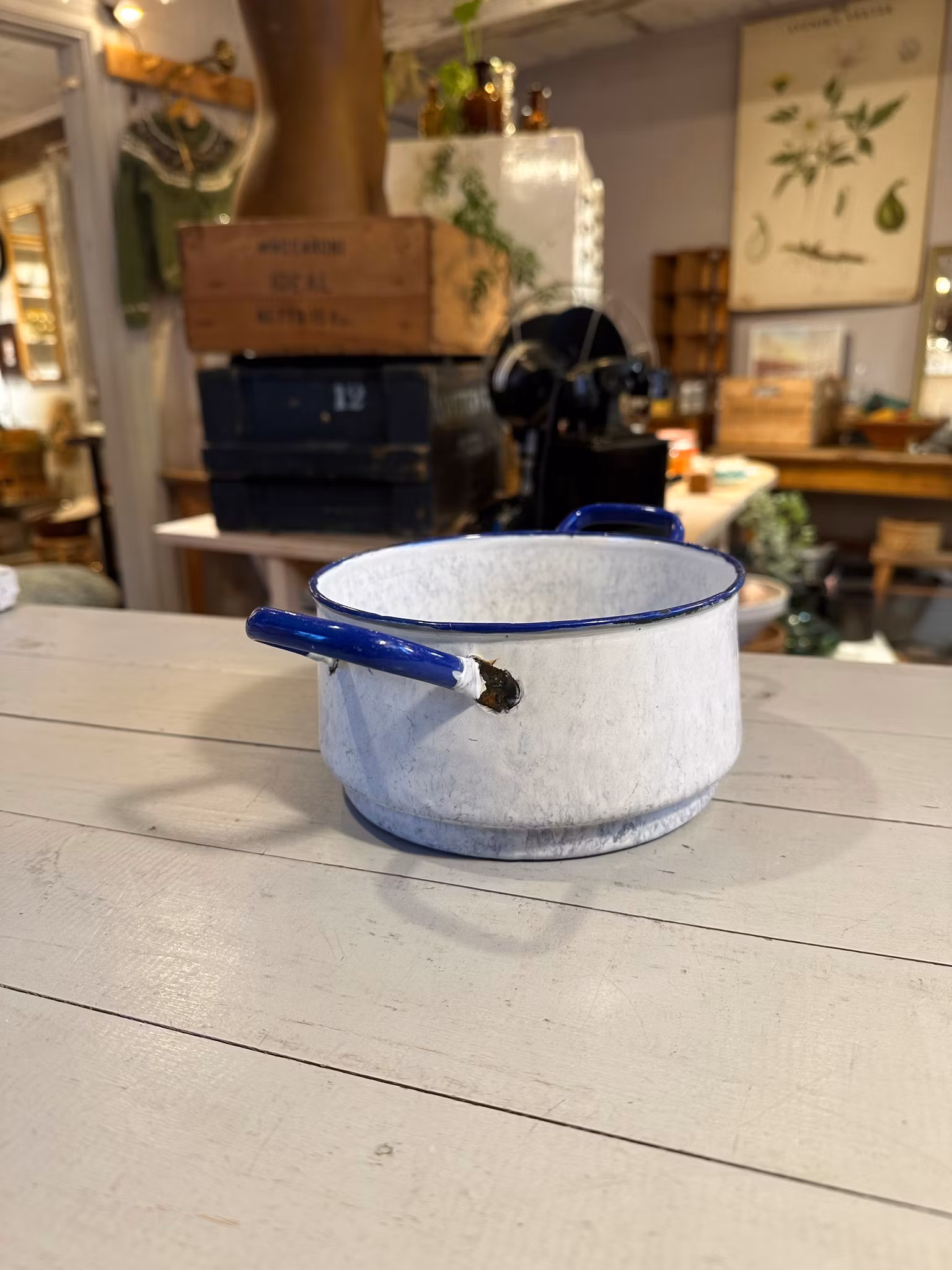 I gott använt och åldrat skick. Spår av användning och ålder finns över hela. Se bilder för skick. Har skav i emaljen runt handtagen framförallt och någon fläck finns här och där.
