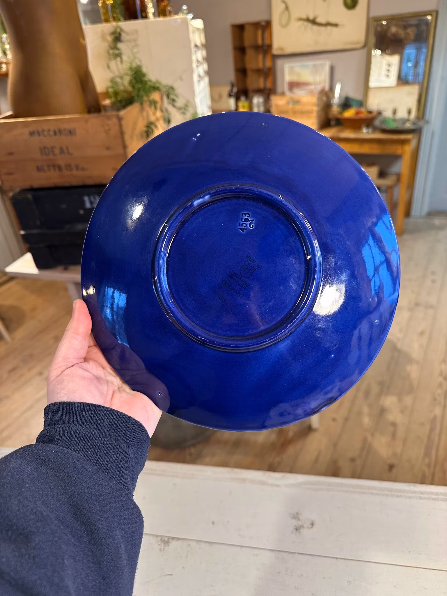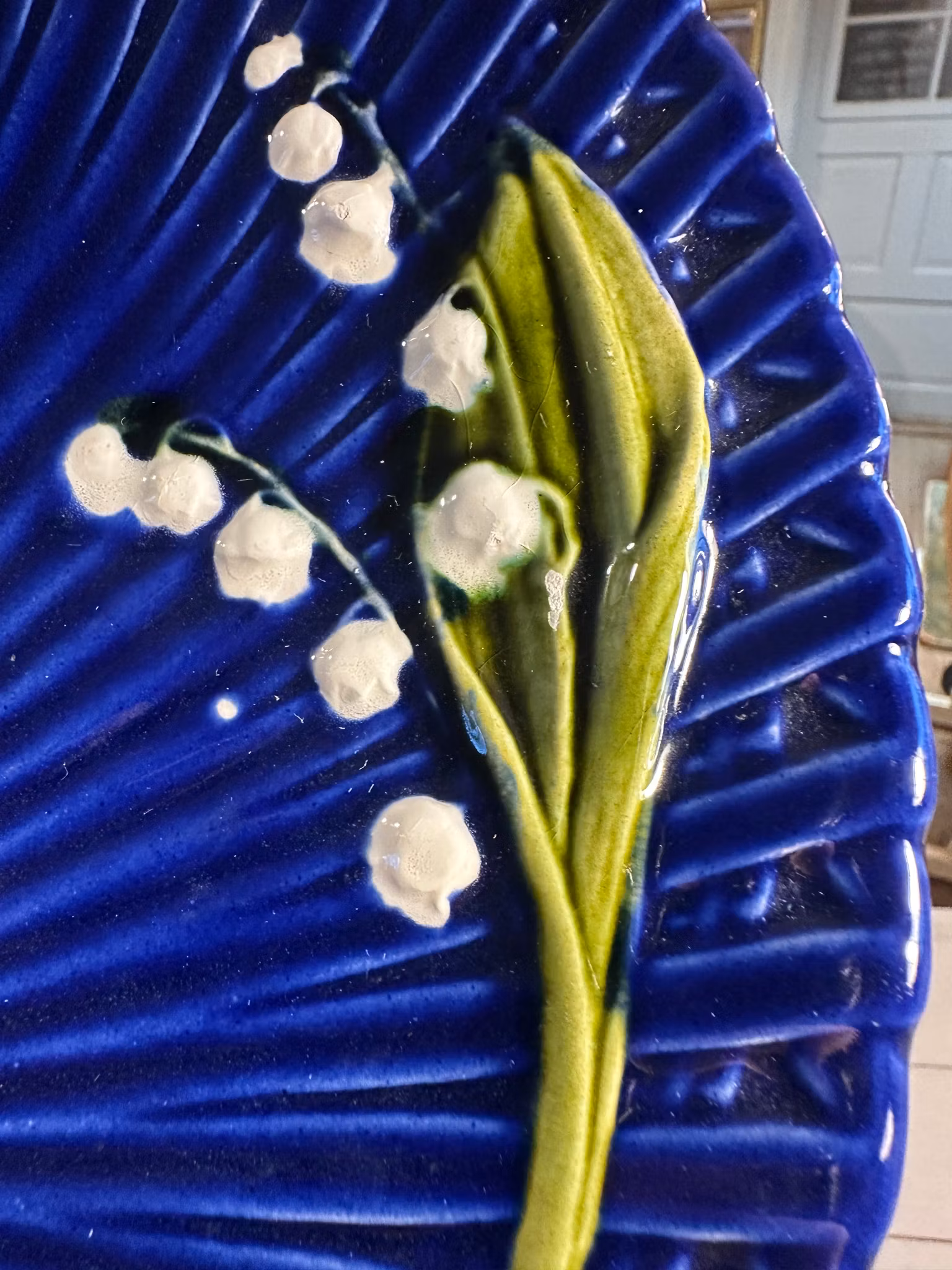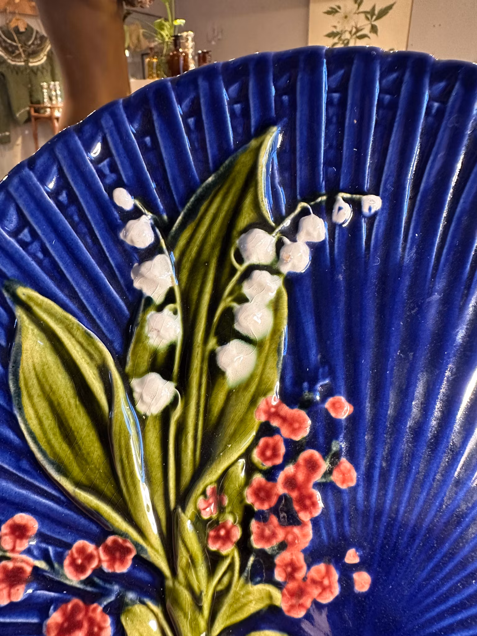 Vacker och dekorativt tyskt fat i majolika med liljekonvaljmotiv ovanpå.
