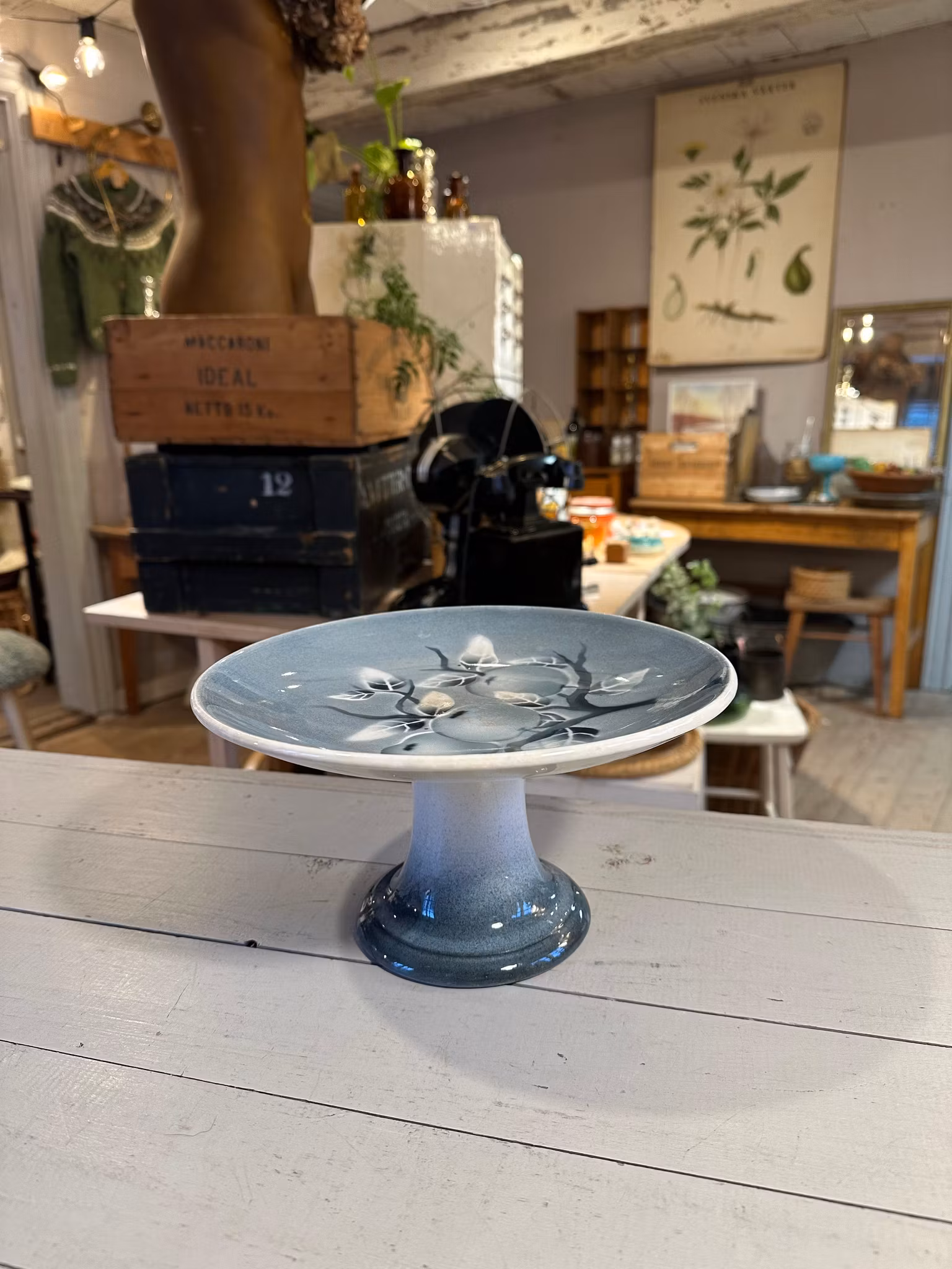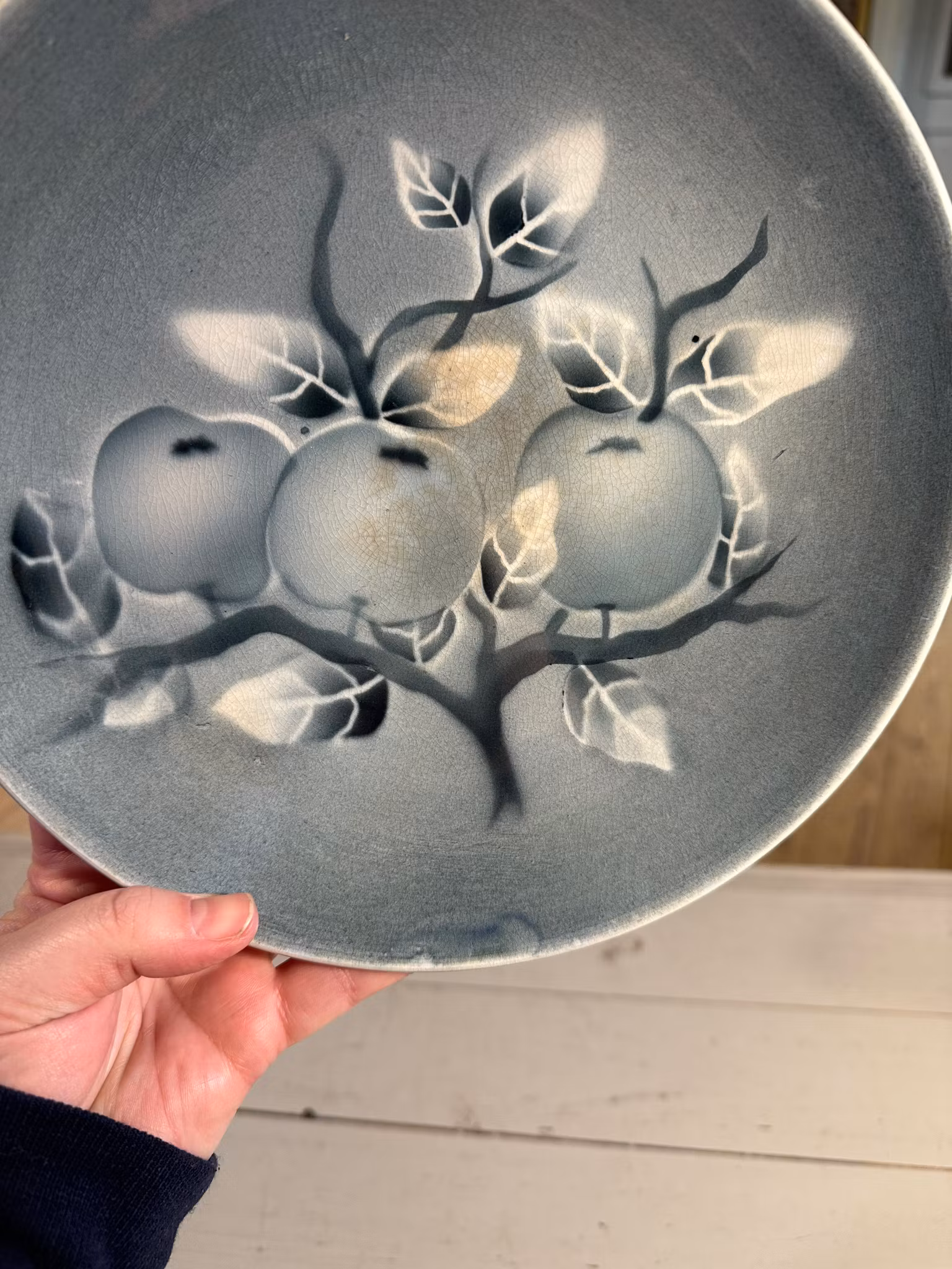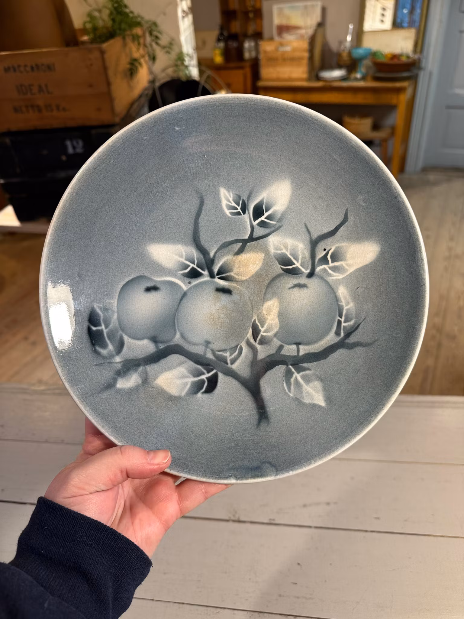 Underbart fat i porslin i vacker gråblå nyans med motiv av äpple ovanpå.