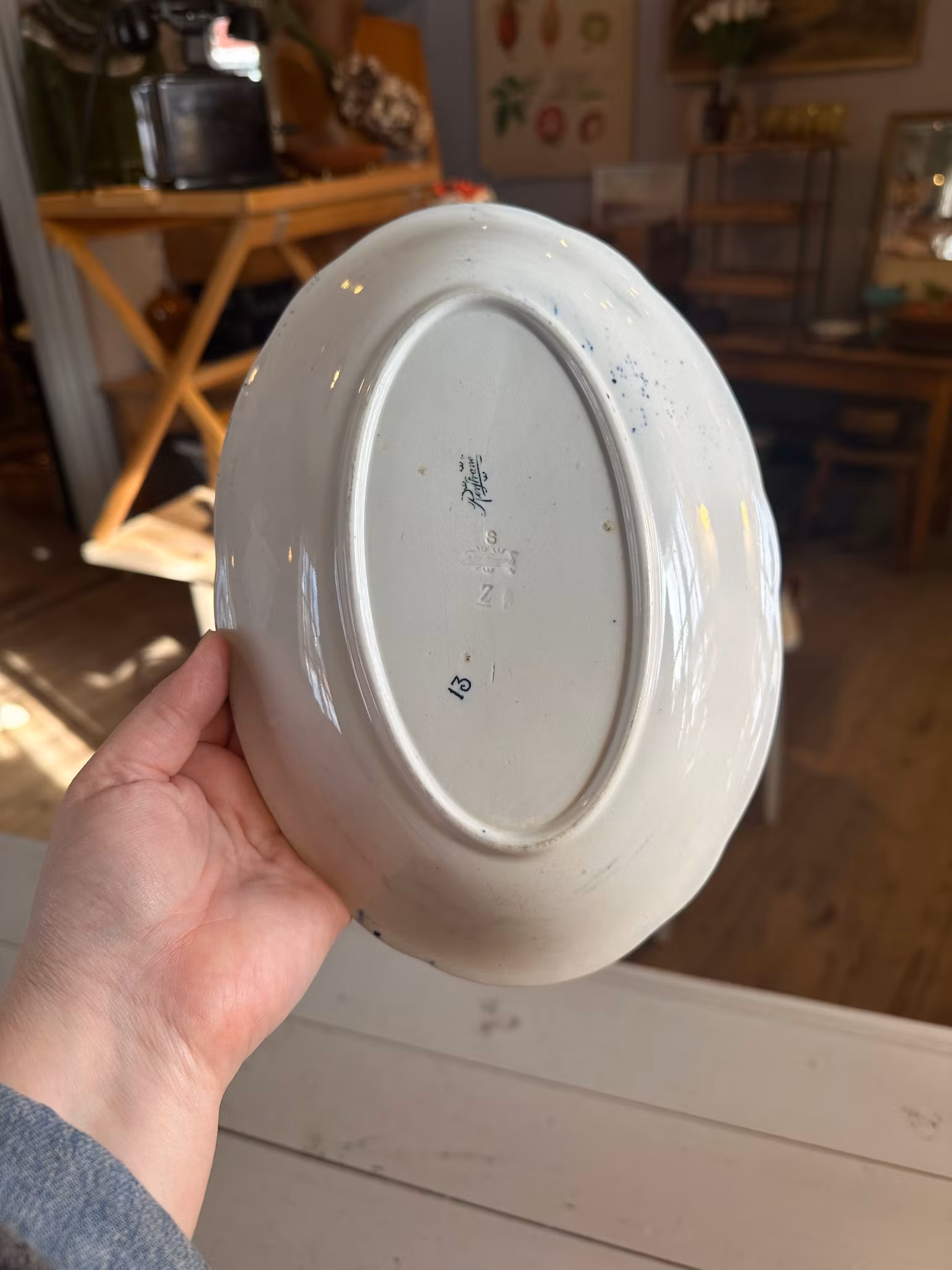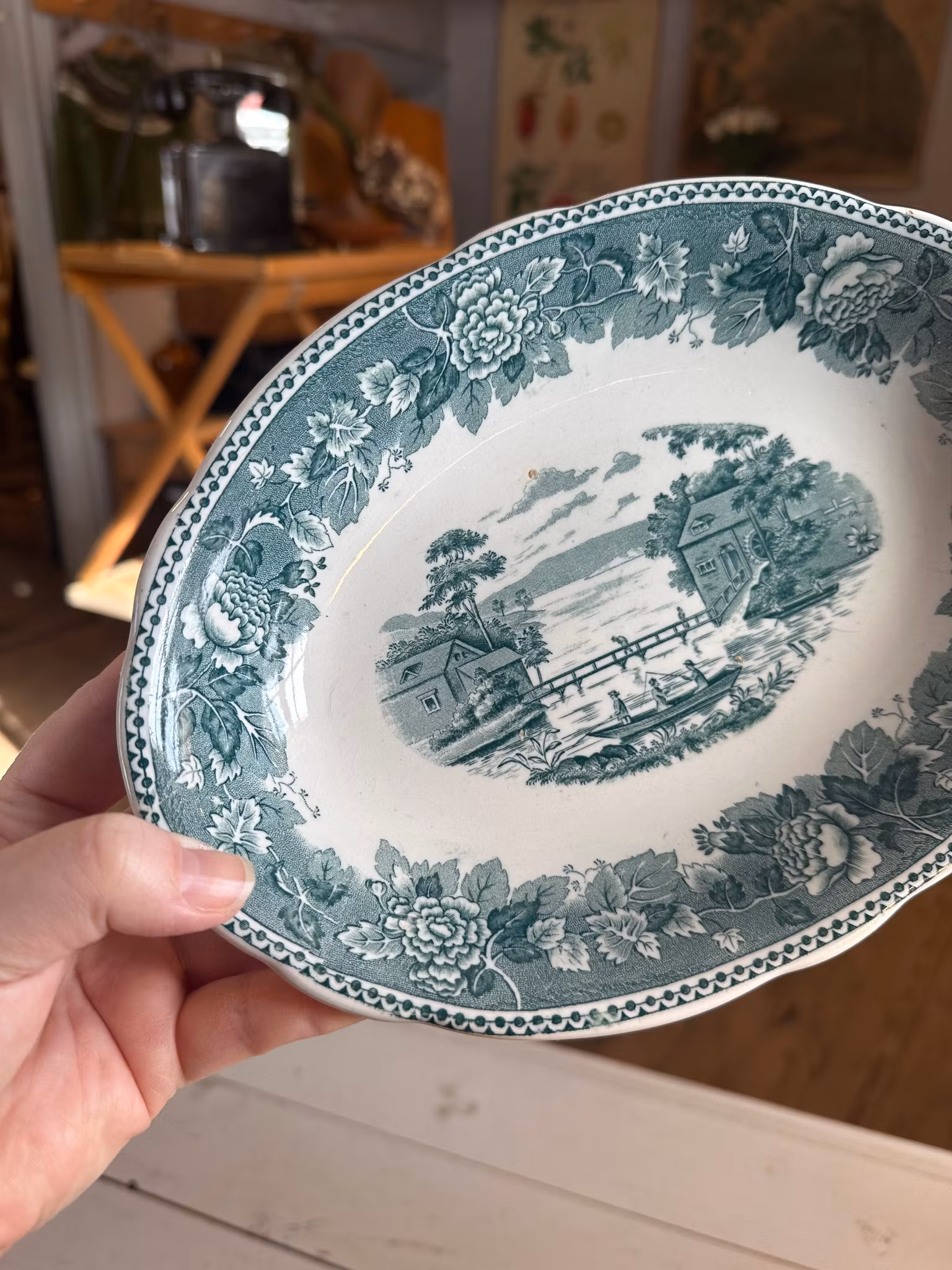 Vackert fat/skål från svenska Rörstrand med vit och grön dekor.