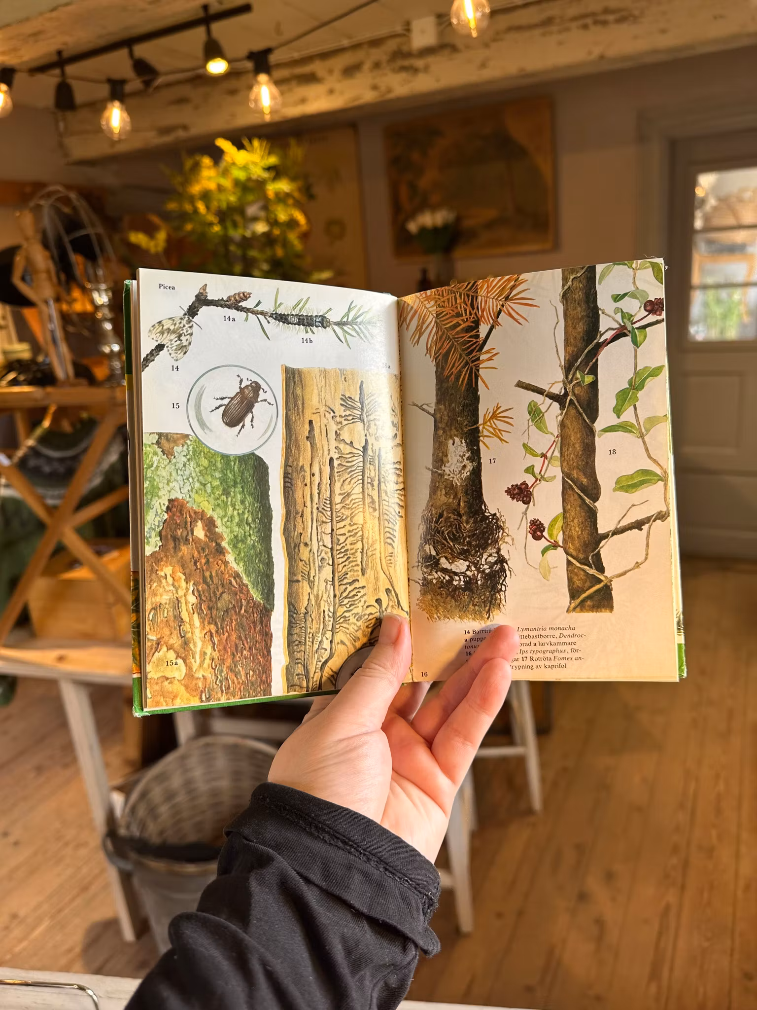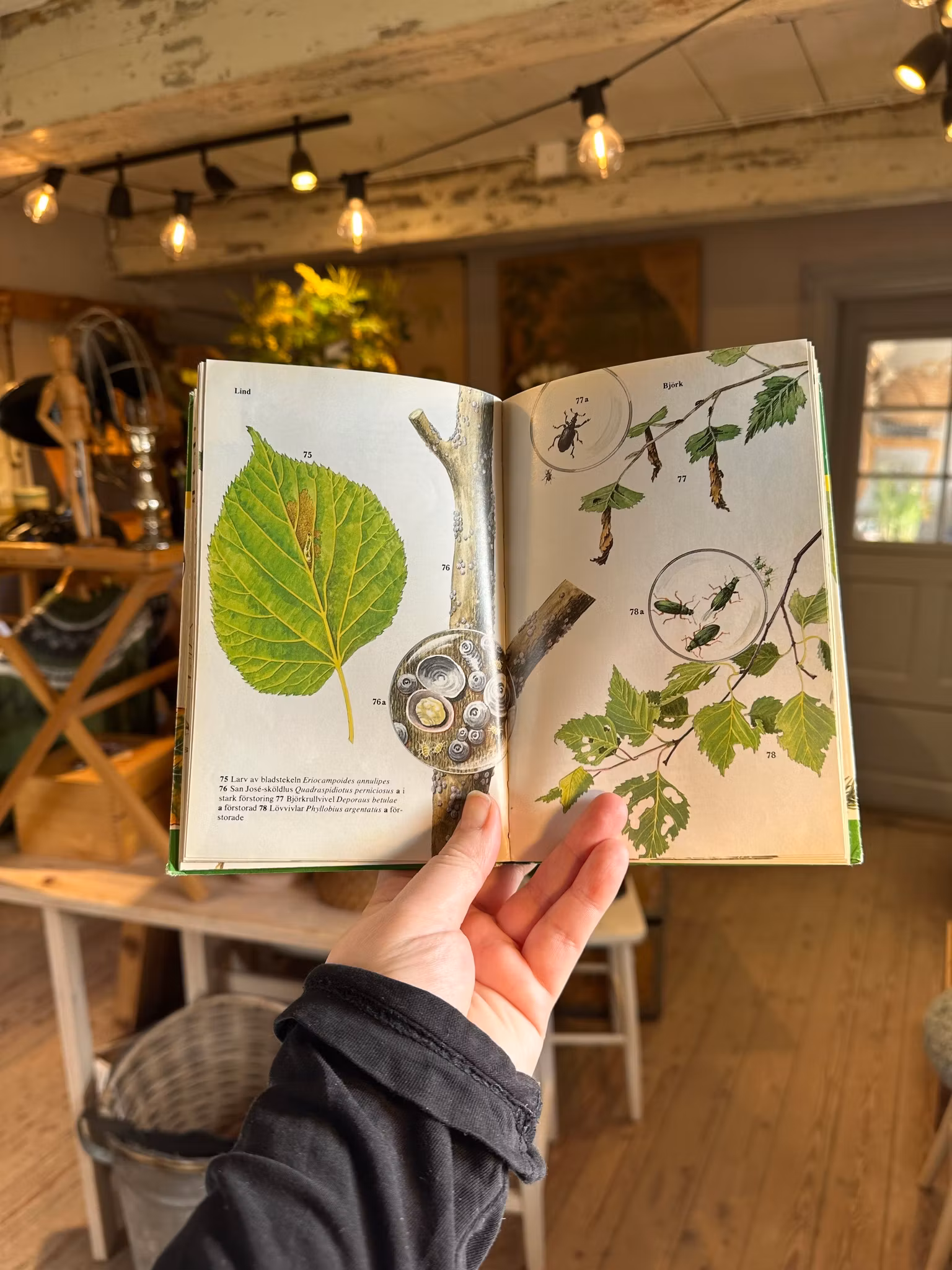 Fin gammal florabok med innehåll om ”trädgårdens fiender”. Bilder blandat med text.