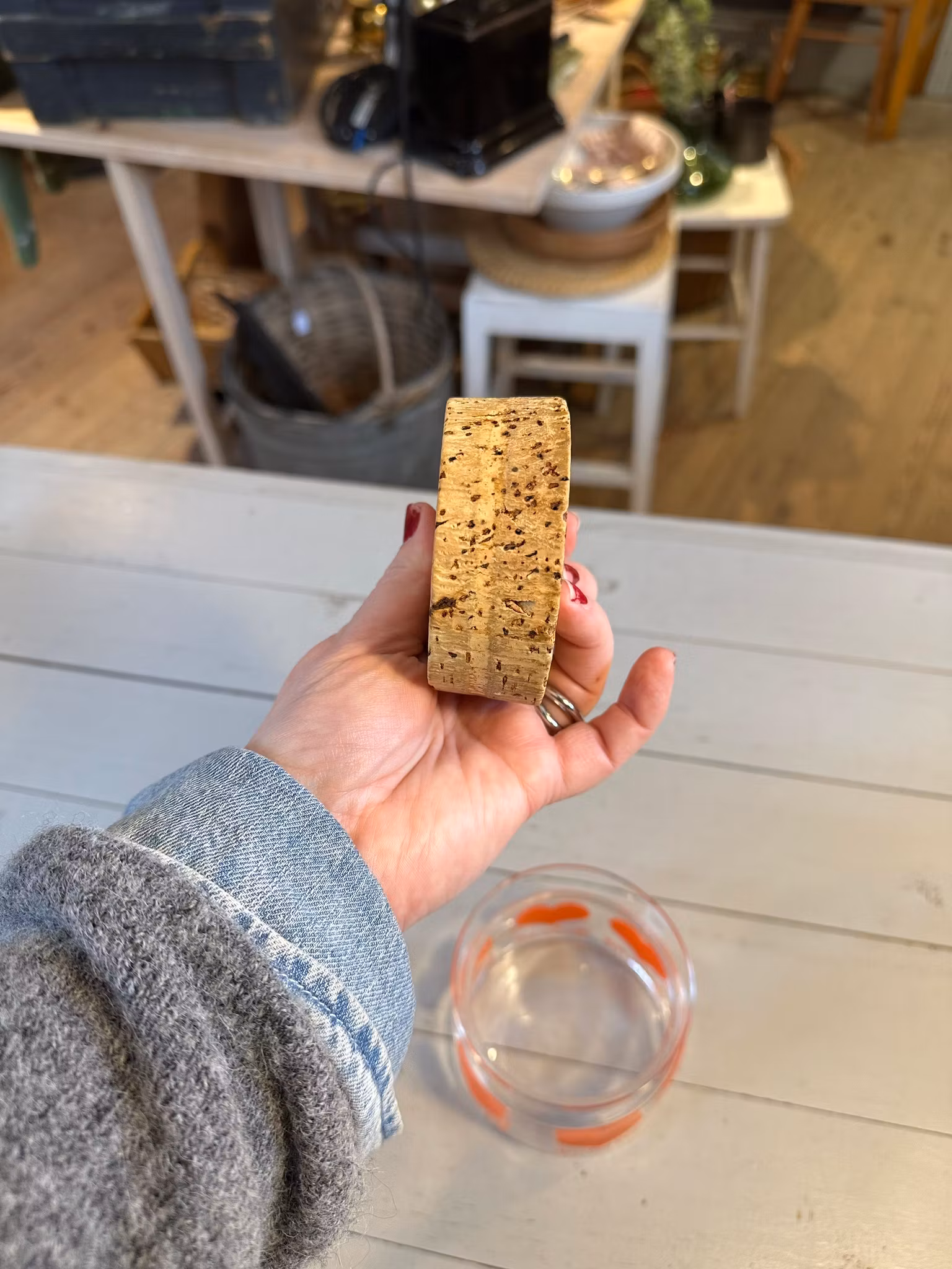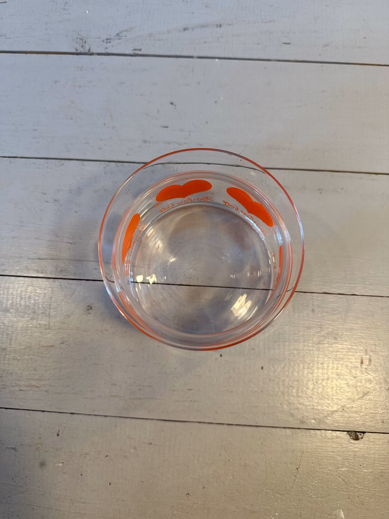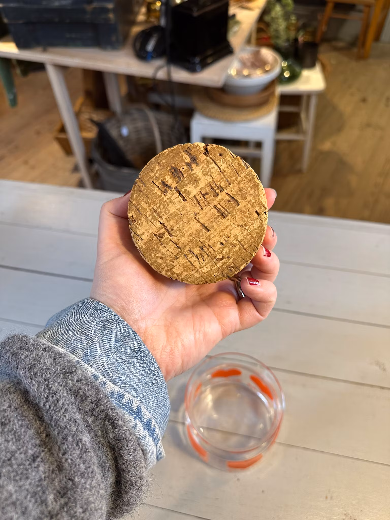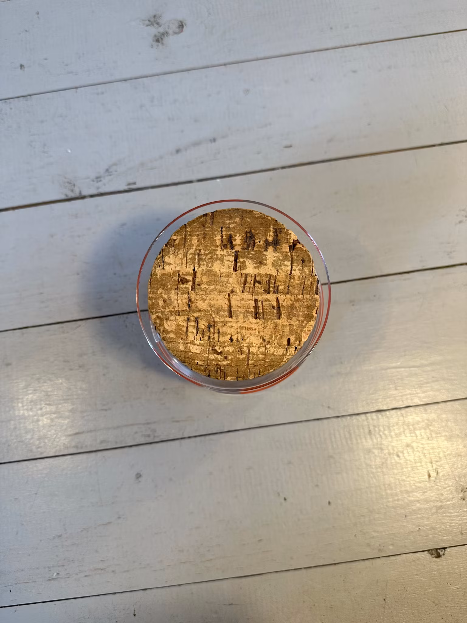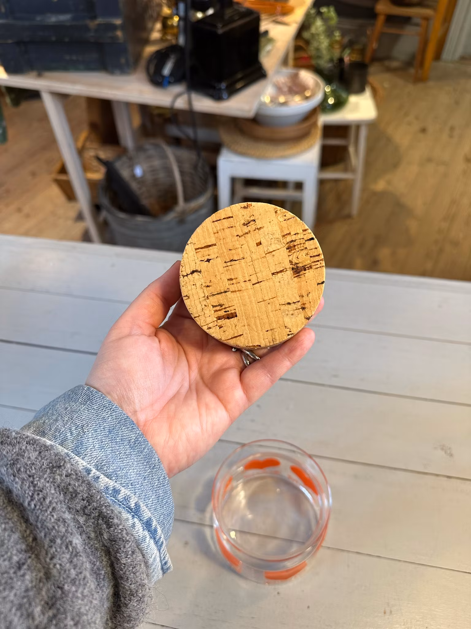 Ljuvlig liten glasburk med lock i kork från Sea Glasbruk. Text med ”hjärtans gott” på sidorna och hjärtan som dekor.
