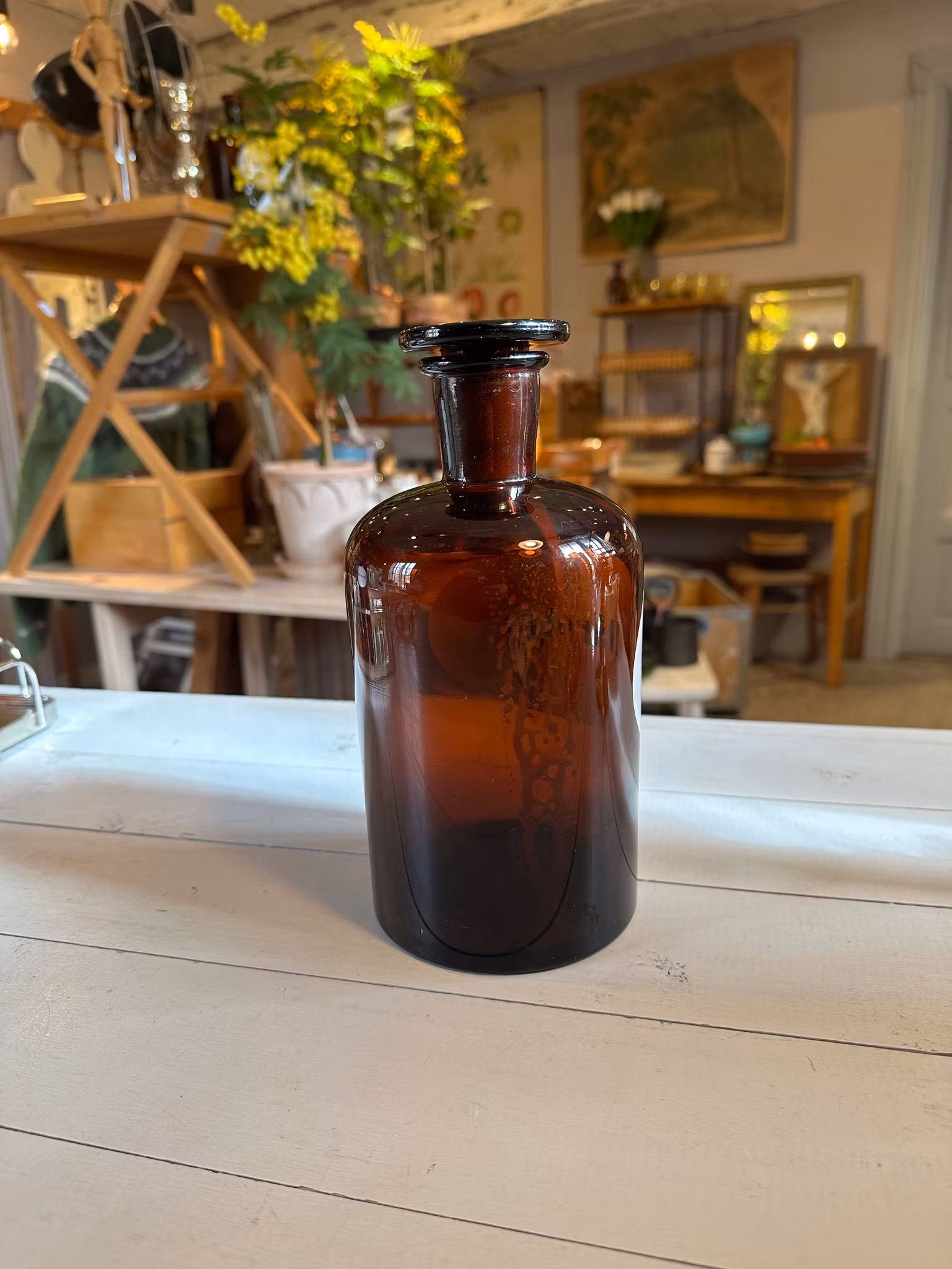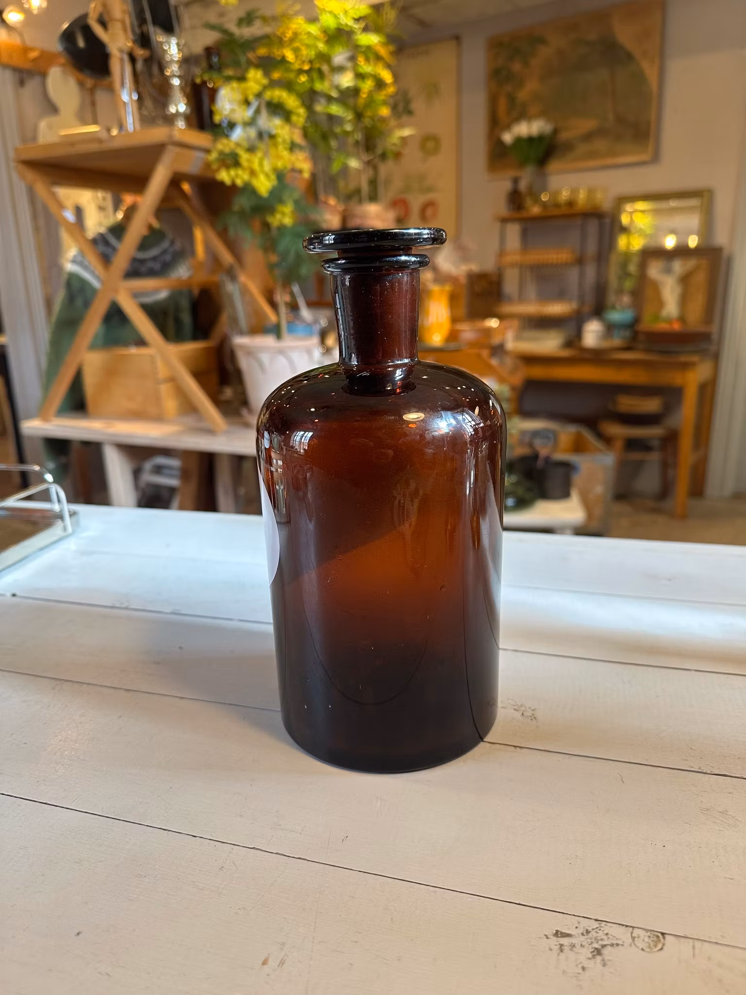 I gott använt och åldrat skick. Spår av användning finns över hela. Se bilder för skick. Doftar fortfarande av hårolja. Rengjord men har fortfarande rester av både doft och olja/rengöring inuti. Korken har några avslag inuti. Se bilder.