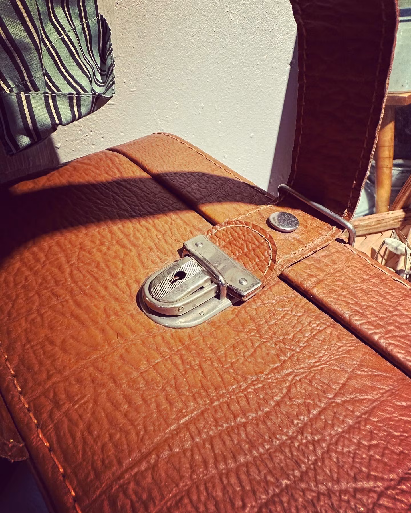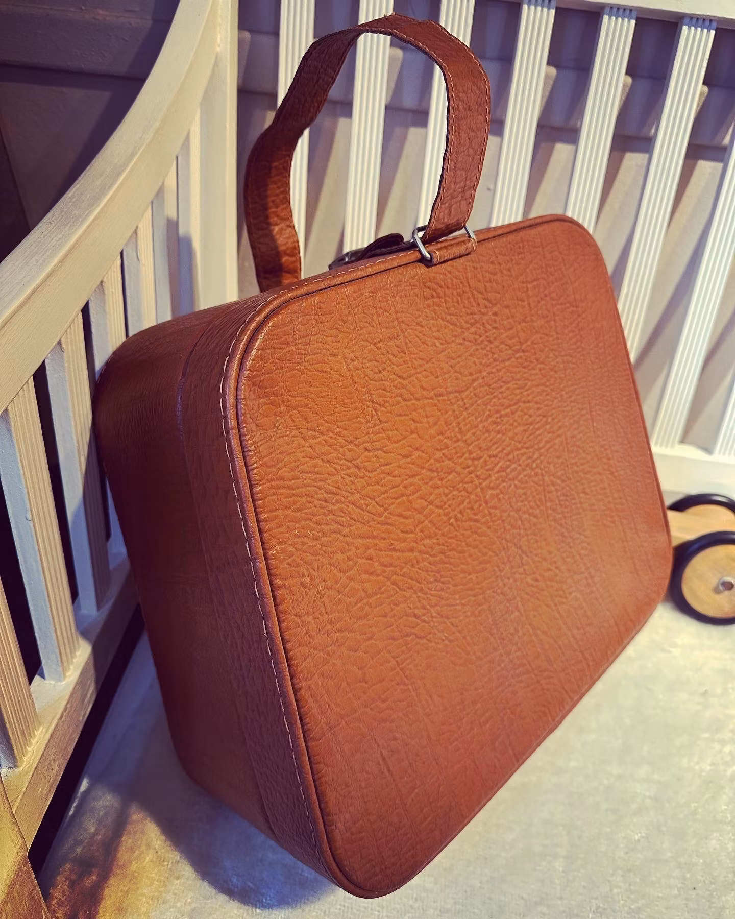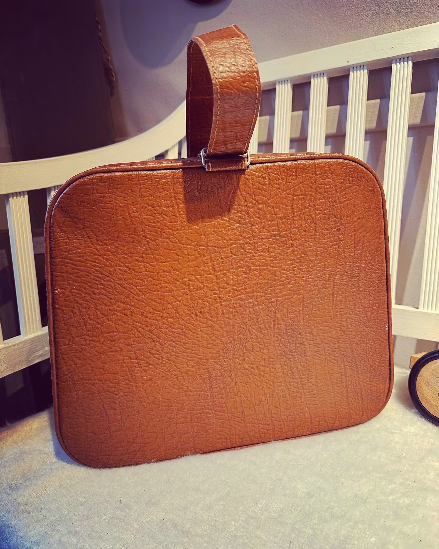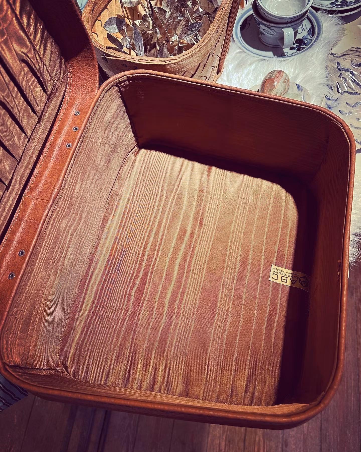 Välbevarad gammal hattask i brunt med lite ljusare brunt innerfoder. Innerficka i locket med resår för småprylar. Kantig i modellen med rundade hörn och lite smalare upptill än nedtill. Gjord av ABC Fabrikerna i Kungälv.