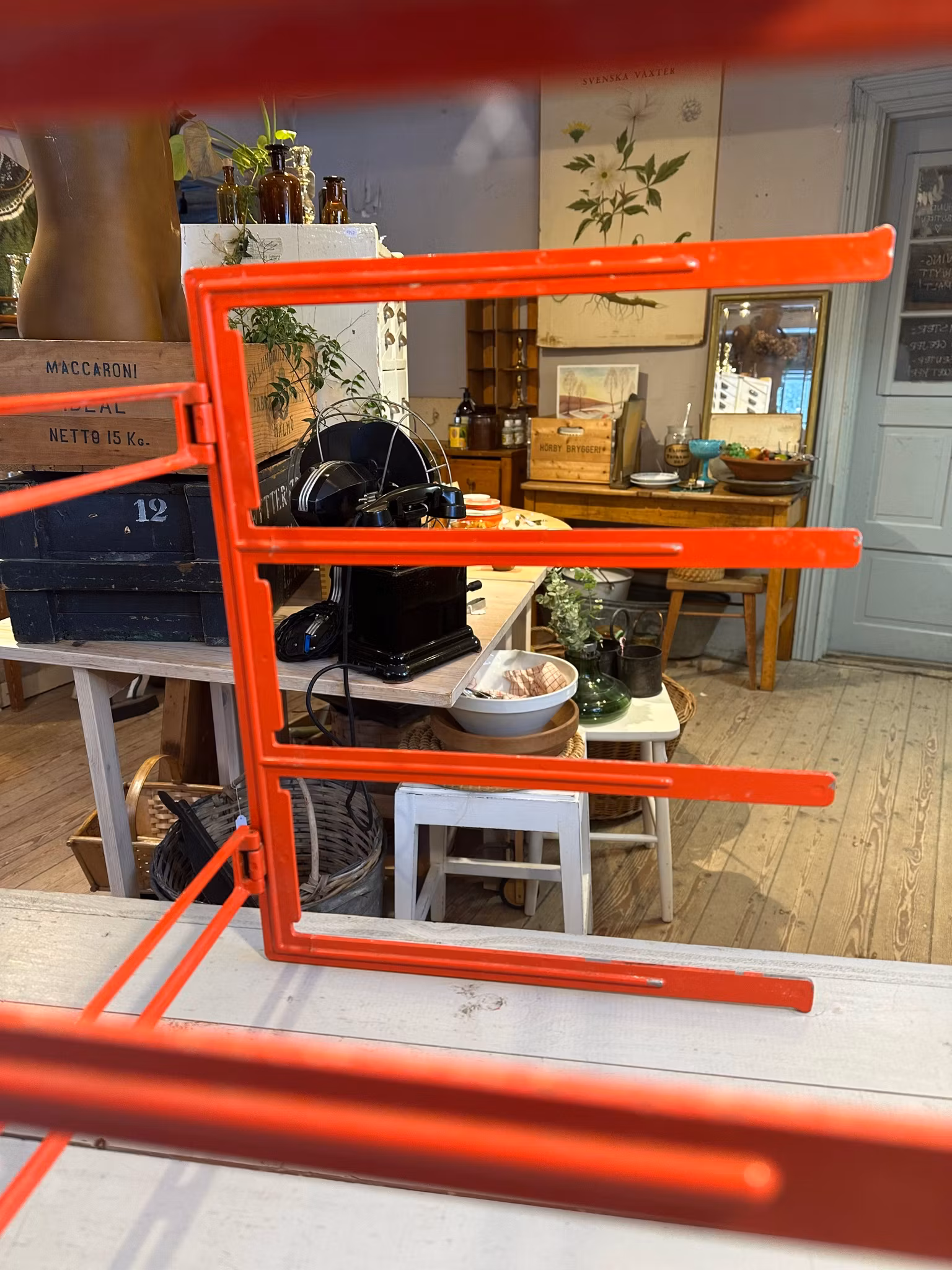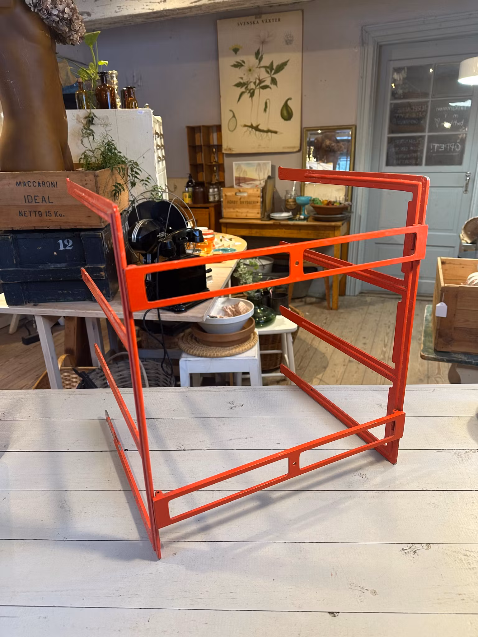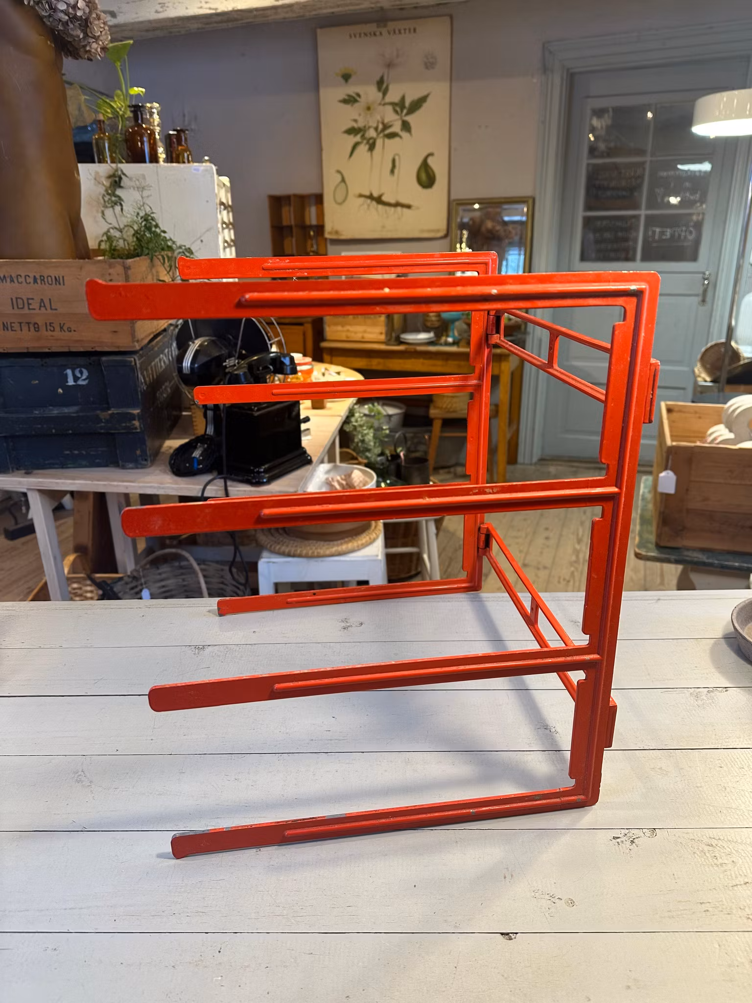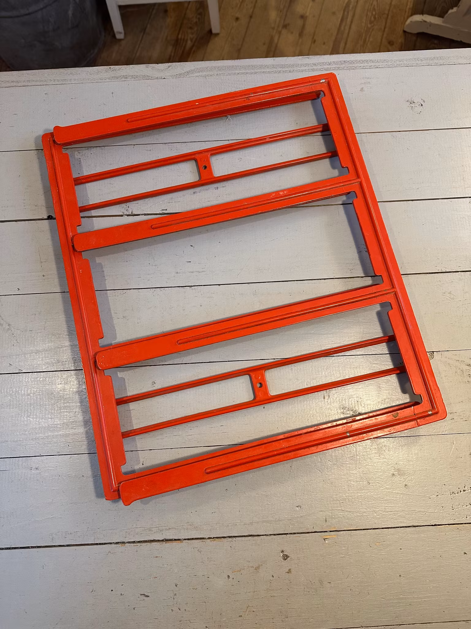 Ihopvikbart ställ för plåtar eller liknande. Orangerött i färgen.