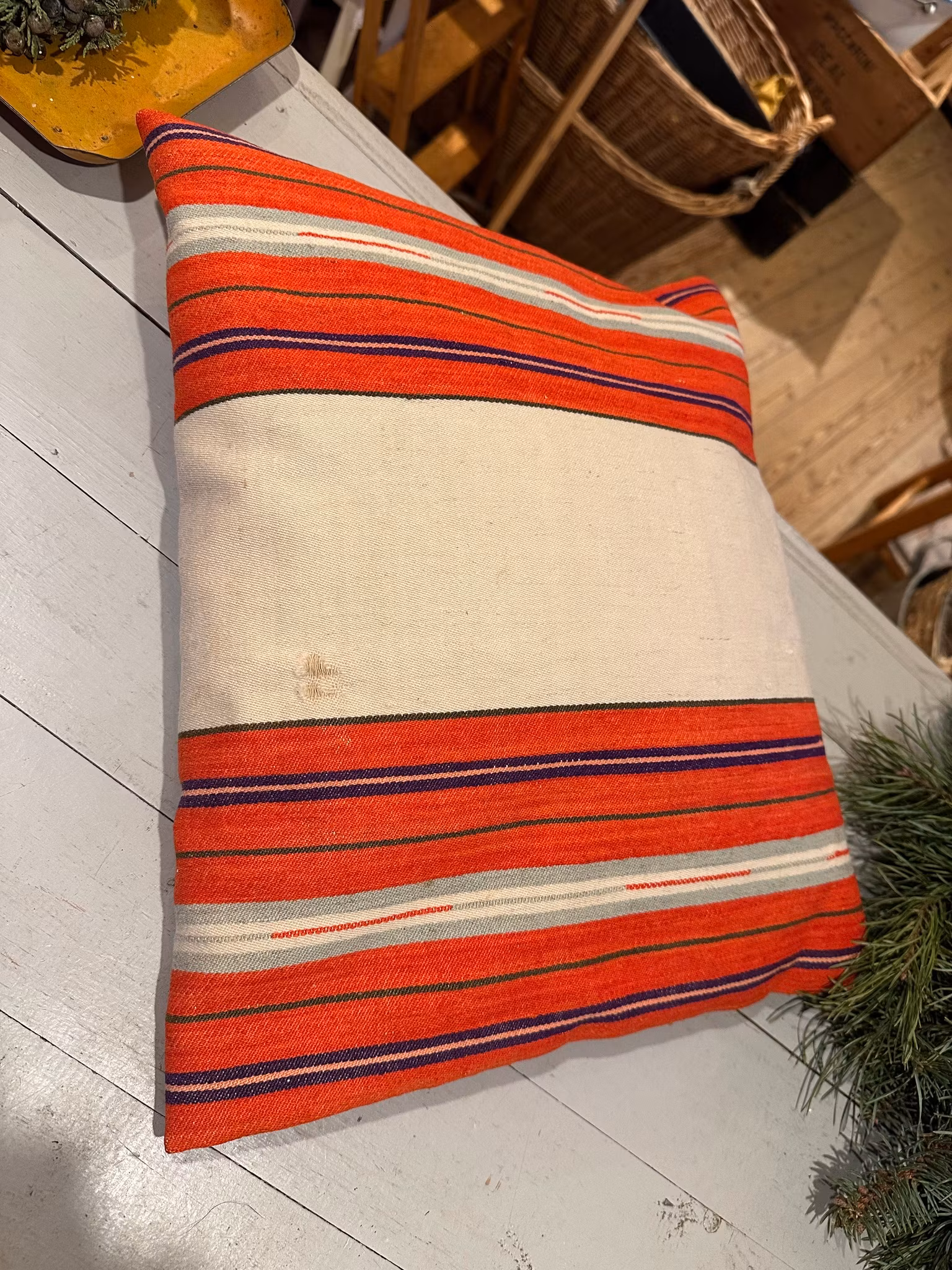 Söt liten bolsterkudde. I gott använt och åldrat skick. Spår av användning/ålder finns över hela. Se bilder för skick. Slitage finns, ett ställe med tun