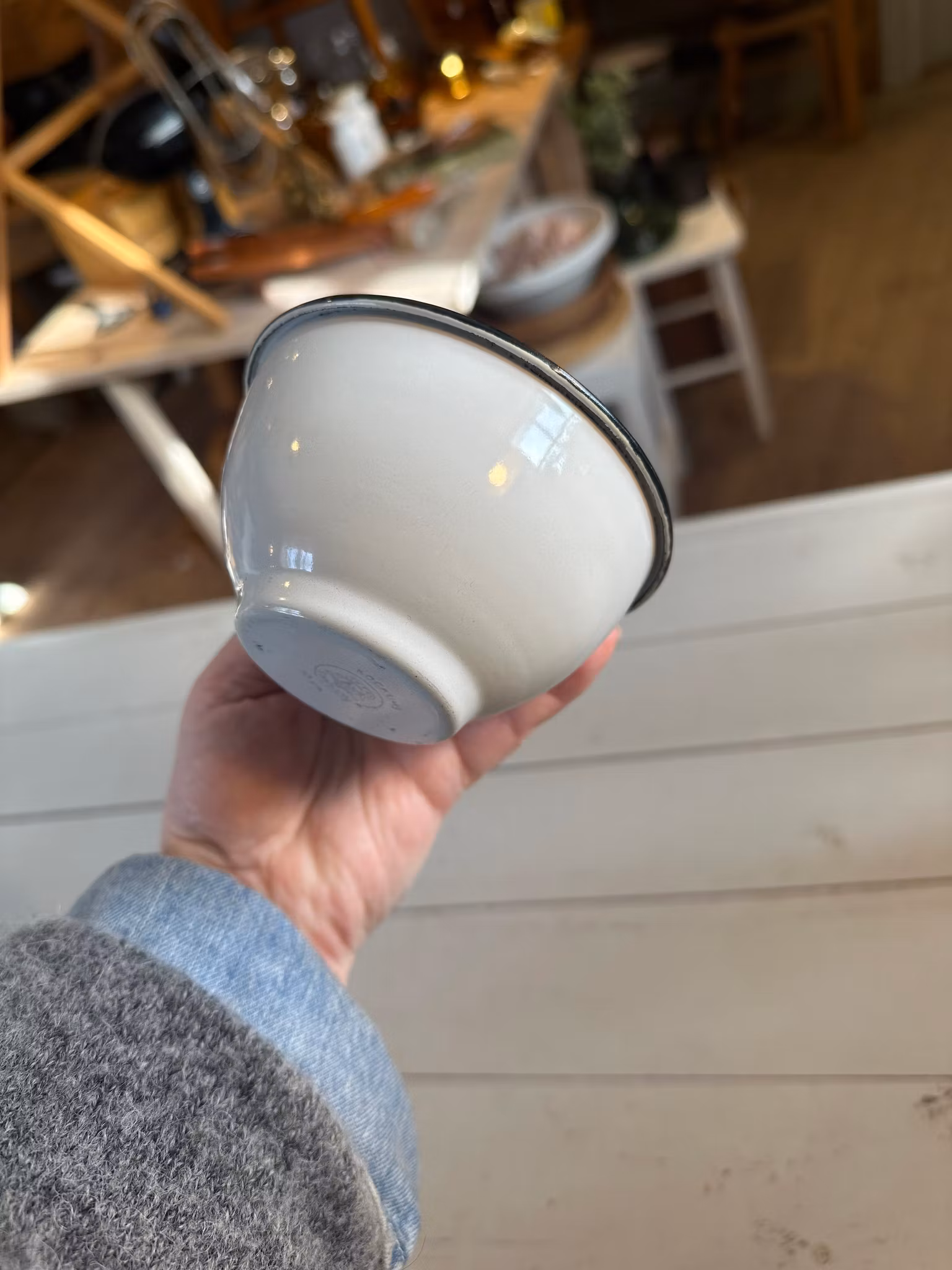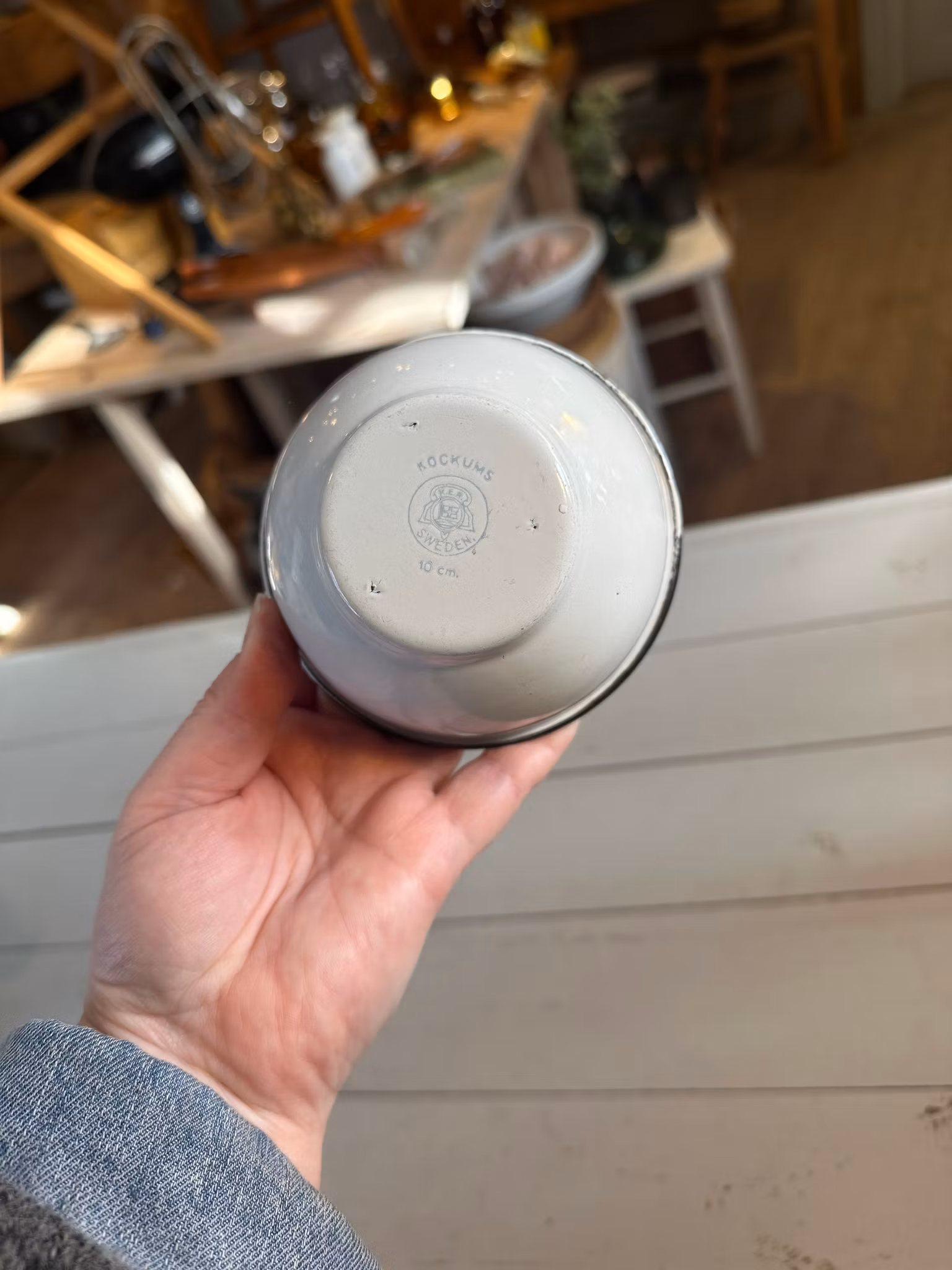 Söt liten emaljerad skål i vitt med svart kant ifrån svenska Kockums.