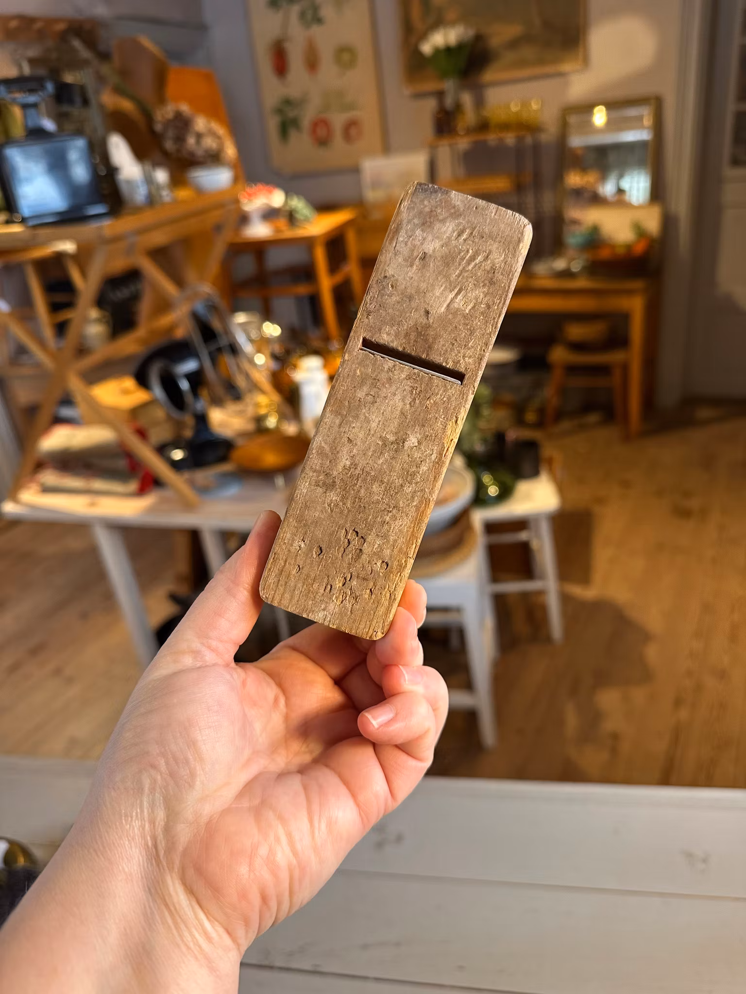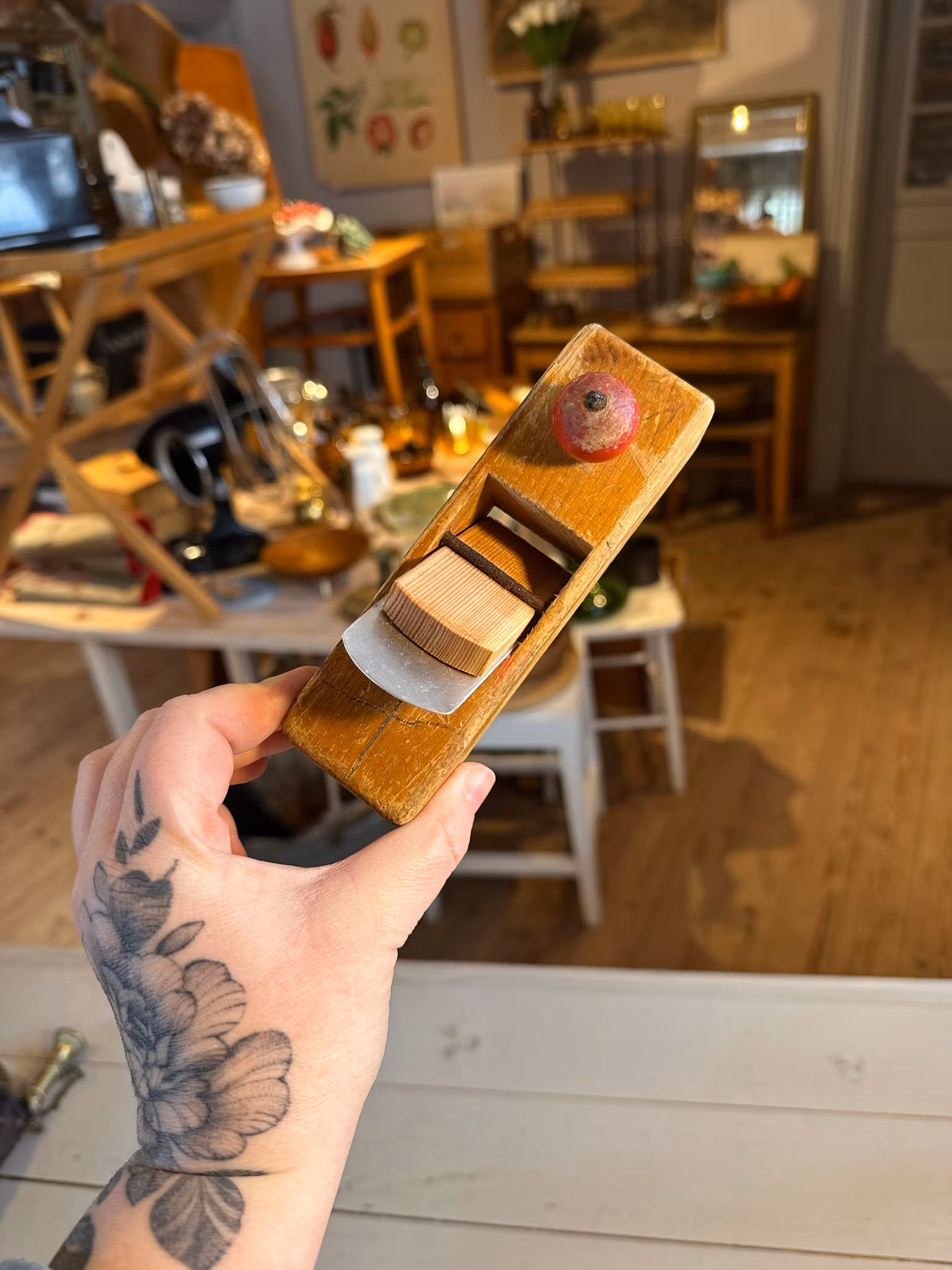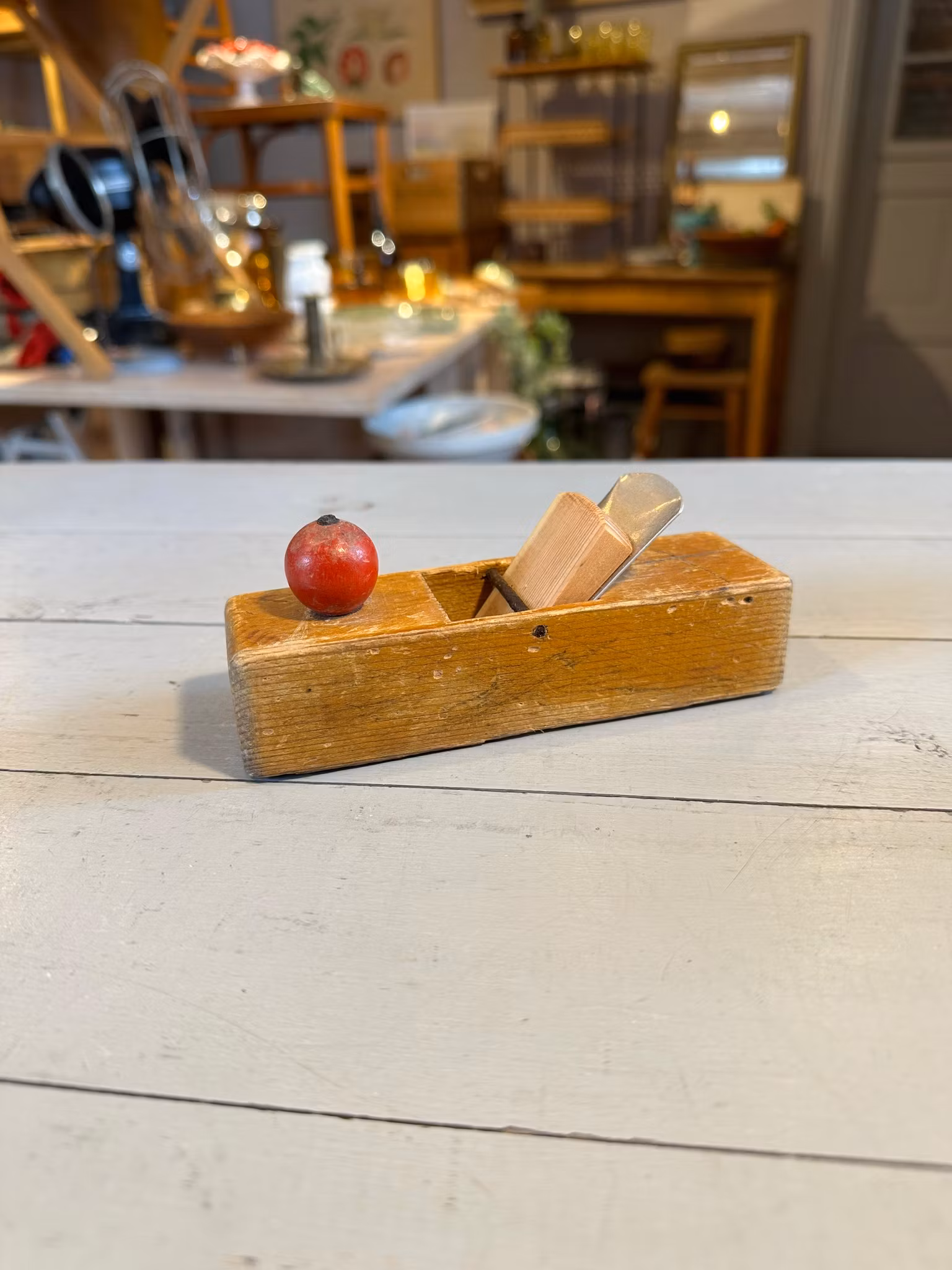 Söt liten leksakshyvel i trä och metall. I gott använt och åldrat skick. Spår av användning och ålder över hela. Se bilder för skick. Mått ca 14*4,5*6cm