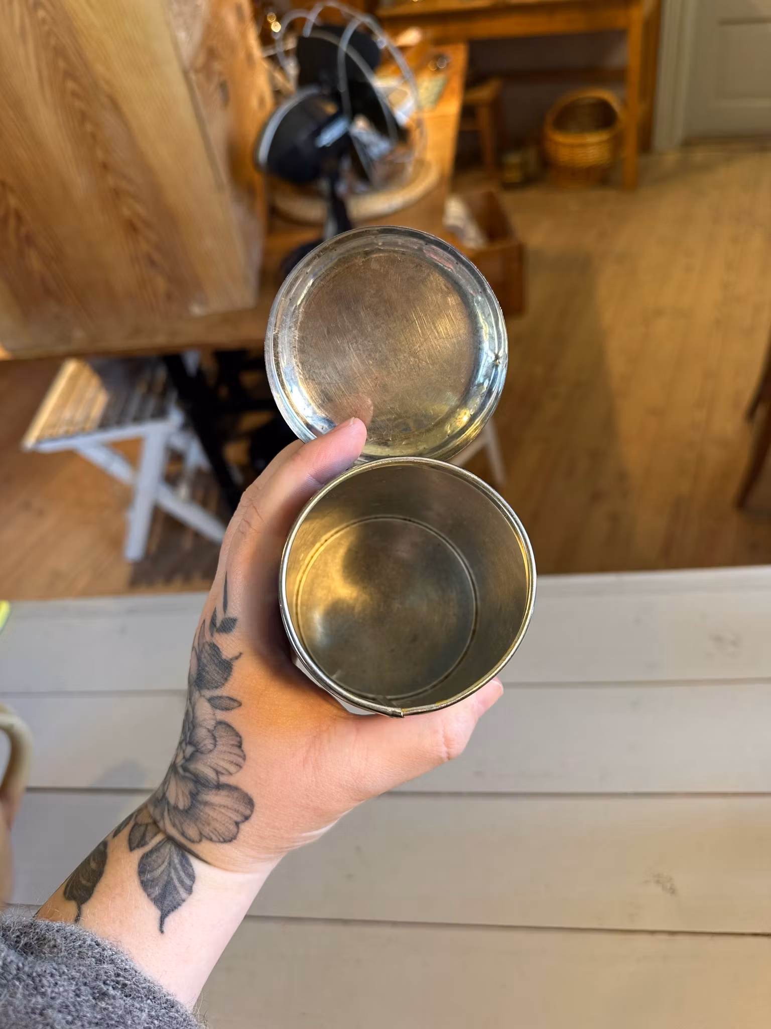I gott använt och åldrat skick. Spår av användning finns över hela. Se bilder för skick. Slitage och småskavanker finns. Någon liten buckla finns.