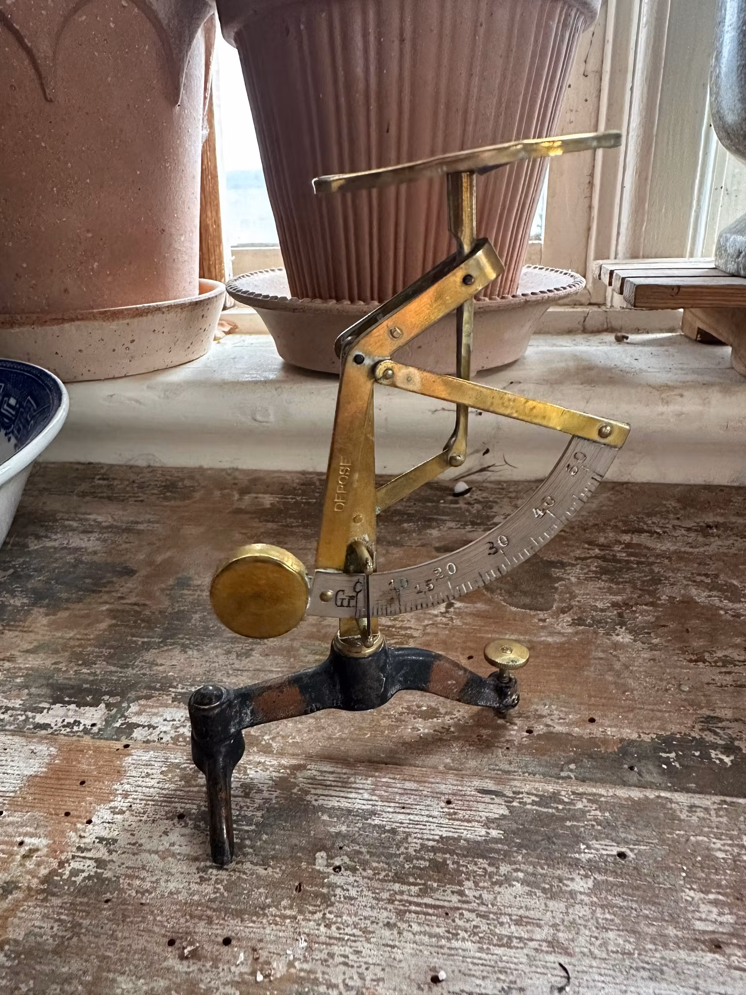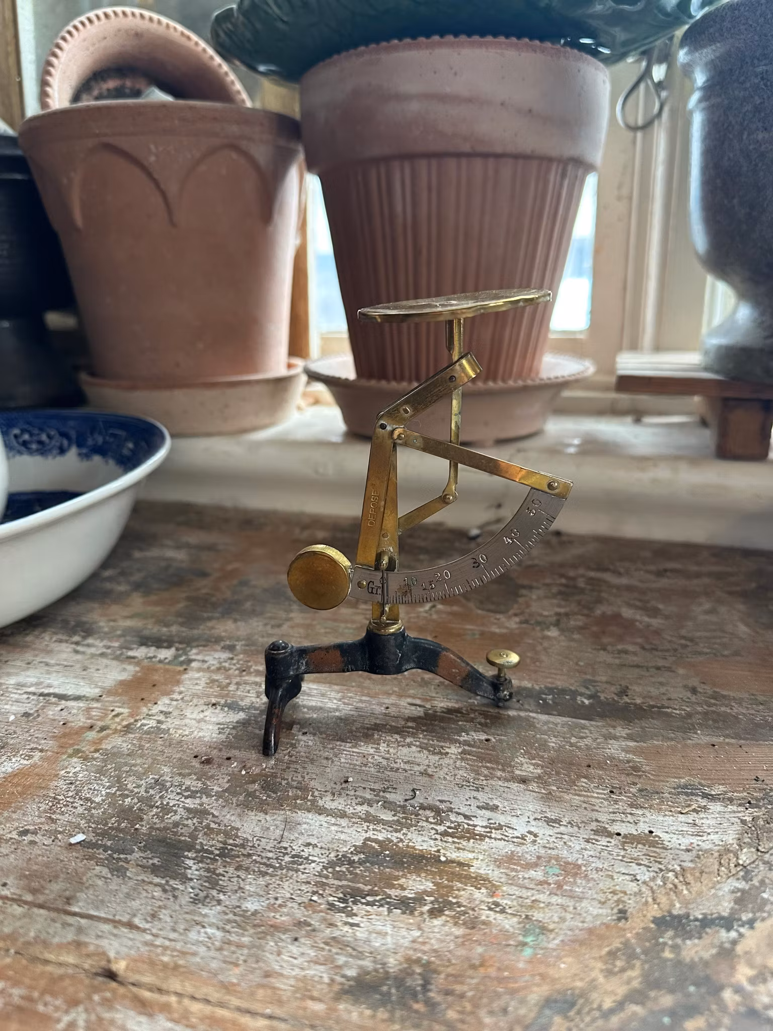 Charmig liten mini-våg i metall med detaljer i mässing.