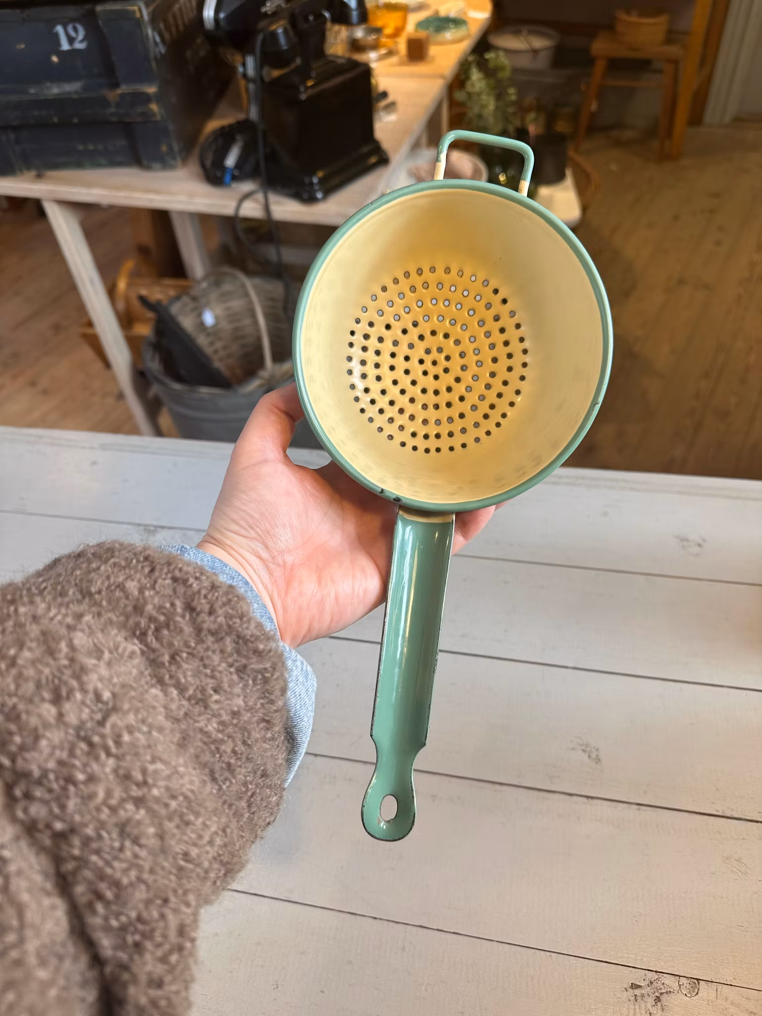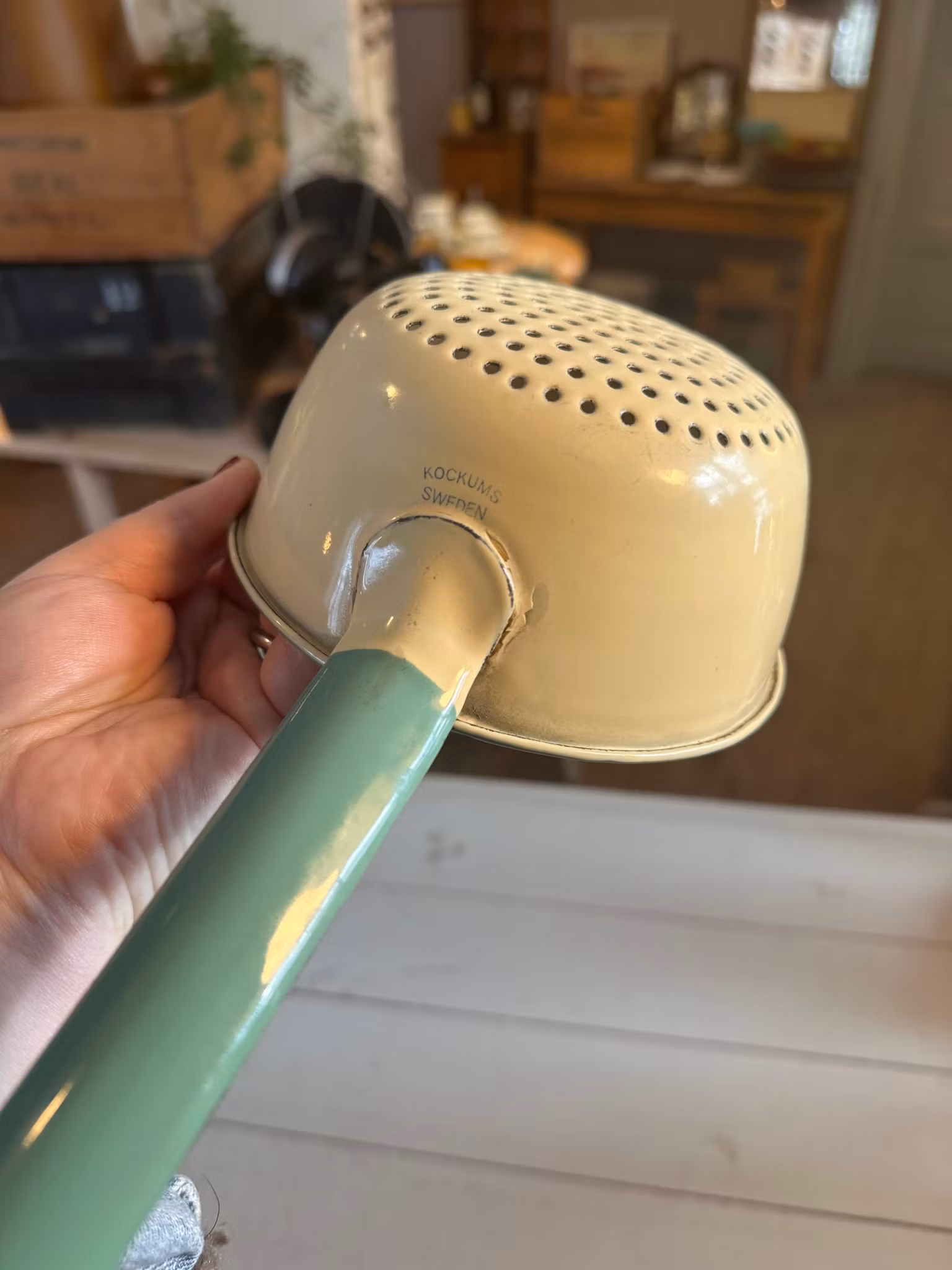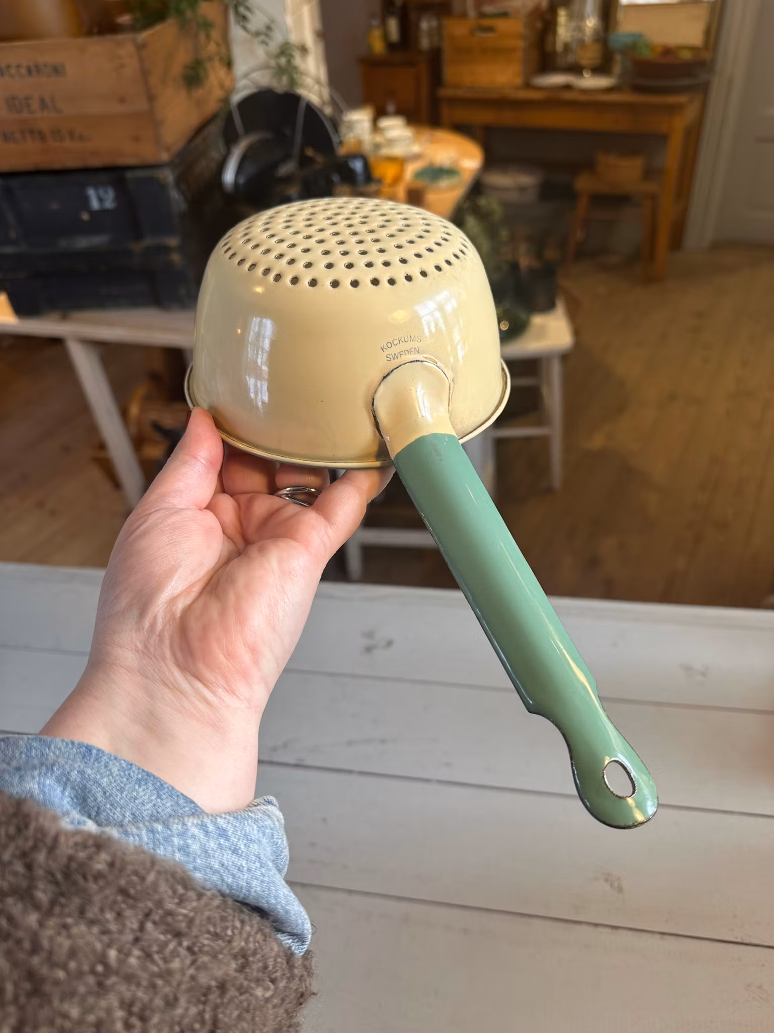 Fint emaljerat gammalt durkslag ifrån svenska Kockums. I klassiska gula med grön kant. Mindre modell av durkslag.
