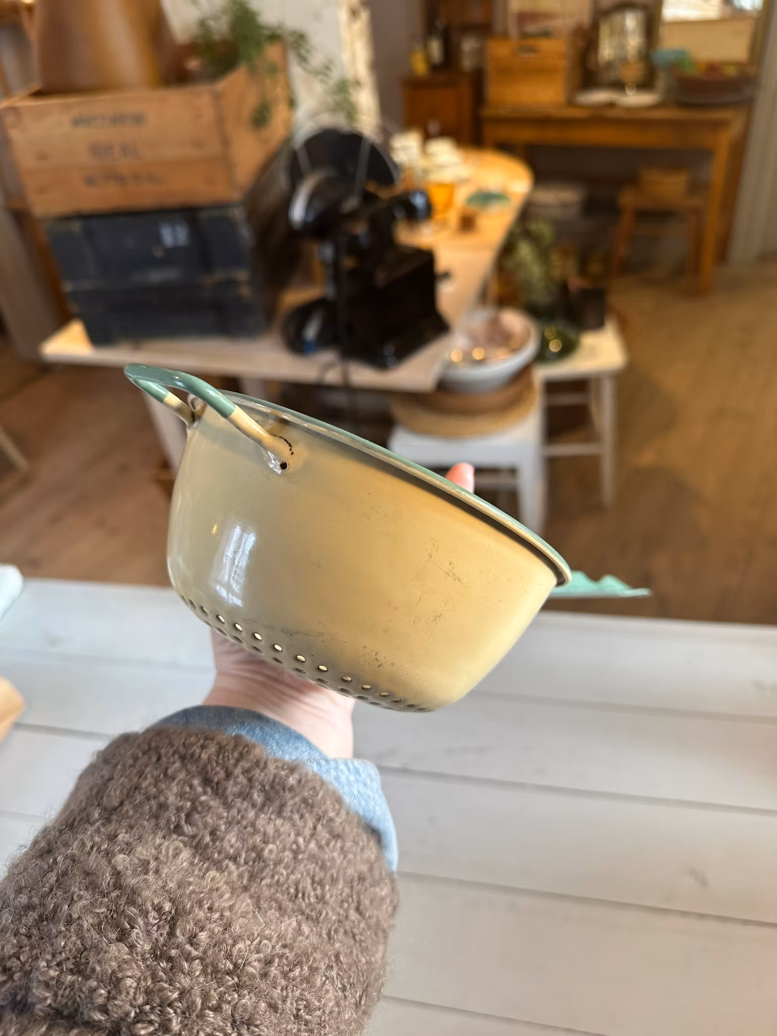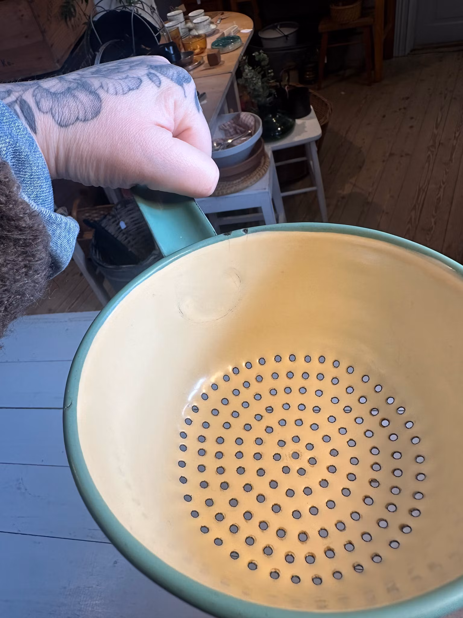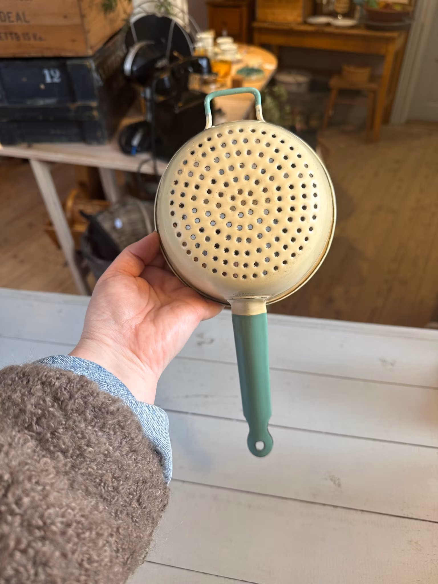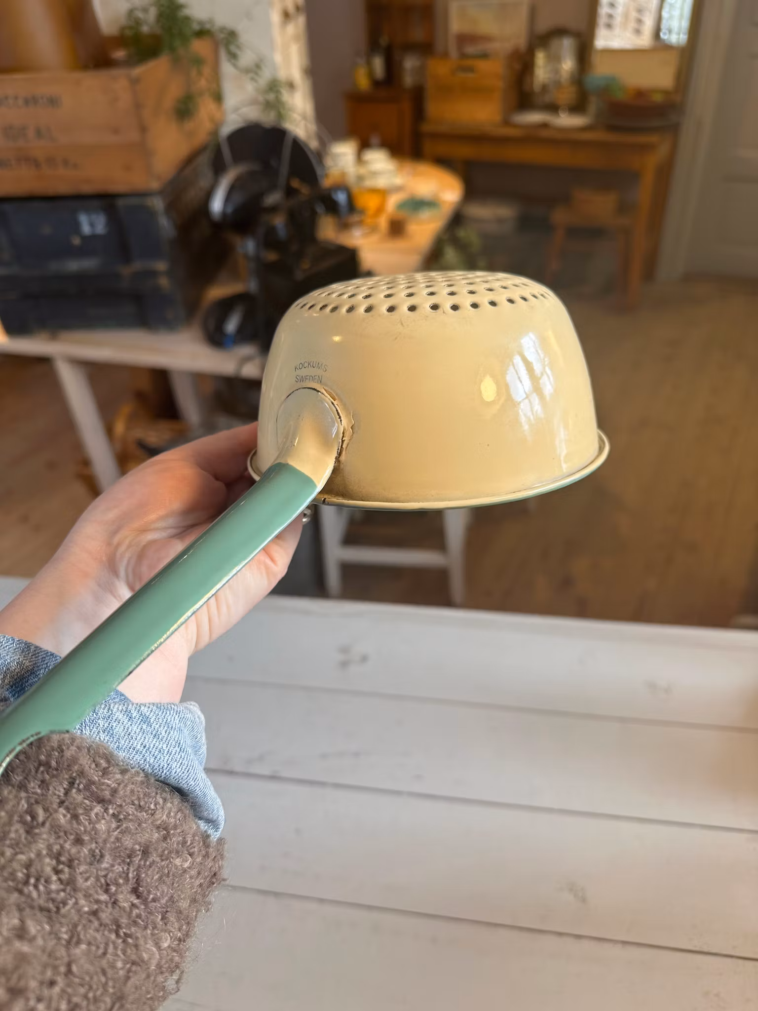 Fint emaljerat gammalt durkslag ifrån svenska Kockums. I klassiska gula med grön kant. Mindre modell av durkslag.