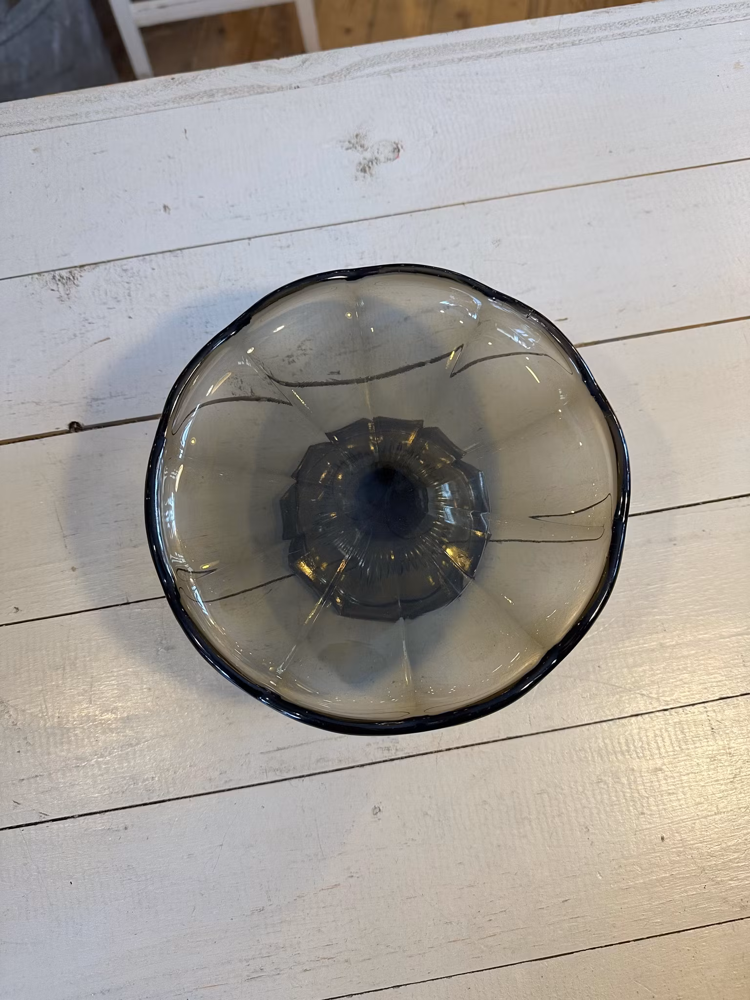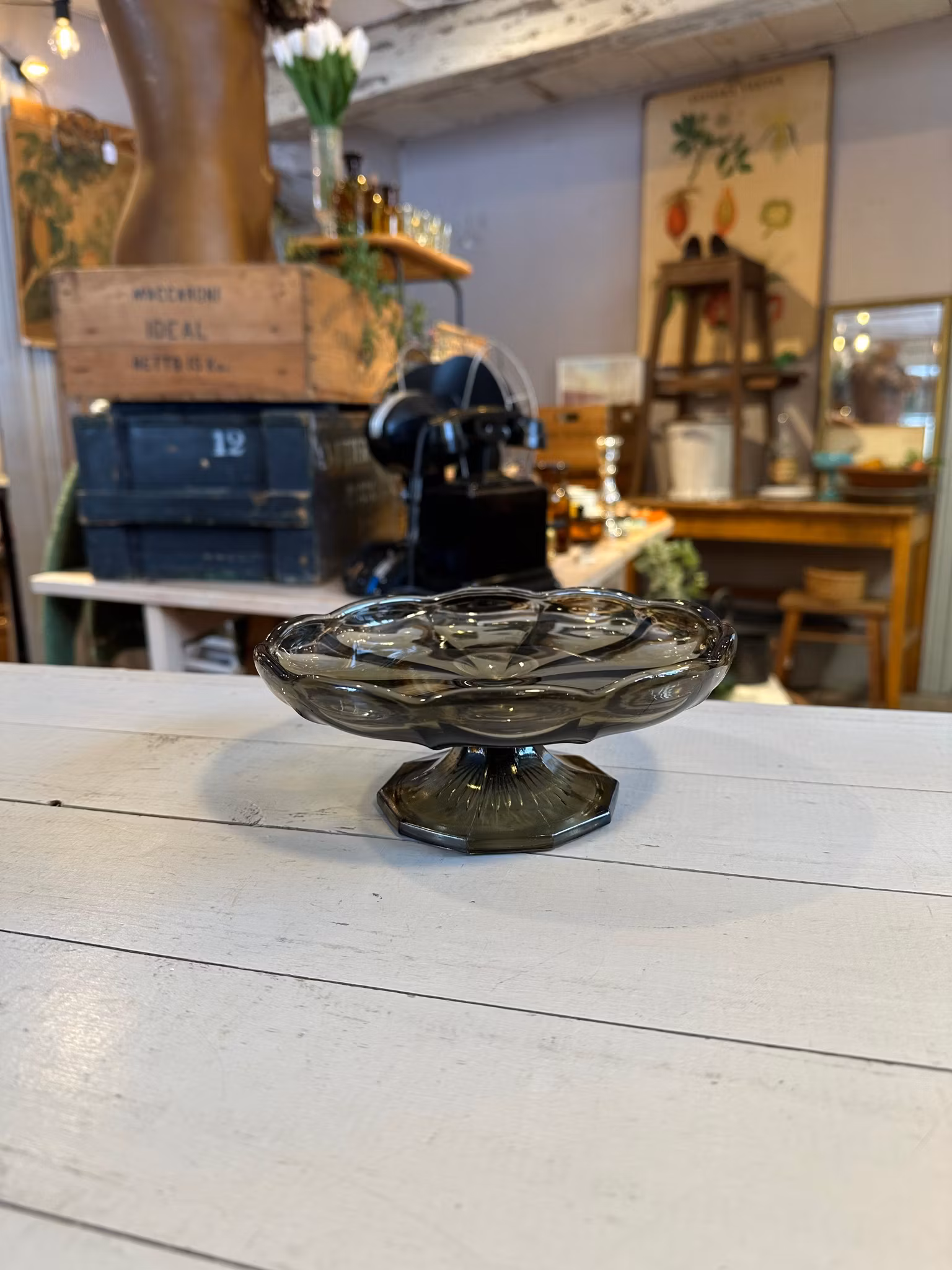 Litet fint kakfat på fot i lite grå/rökfärgat glas. I gott använt och åldrat skick. Spår av användning finns över hela. Se bilder för skick. Mått ca 17,5*7,5c