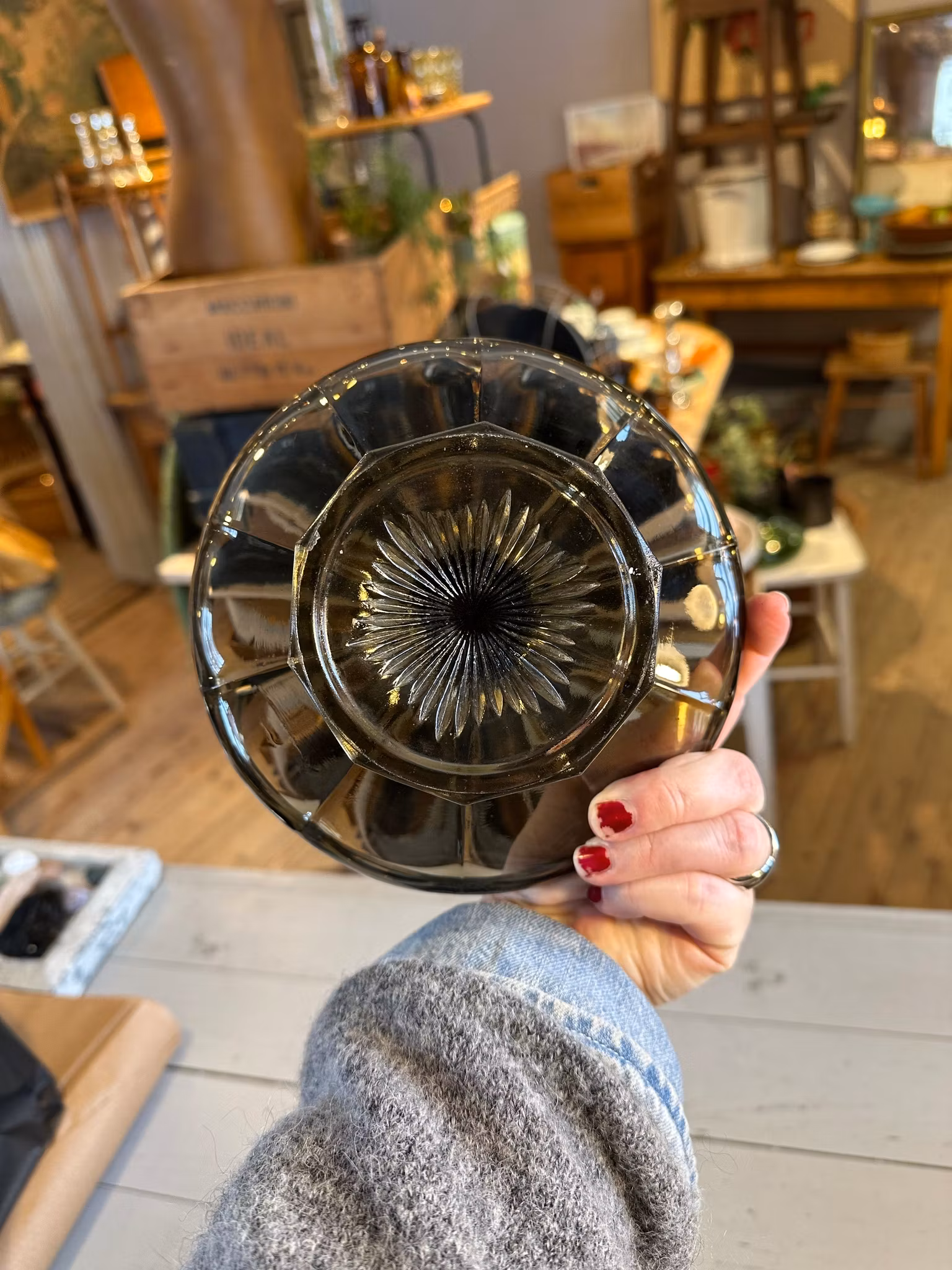 Litet fint kakfat på fot i lite grå/rökfärgat glas.