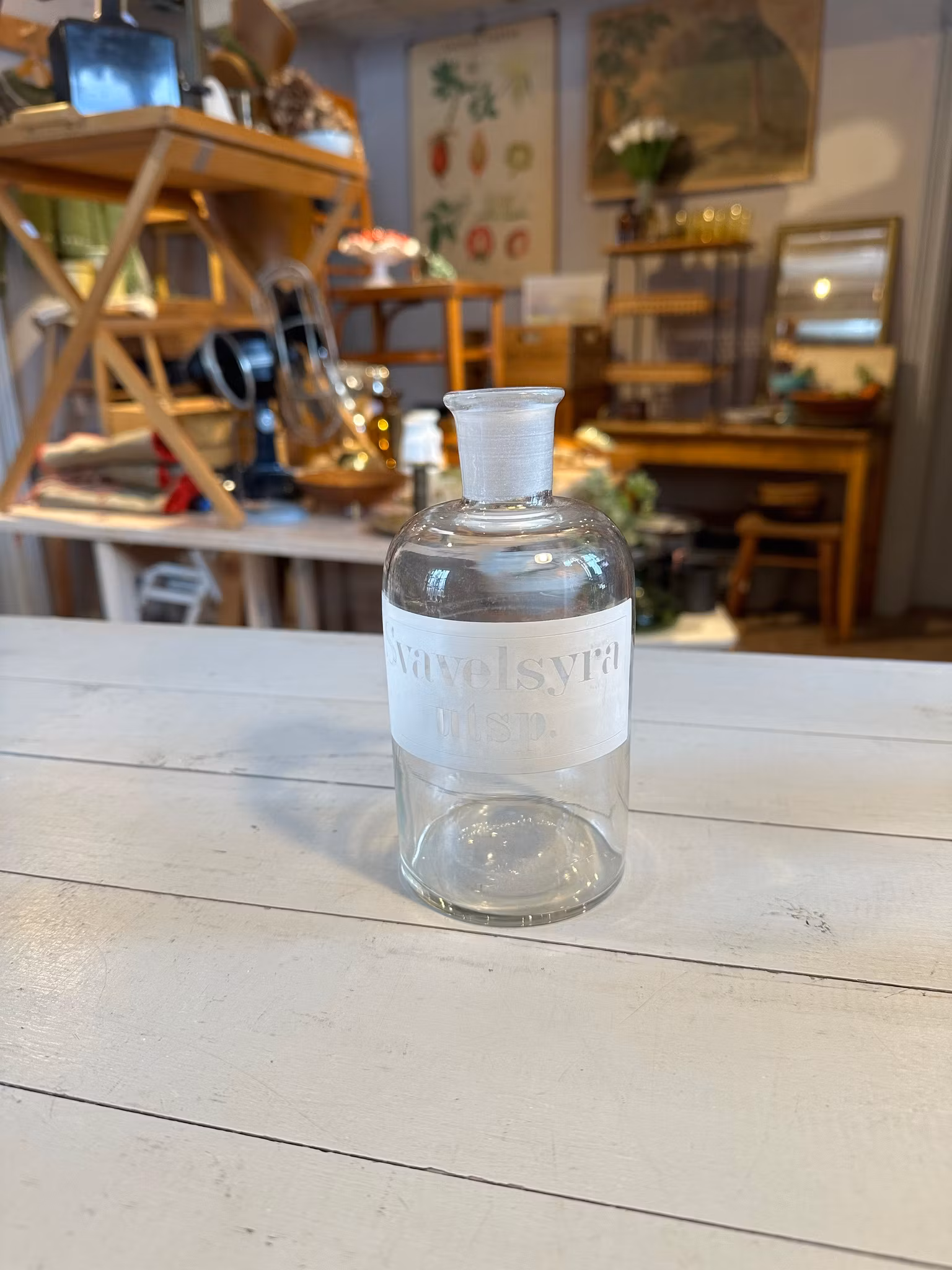 Fin gammal medicinflaska/glasflaska med etsad text i glaset framtill. Svavelsyra utsp. Ingen kork.