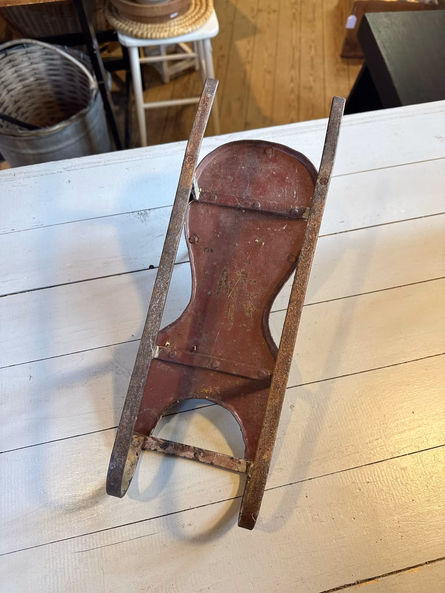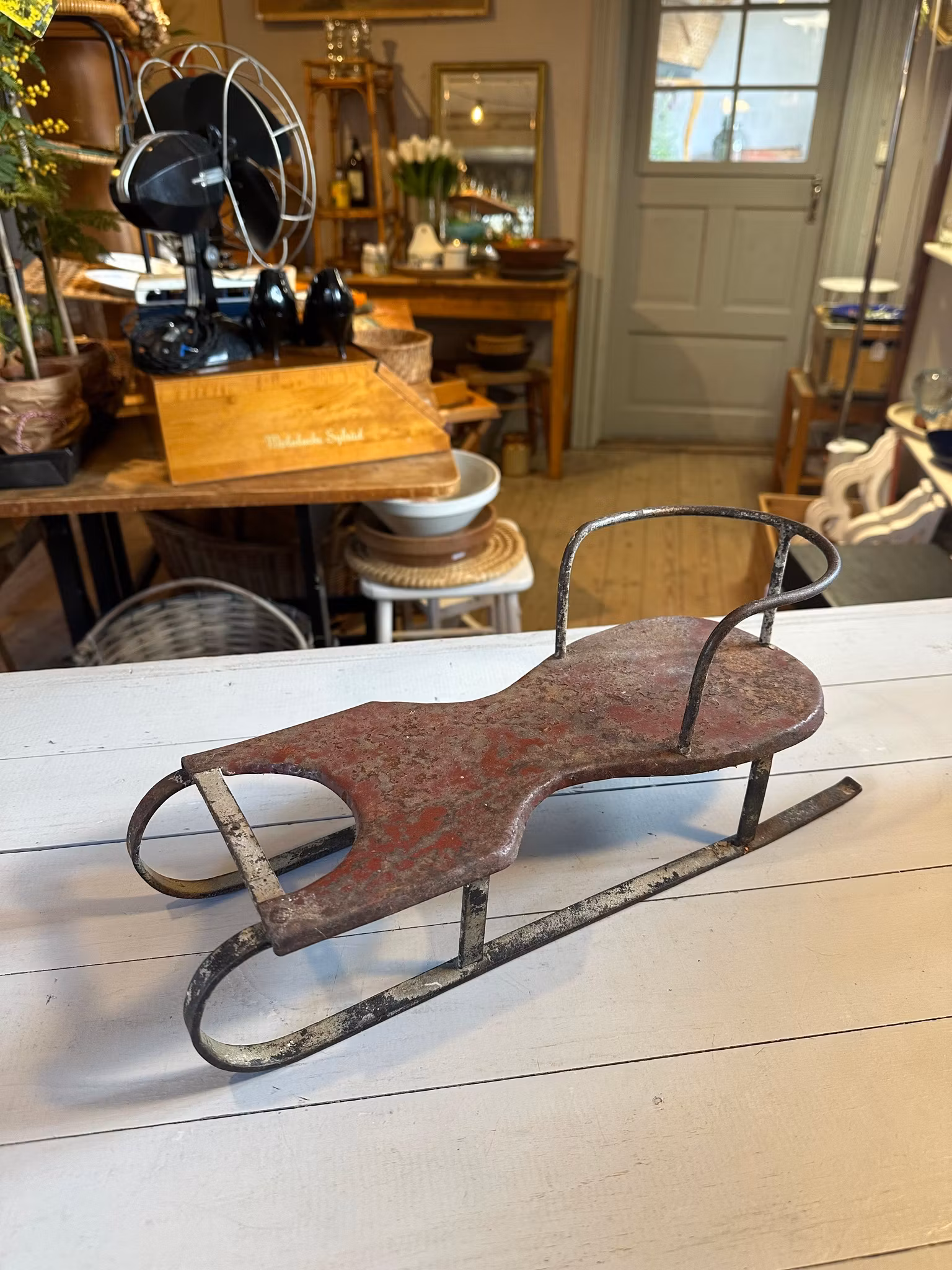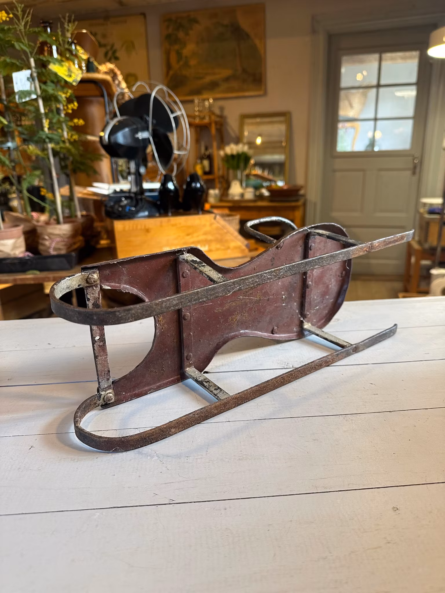 Underbar liten mini-kälke i metall. Patinerad och charmigt sliten över hela.