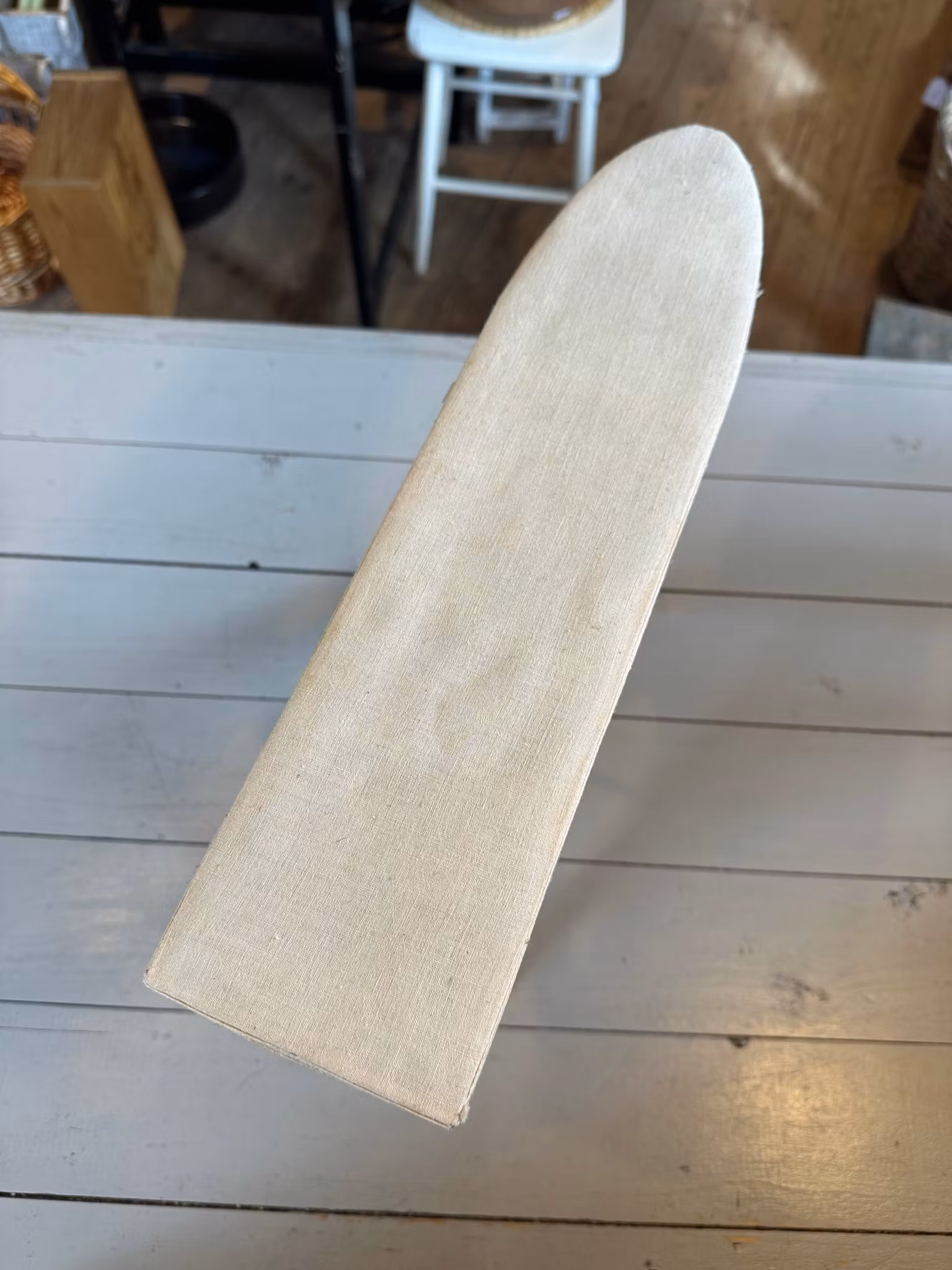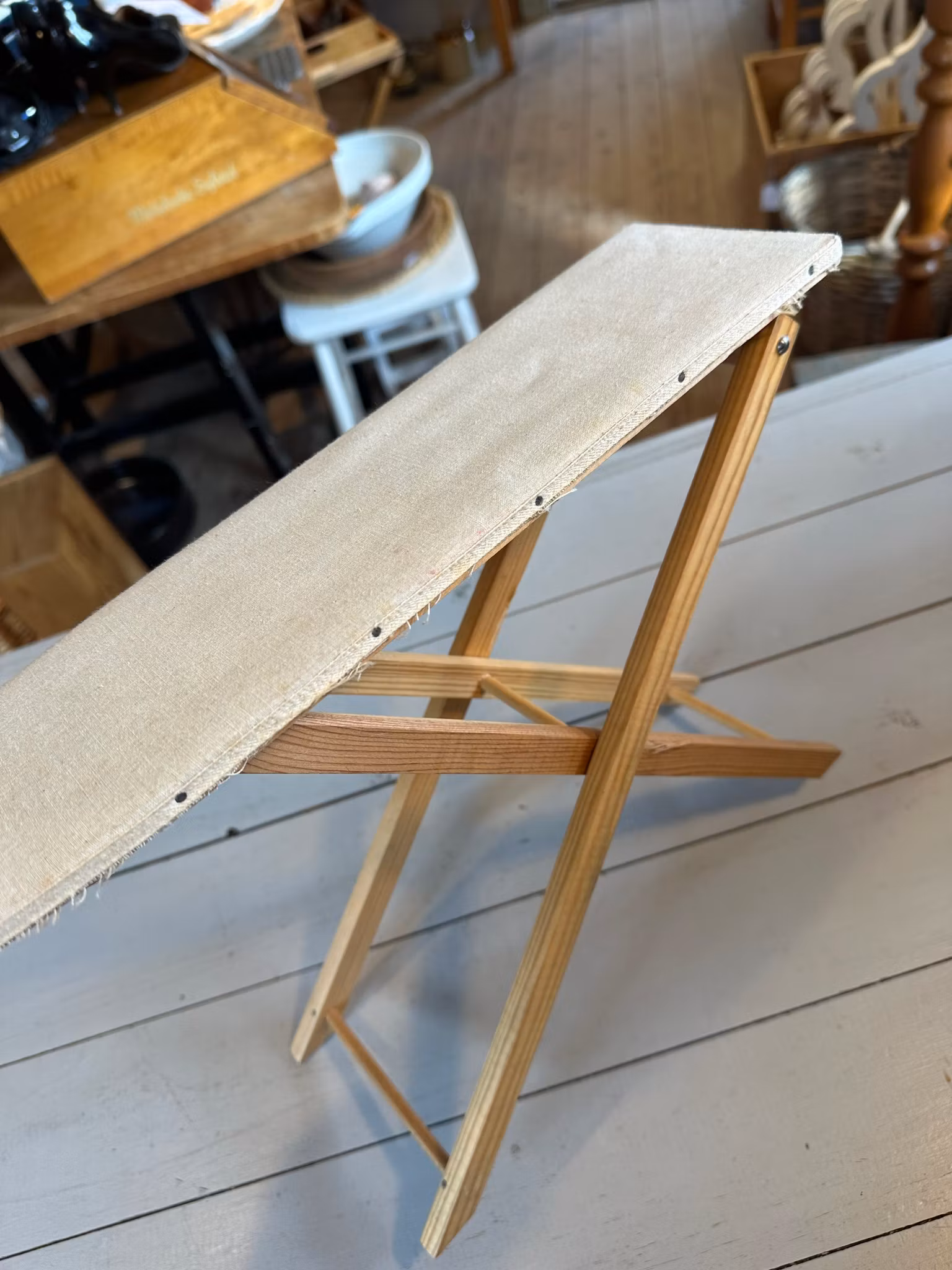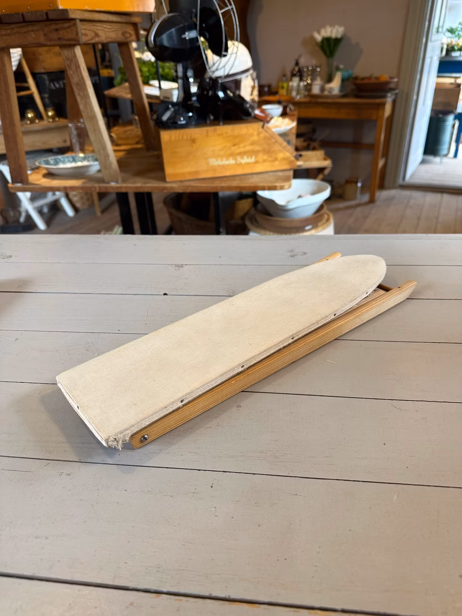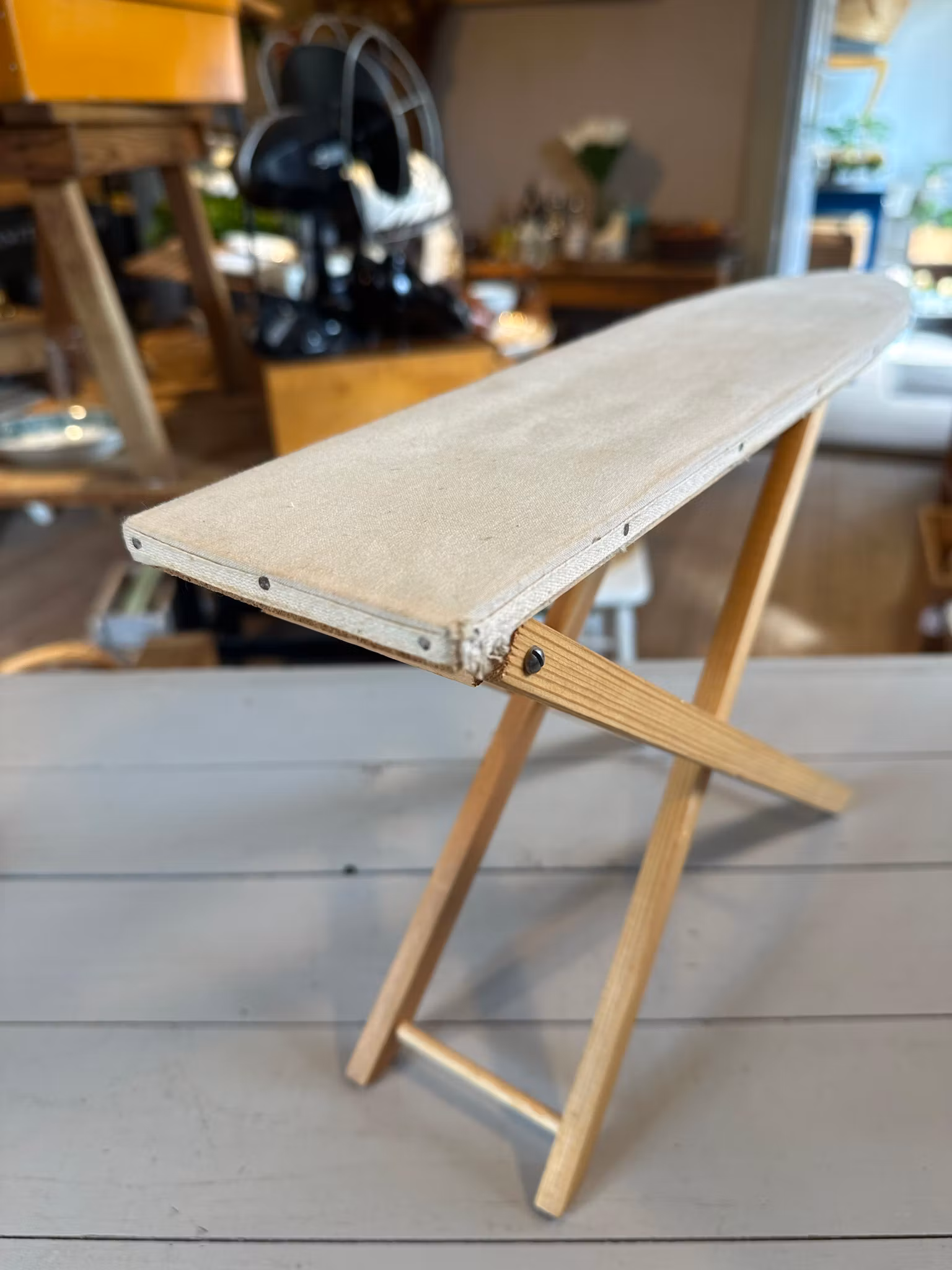 Ljuvlig liten mini-strykbräda i trä med tyg ovanpå. Ihopfällbar.