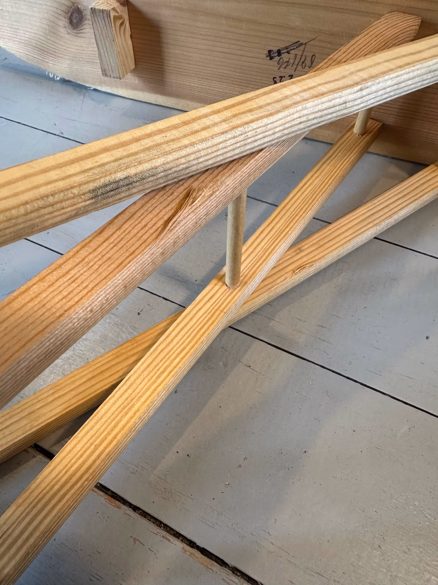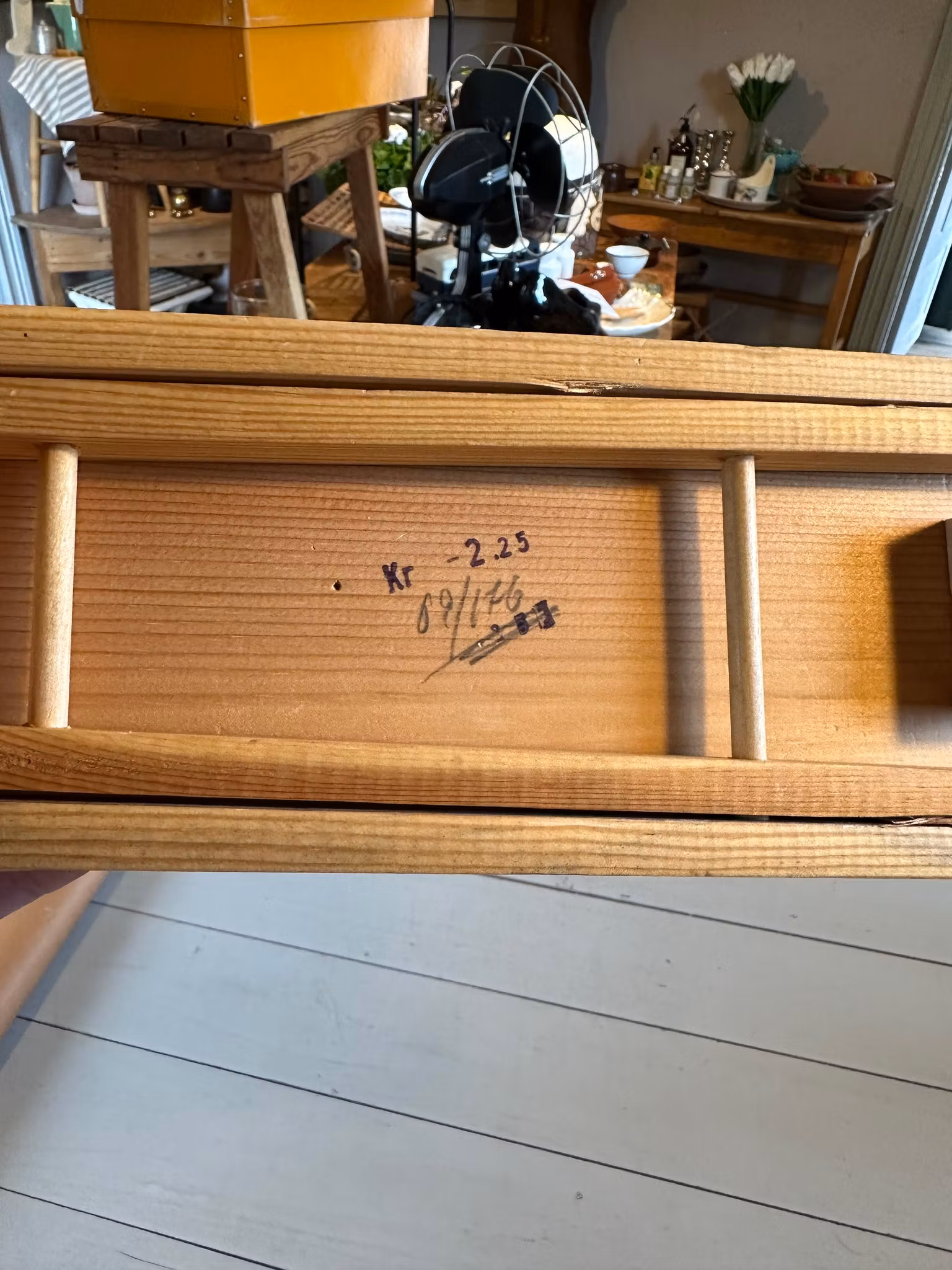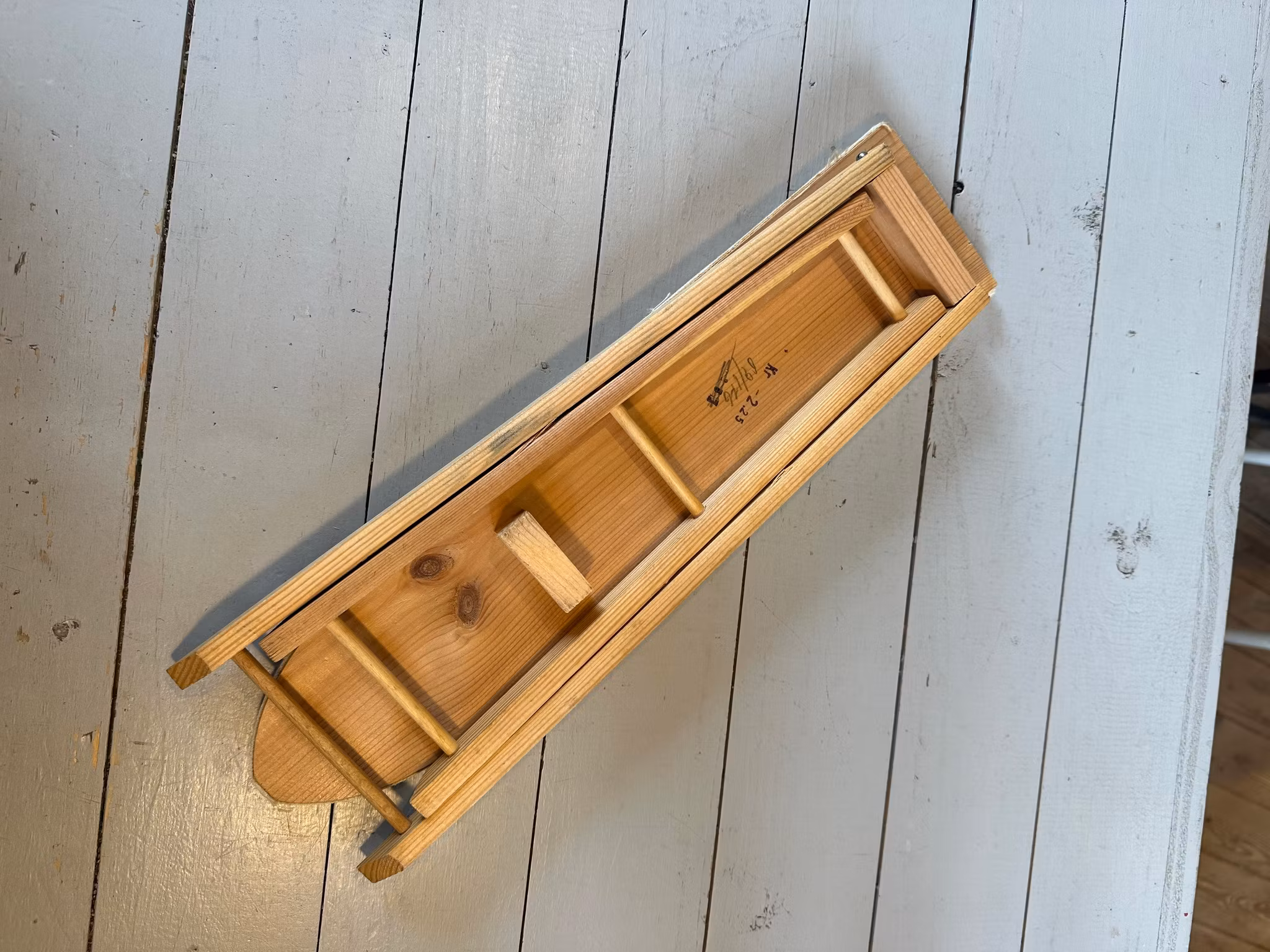I gott använt och åldrat skick. Spår av användning och ålder finns över hela. Se bilder för skick. Fläckar och slitage finns. Skav i träet då någon fällt ihop den fel någon gång, se bild.