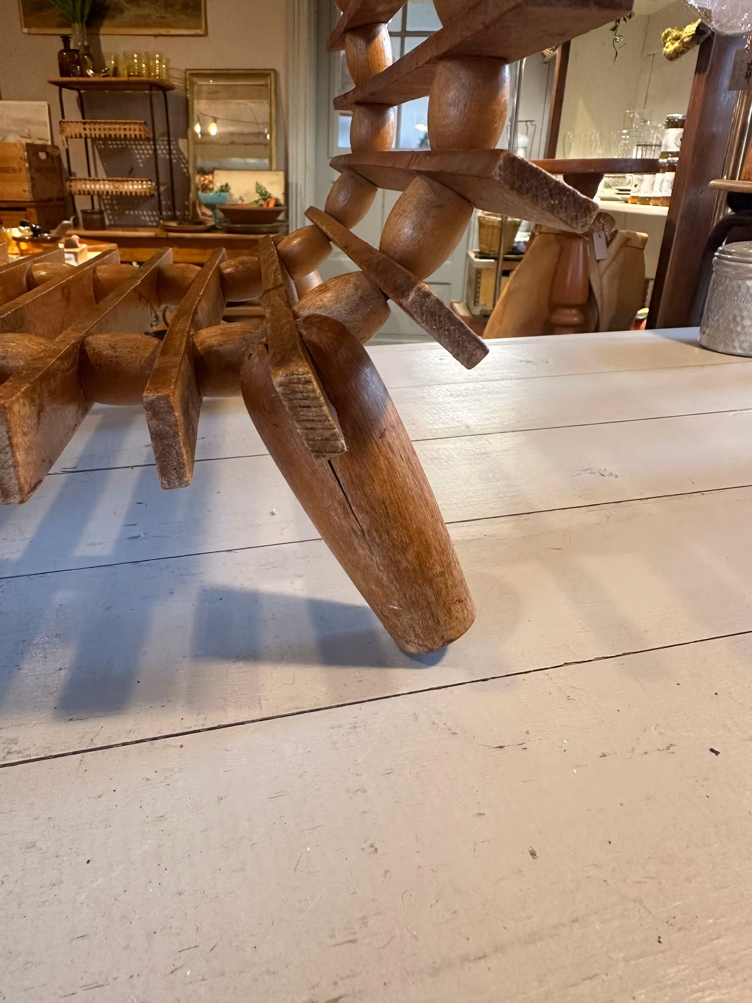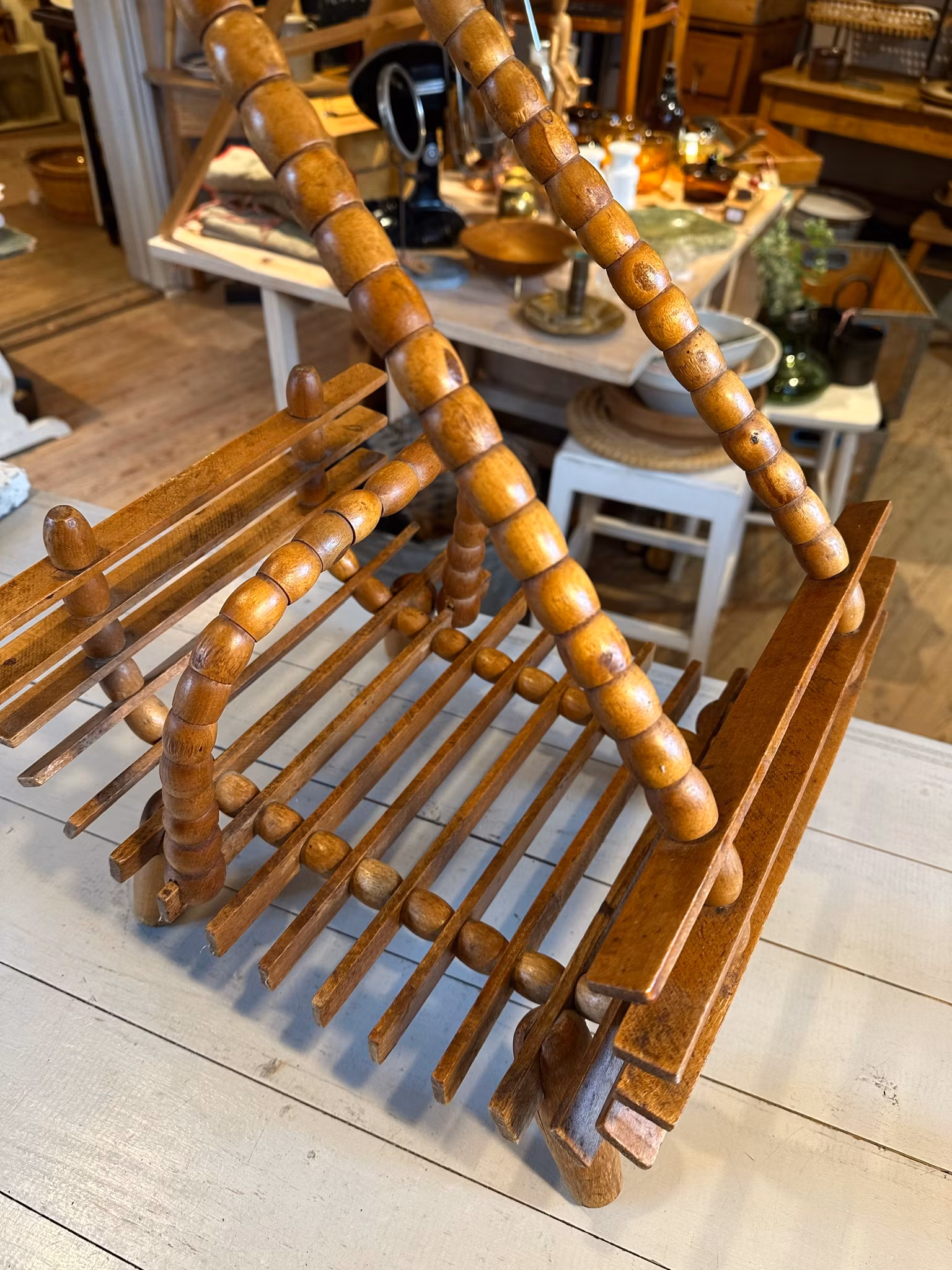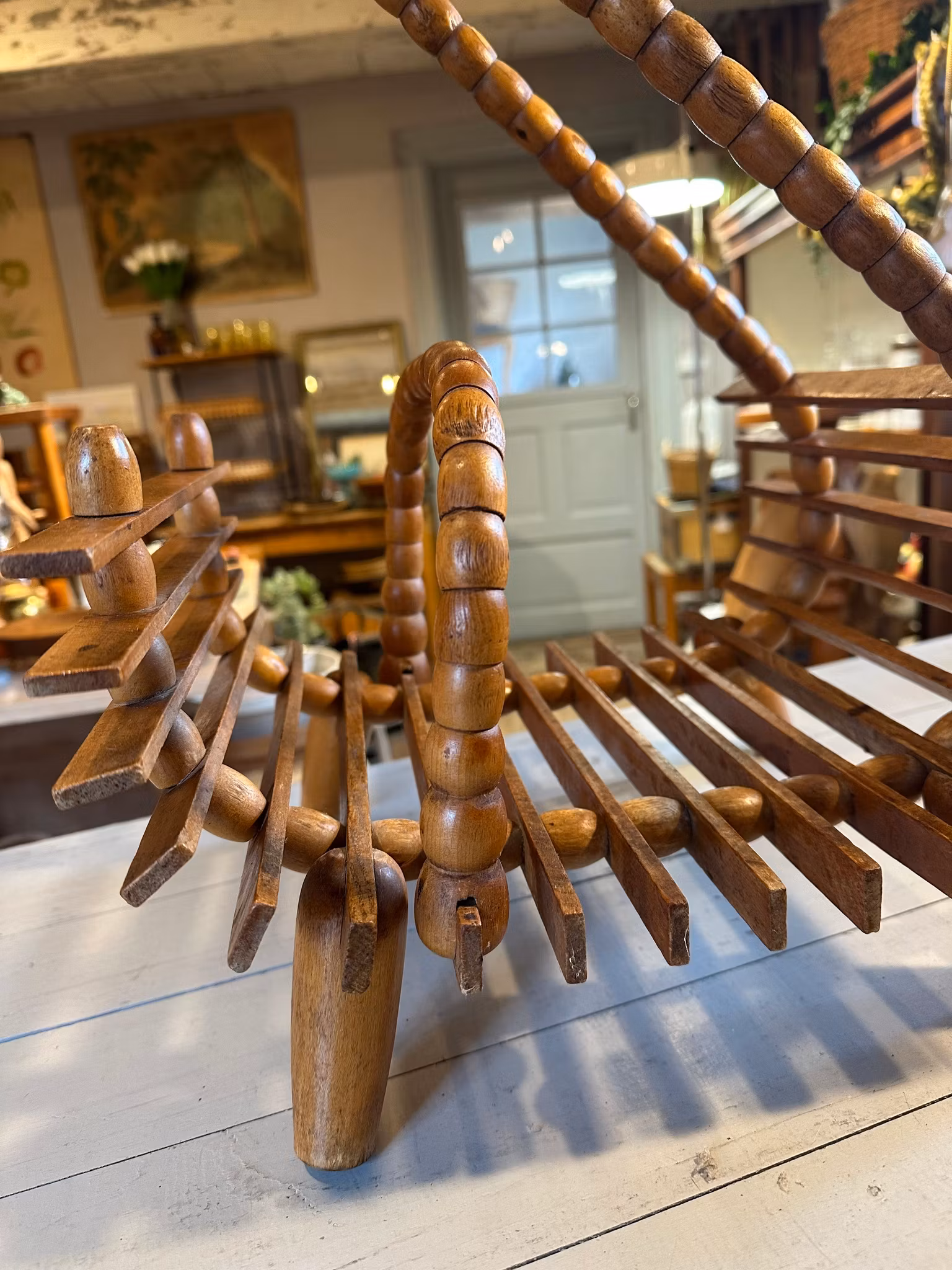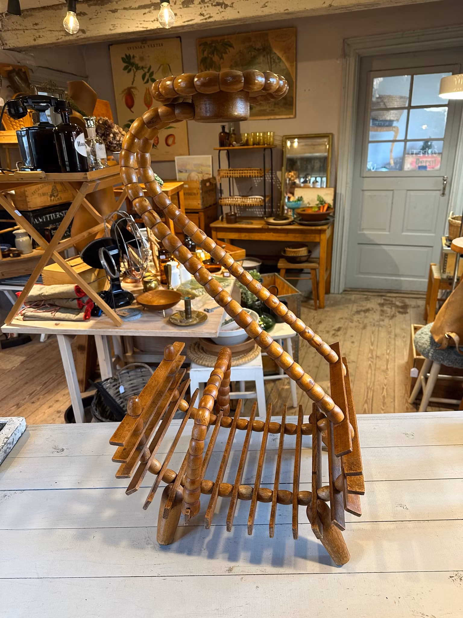 Vacker piedestal/blompall i trä med tidningsställ/förvaring nedtill. Rolig snirklig modell.