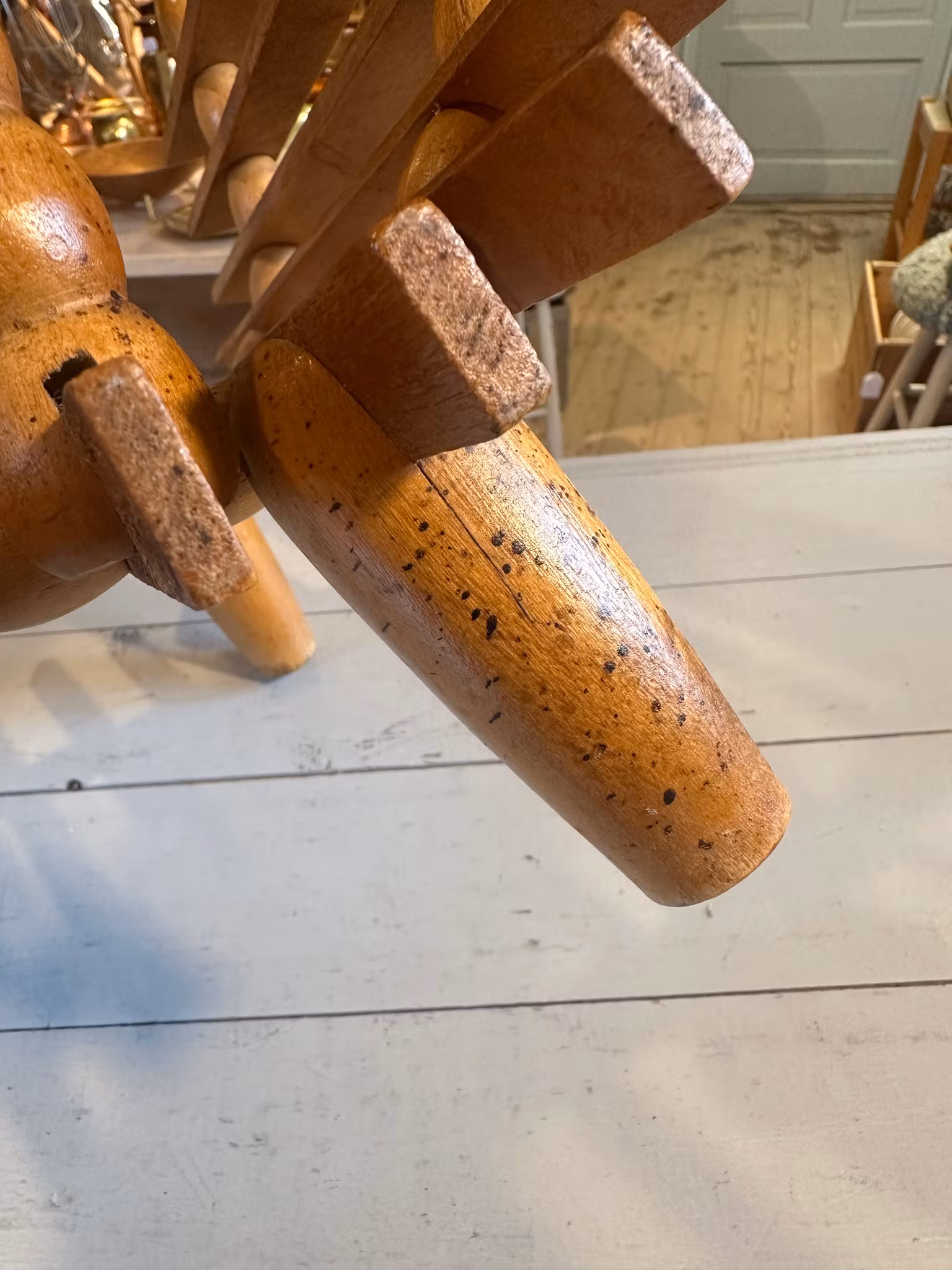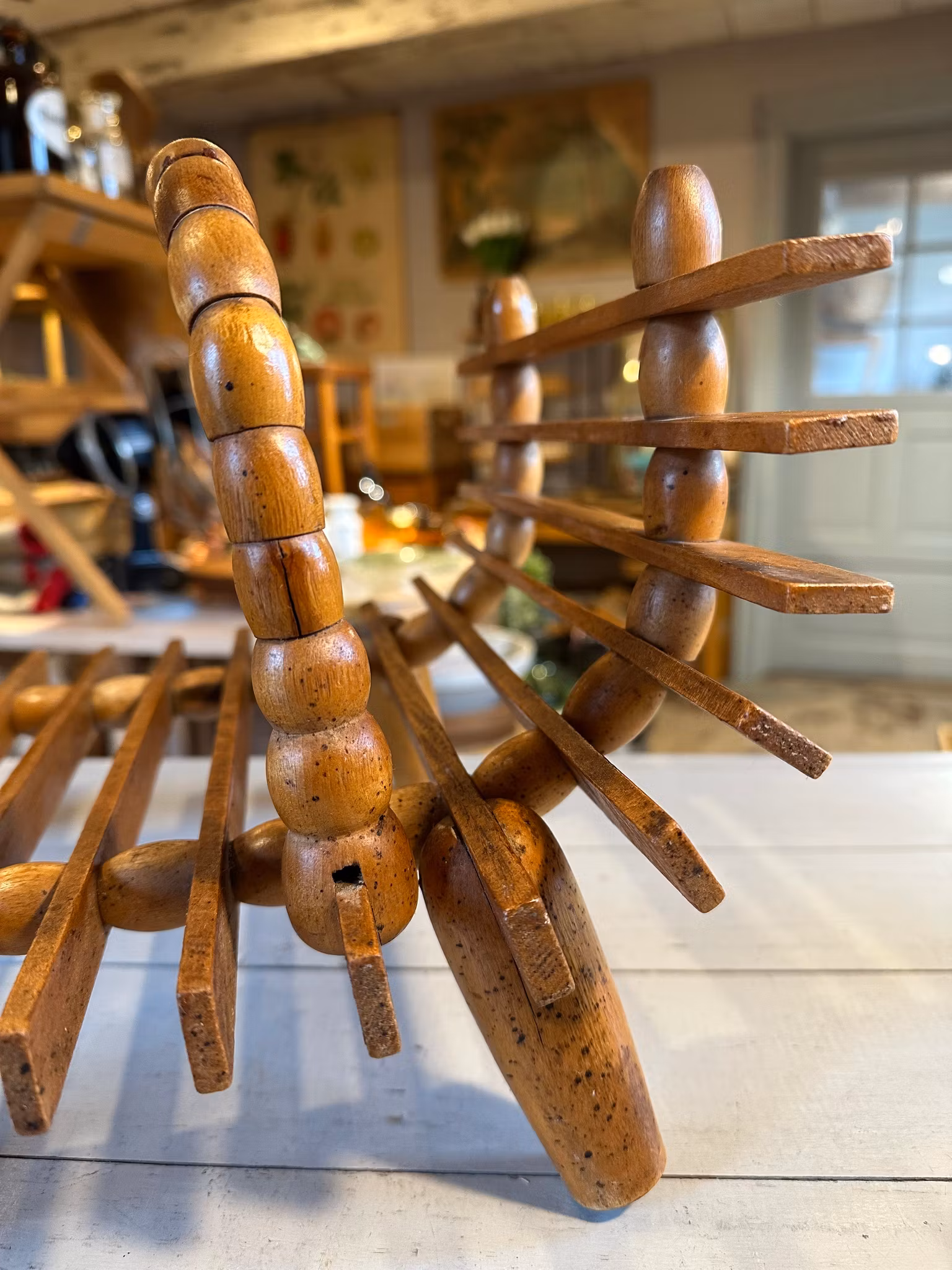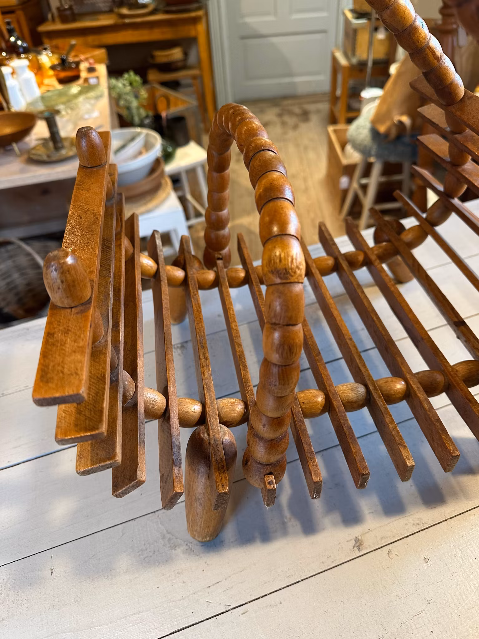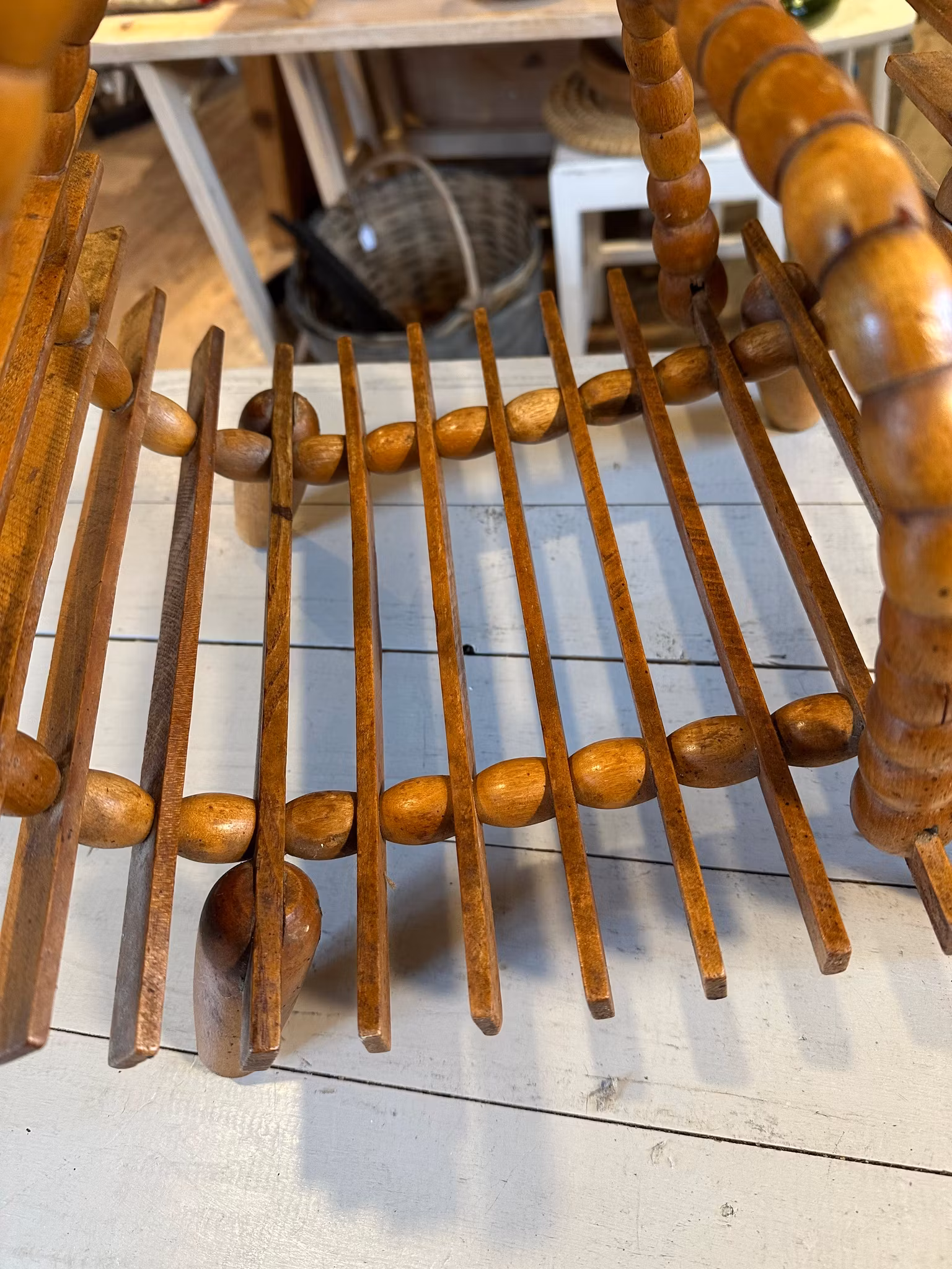 Vacker piedestal/blompall i trä med tidningsställ/förvaring nedtill. Rolig snirklig modell.