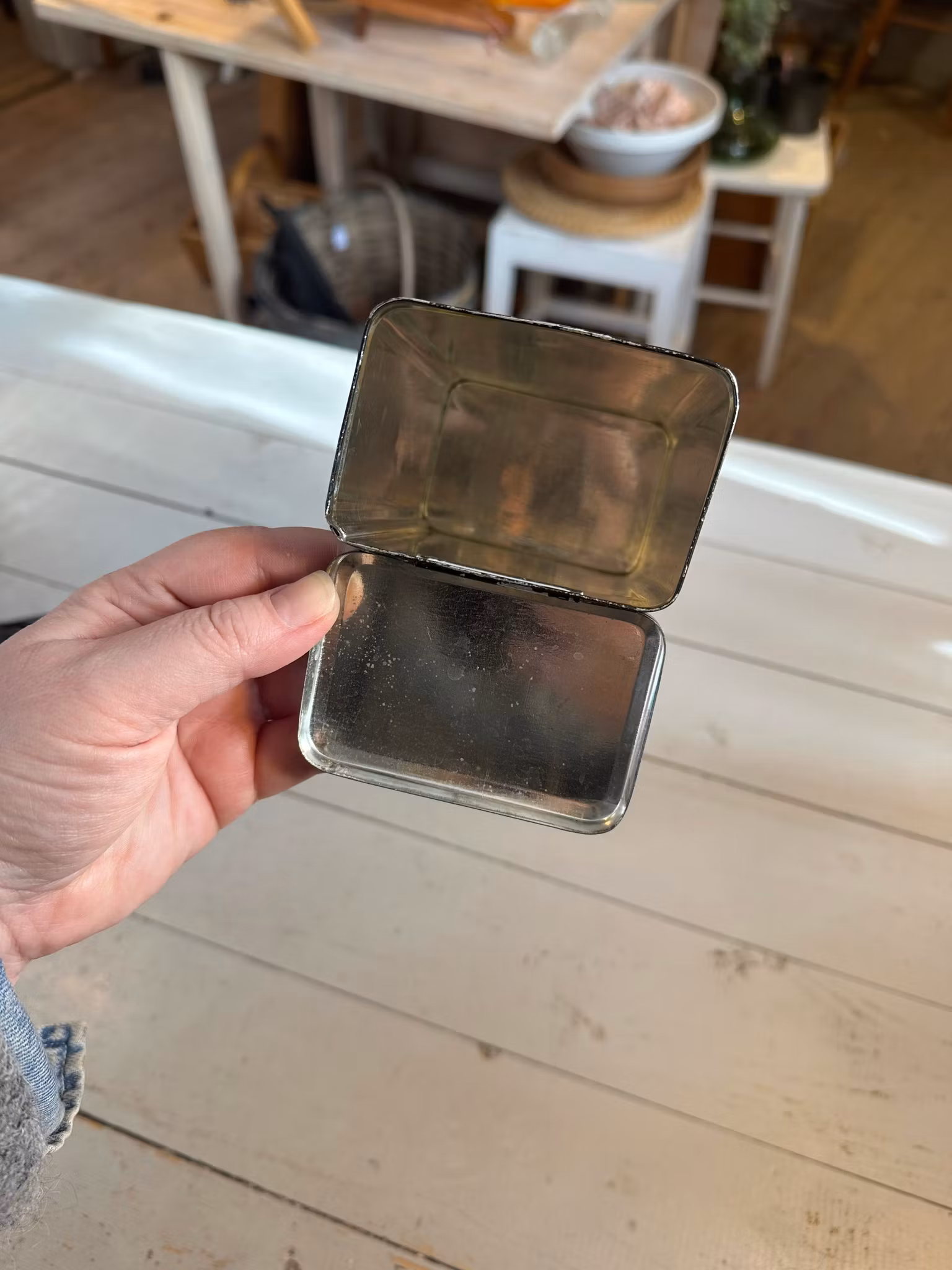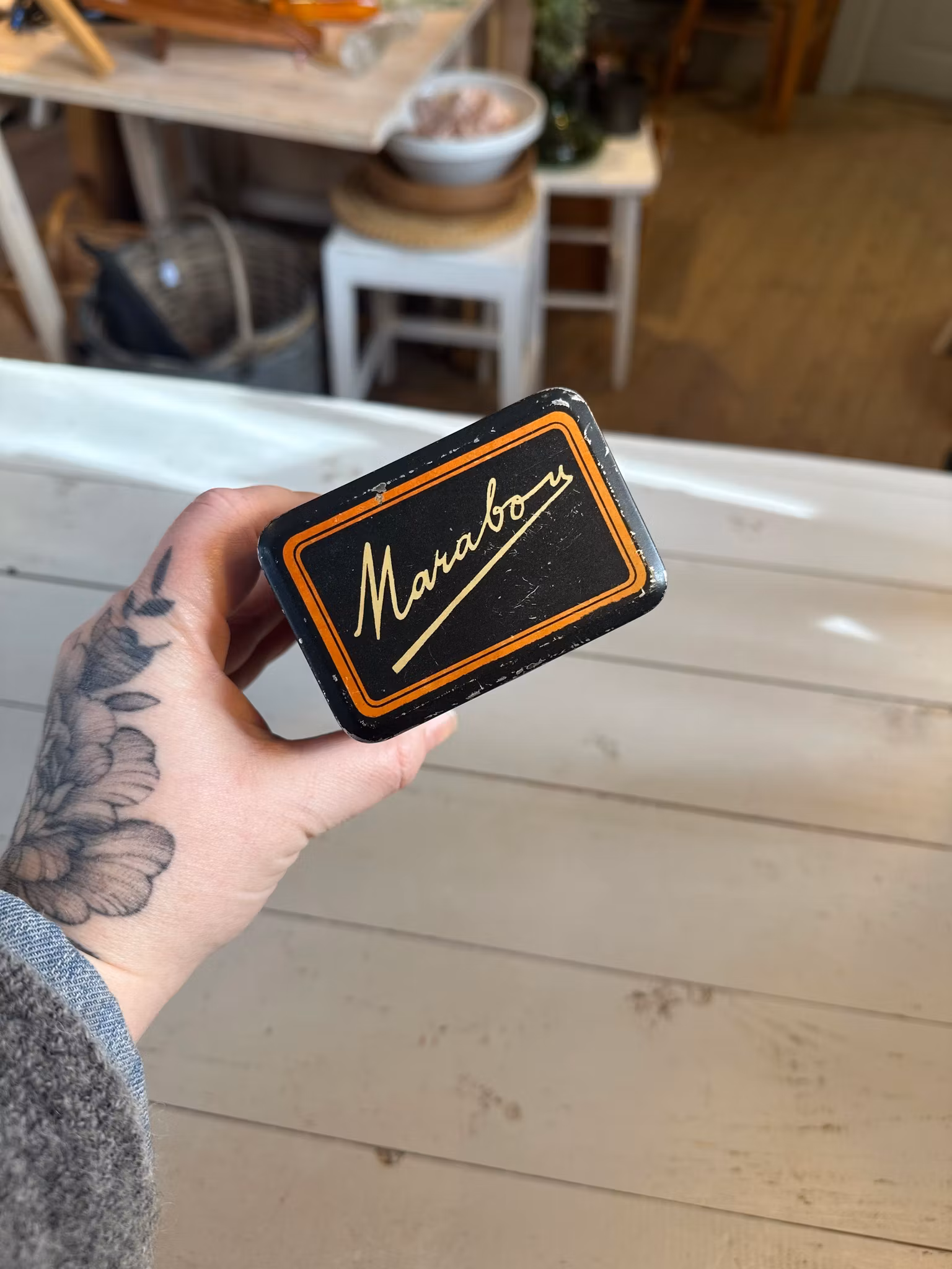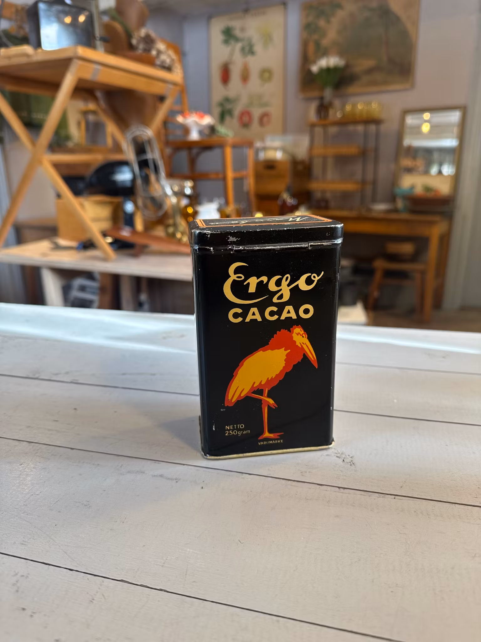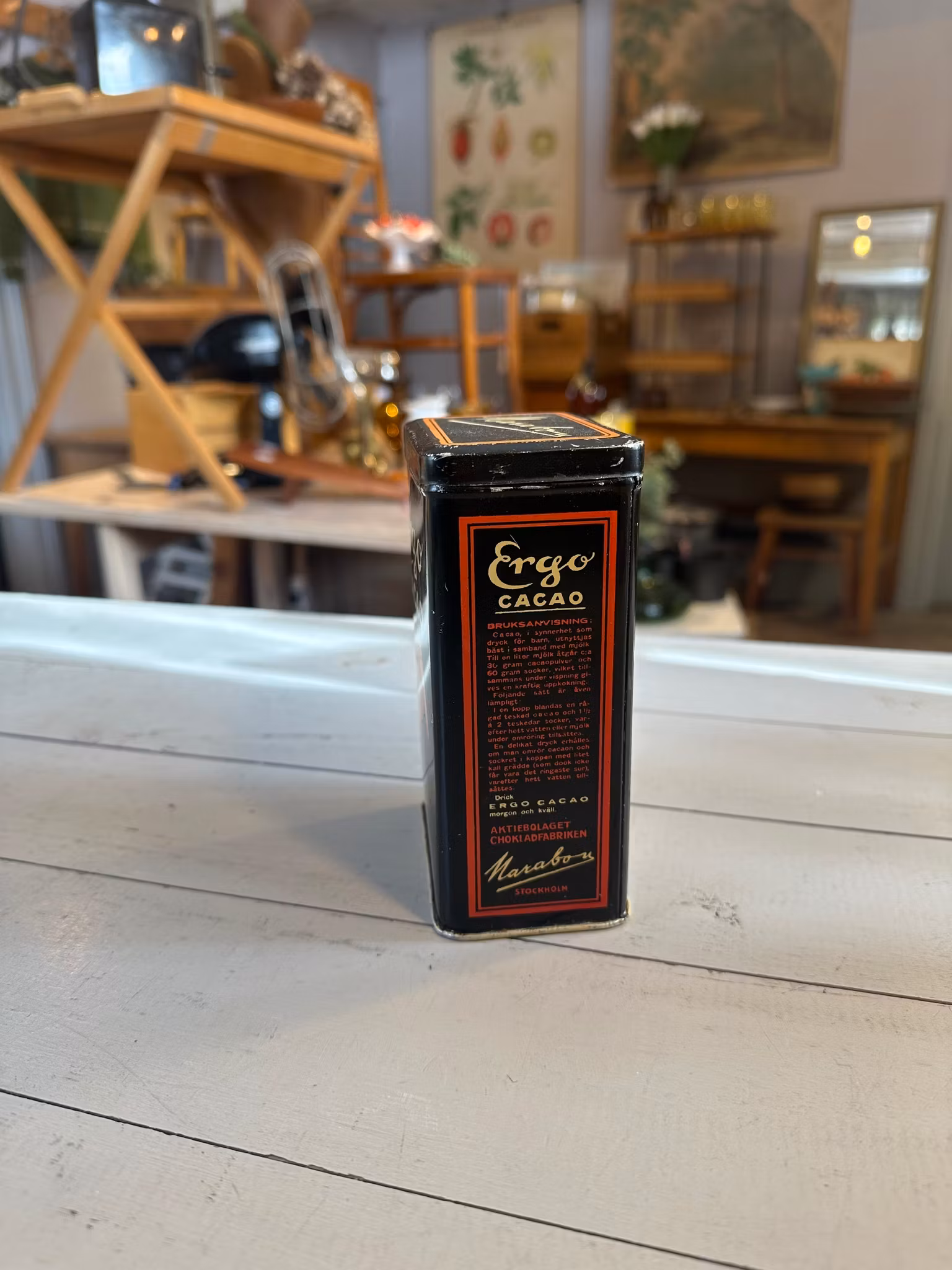 Charmig gammal plåtburk märkt Ergo Cacao Marabou.