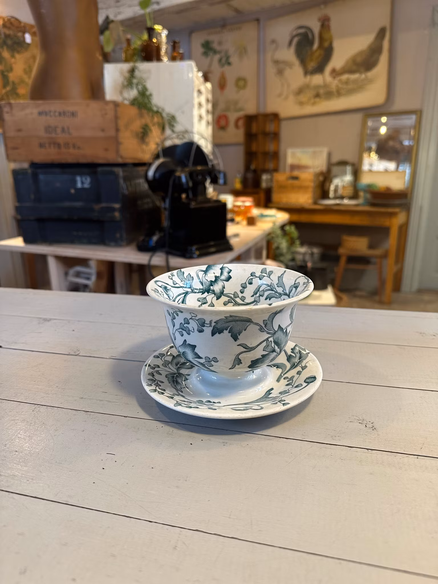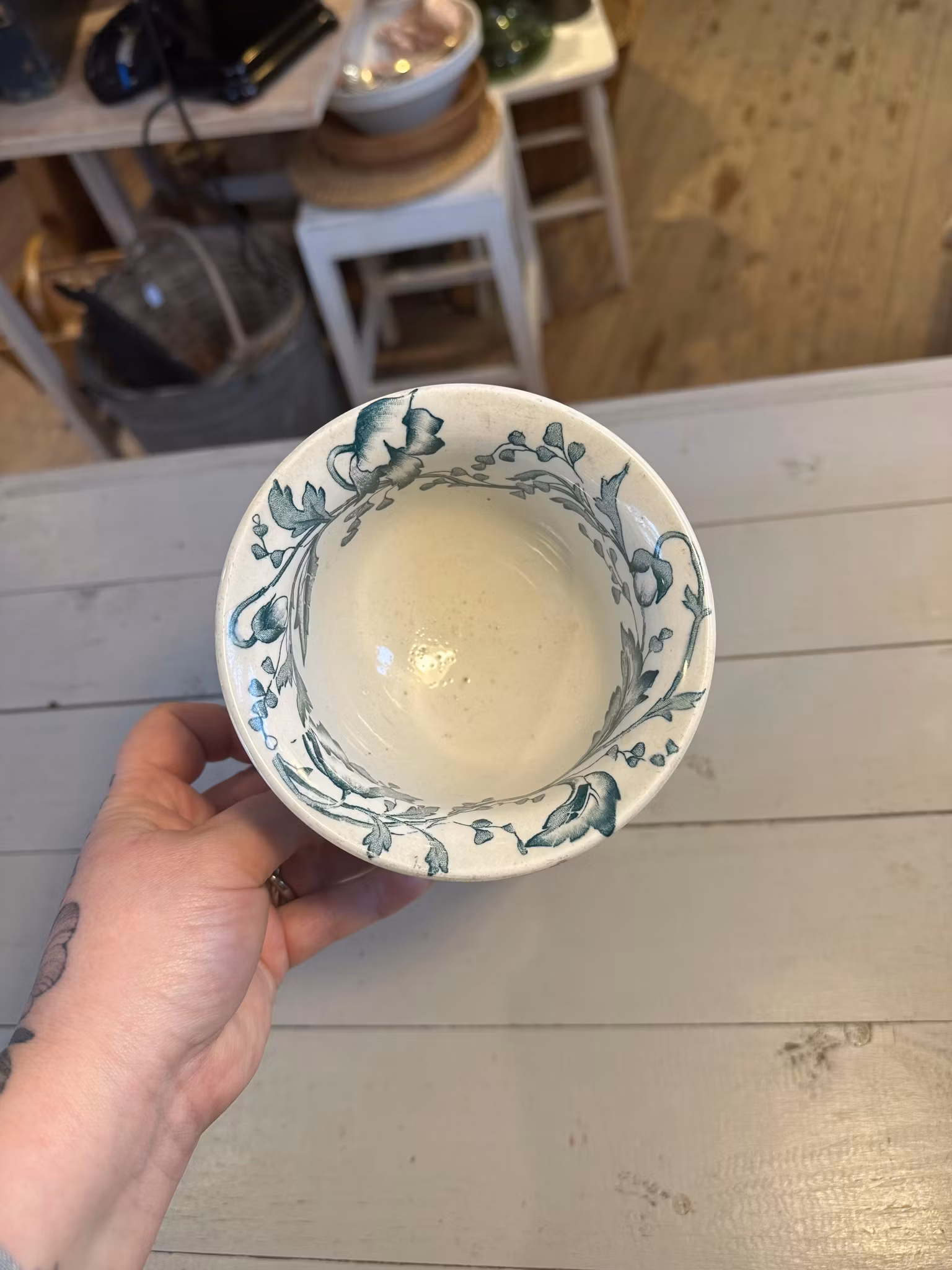 Vacker gammal skål med fast fat typ såsskål. Dekor i grönt med blad.