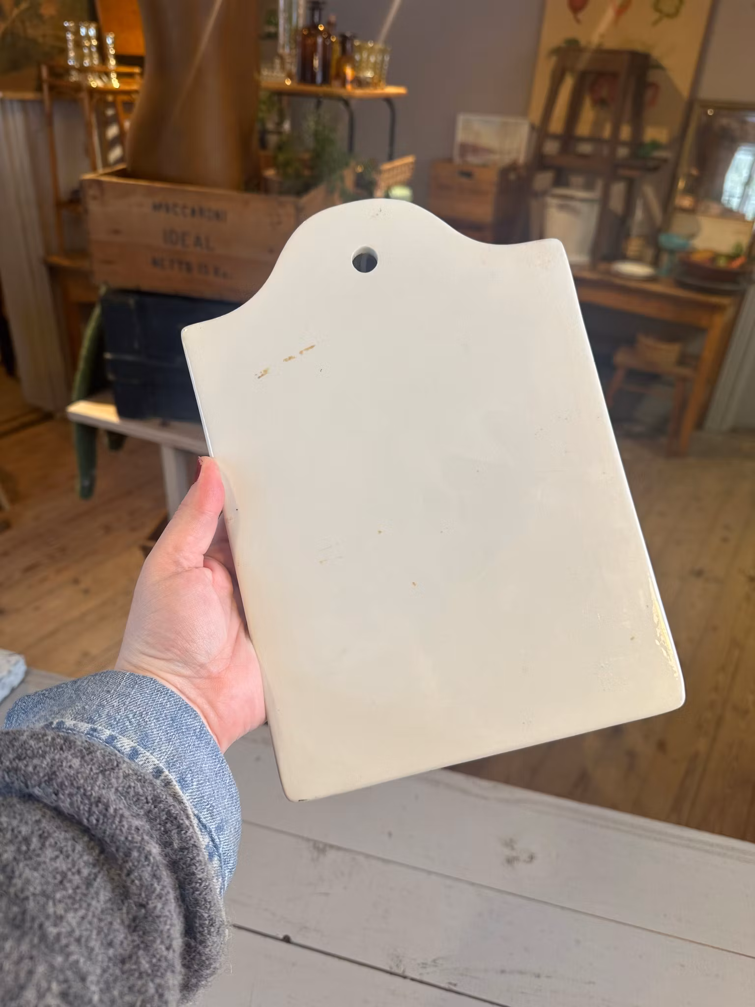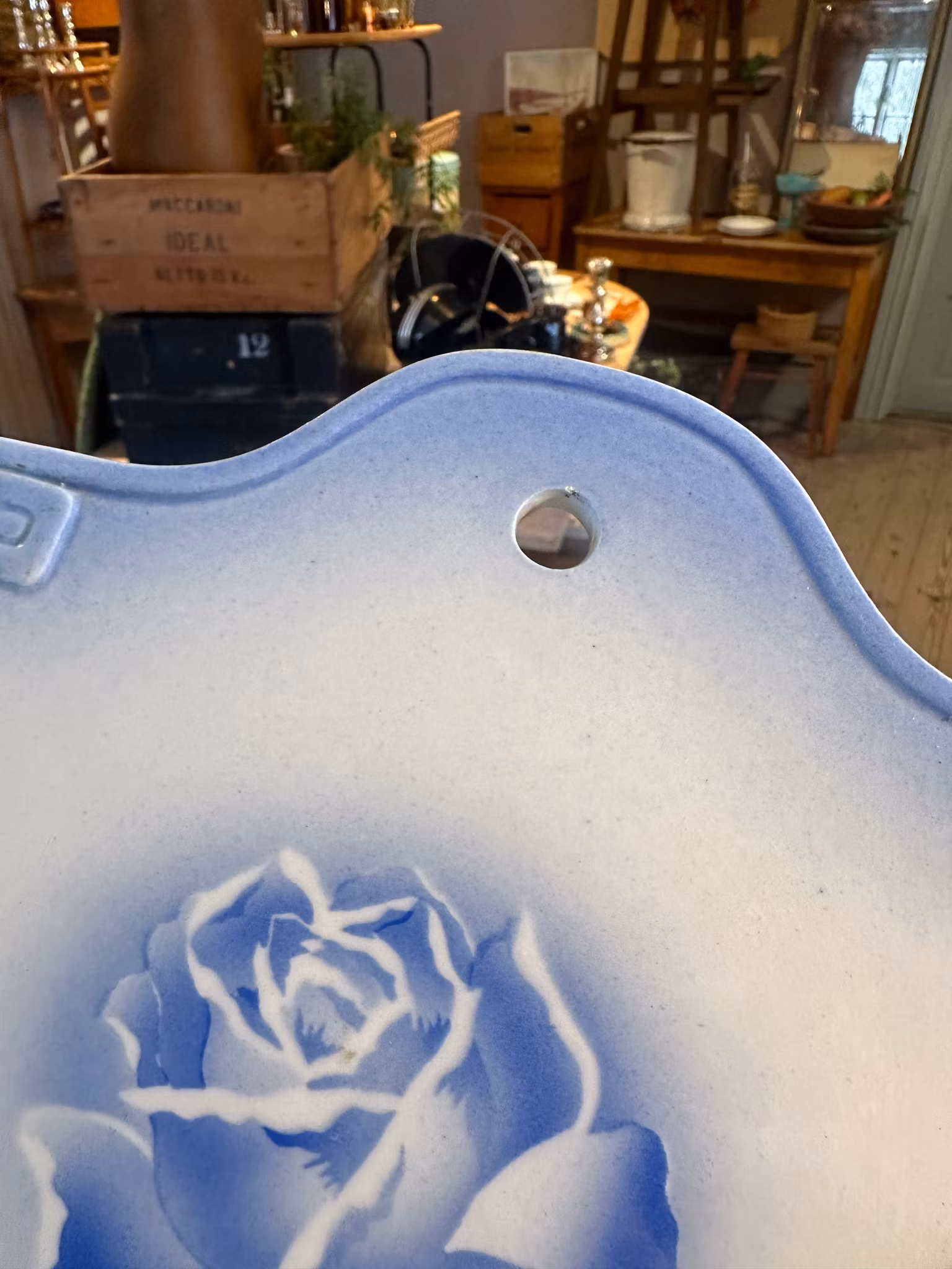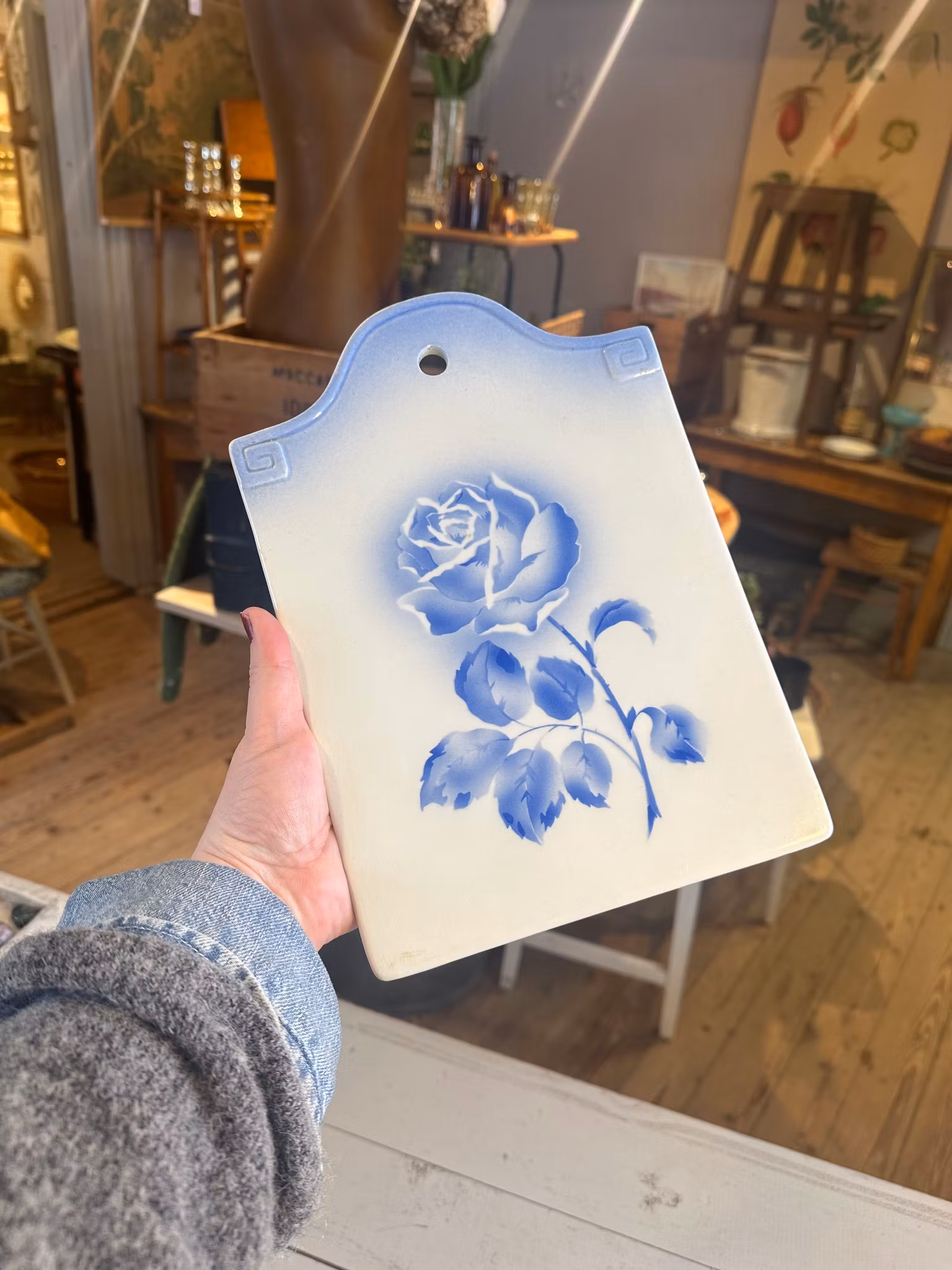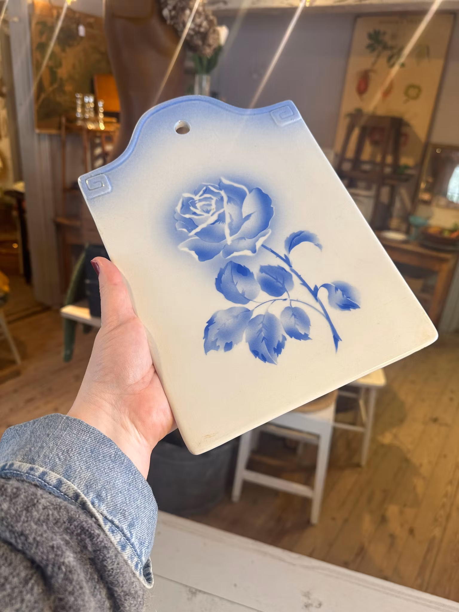 Vacker gammal skärbräda i porslin med ros på ovansida. Vit med blå dekor.