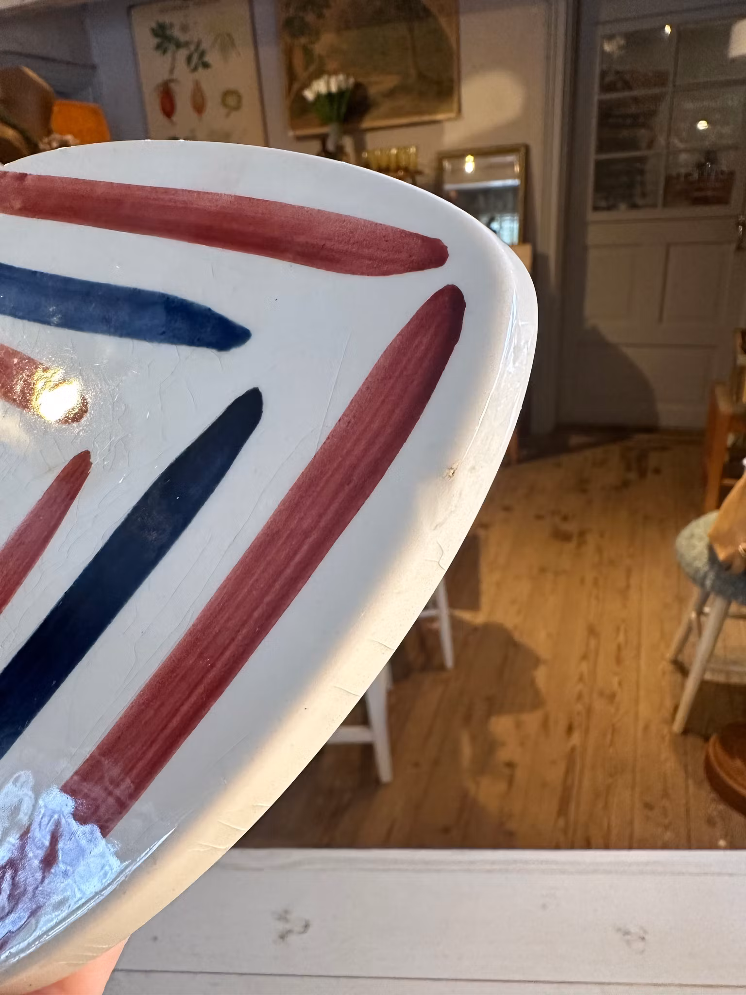 I gott använt och åldrat skick. Spår av användning och ålder över hela. Se bilder för skick. Krackeleringar finns i glasyren av ålder, det är normalt. Några tillverkningsgrejer i glasyren men i väldigt gott skick.