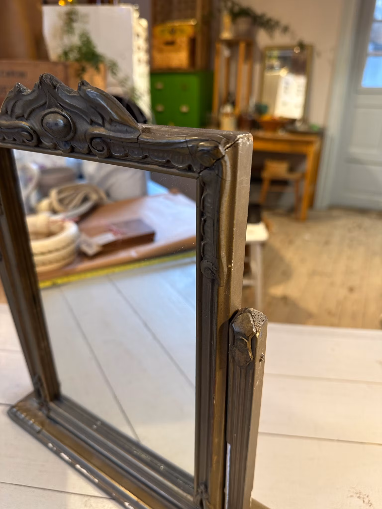 I gott använt och åldrat skick. Spår av användning och ålder finns över hela. Se bilder för skick. Sliten och nött men väldigt charmig gammal spegel. Avslag, skav och sprickor finns över både stativ och spegel. Baksidan har vi gjort om då den var skadad.