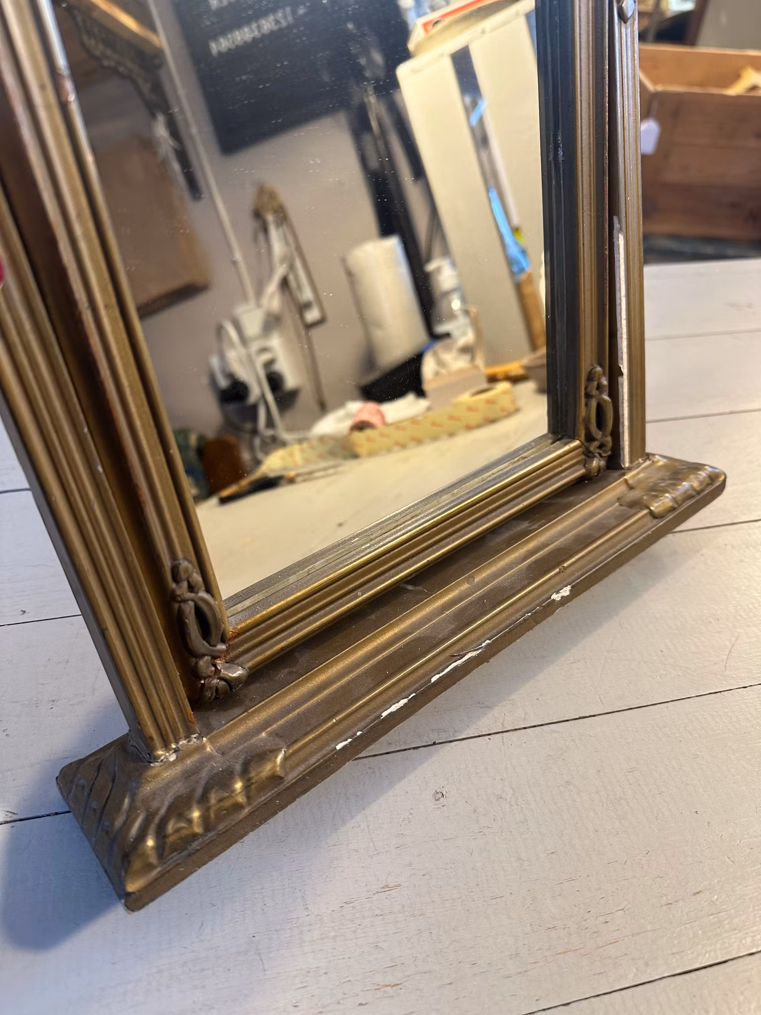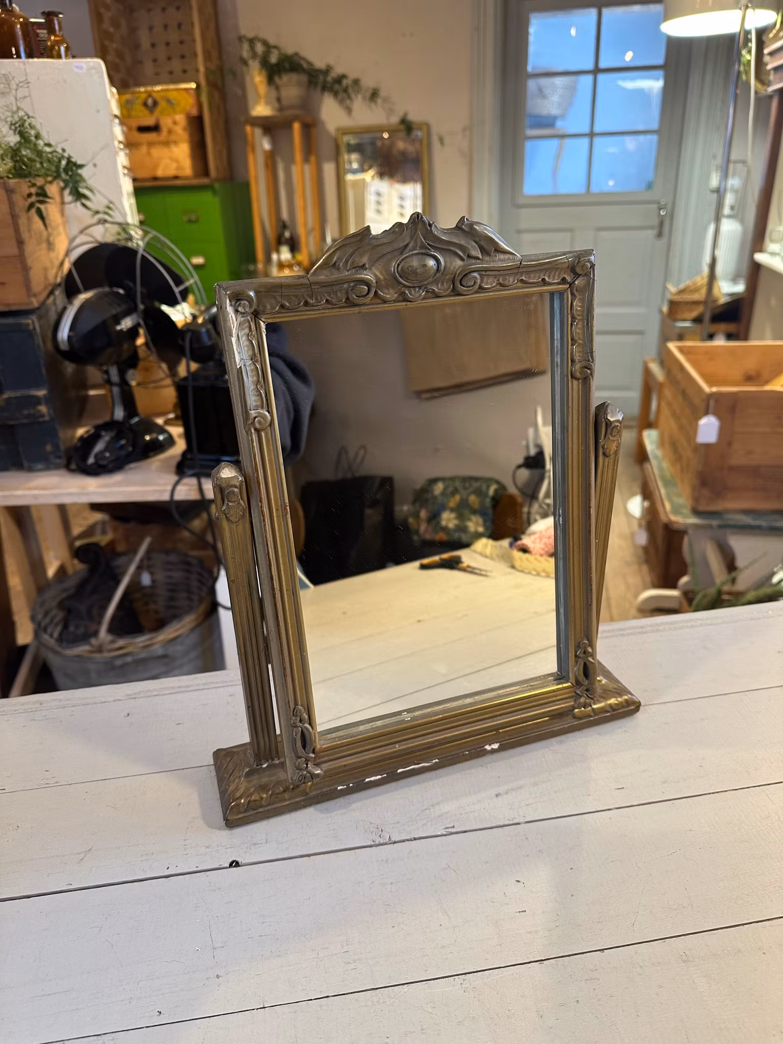 Ljuvlig gammal spegel med stativ. Guldfärgad åldrad nyans. Litet sött krön.
