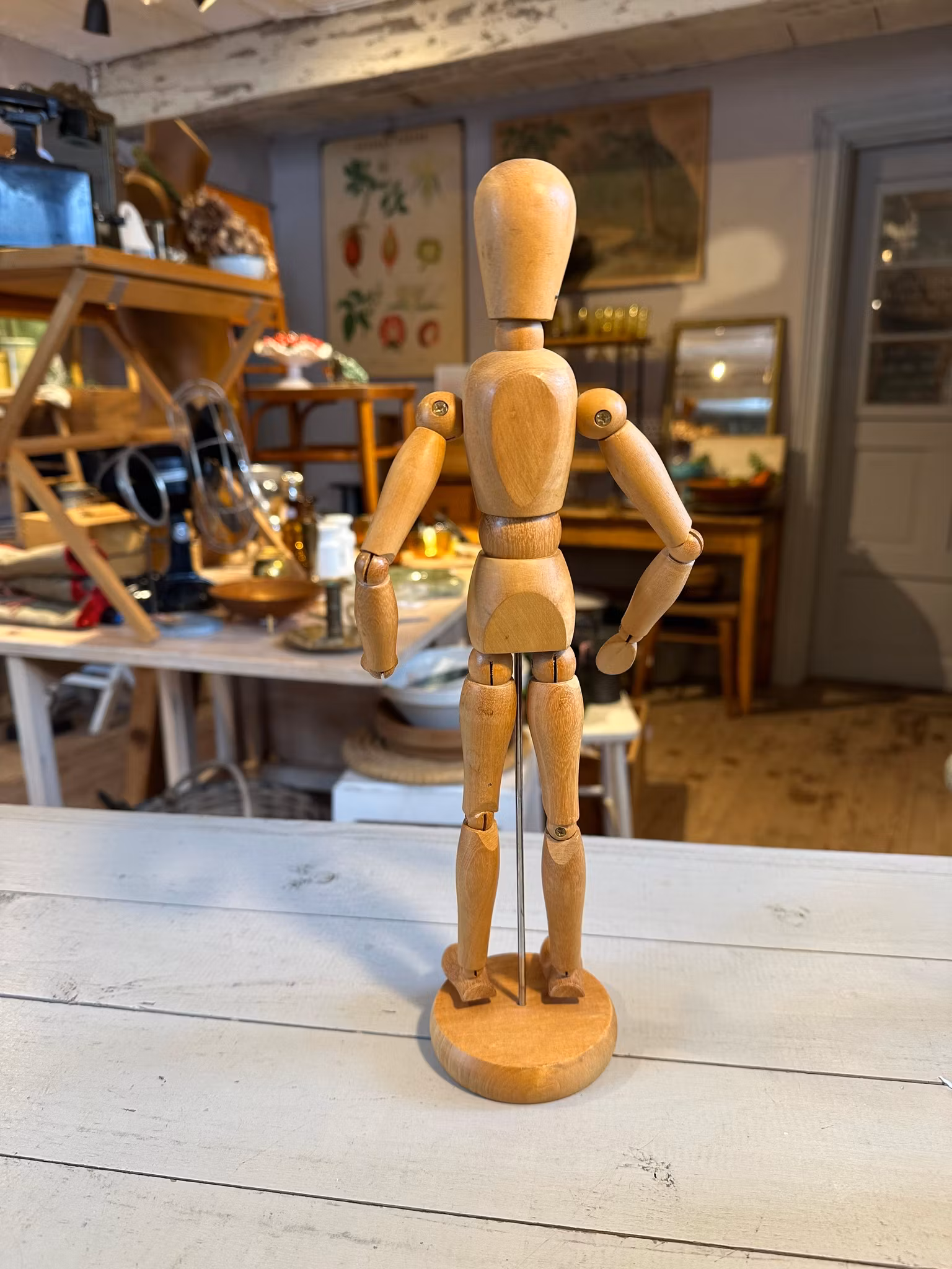 Fin gubbe i trä med rörliga leder. Inte gammal men har fått fin patina och varmt ljusbrun färg av användning.