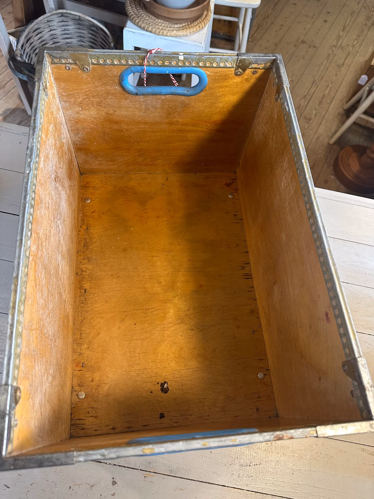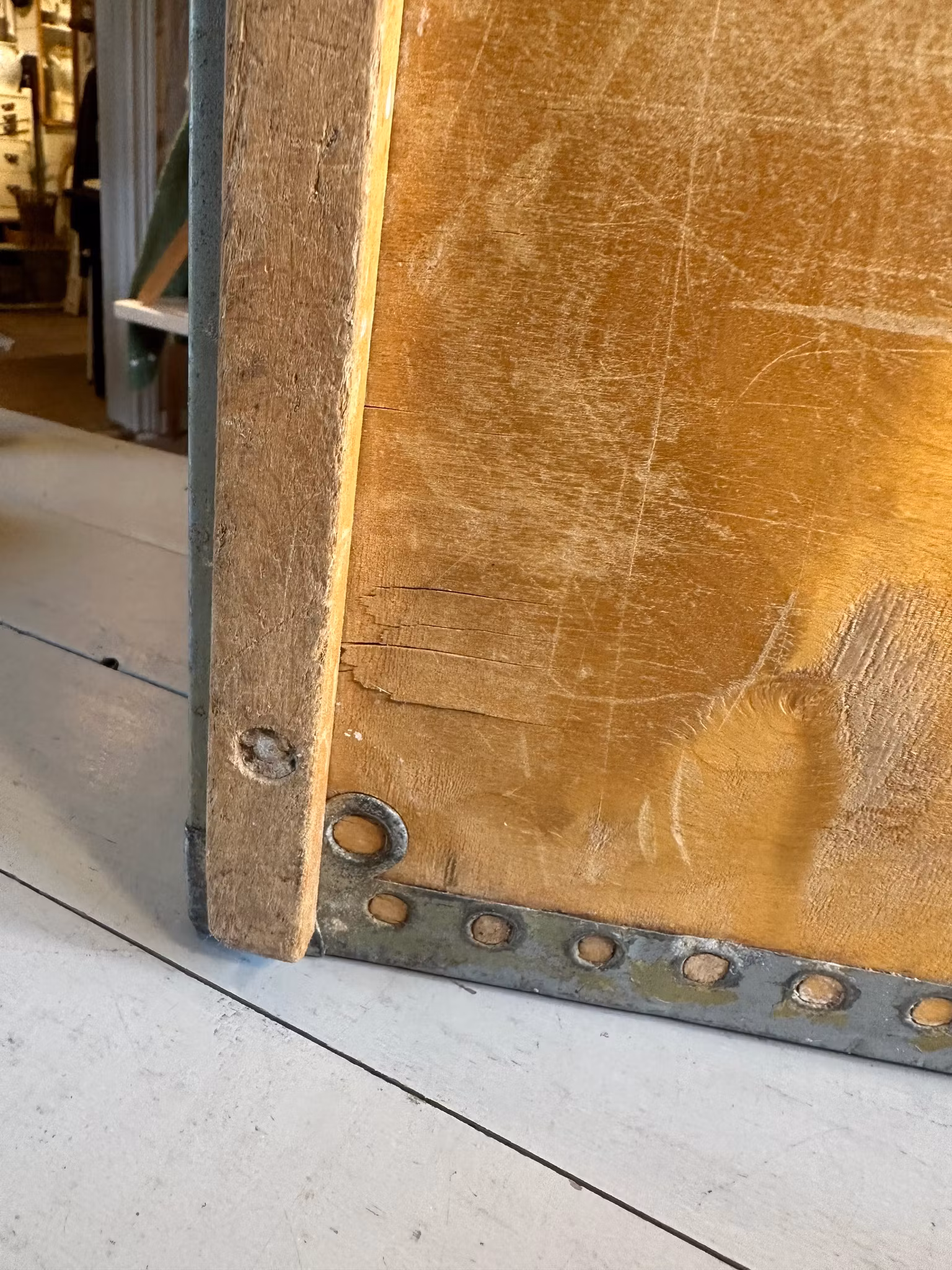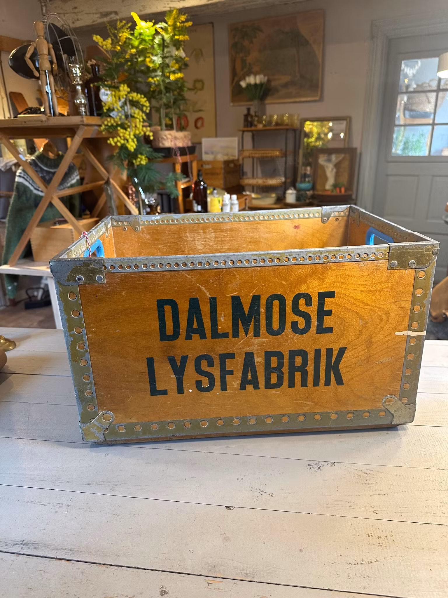Charmig gammal industriell trälåda med text Dalmose Lysfabrik.