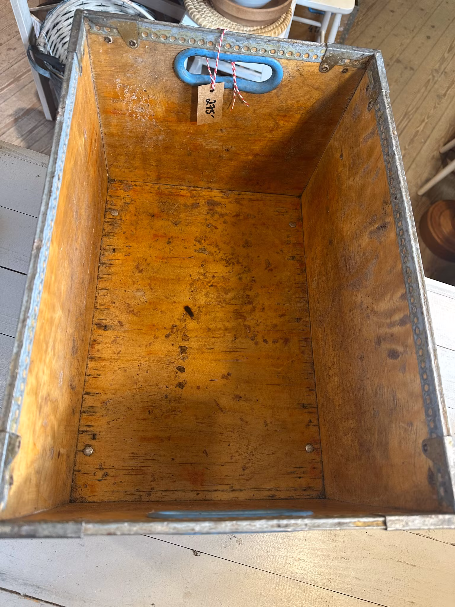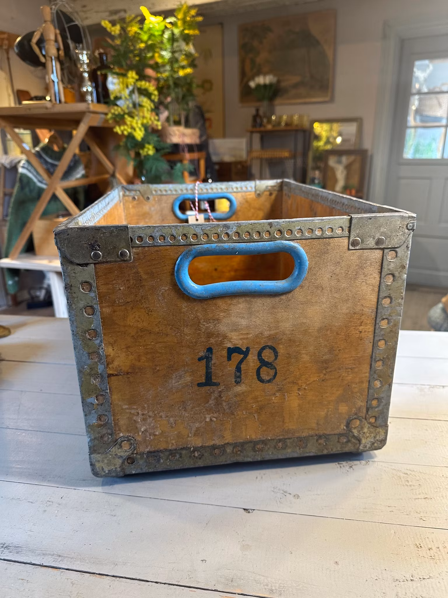Charmig gammal industriell trälåda med text Dalmose Lysfabrik.