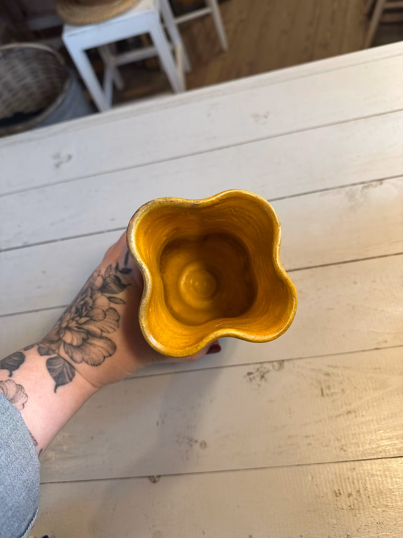 I gott använt och åldrat skick. Spår av användning finns över hela. Se bilder för skick. Några små avslag på basen samt på kanten upptill. Ej testad för täthet.