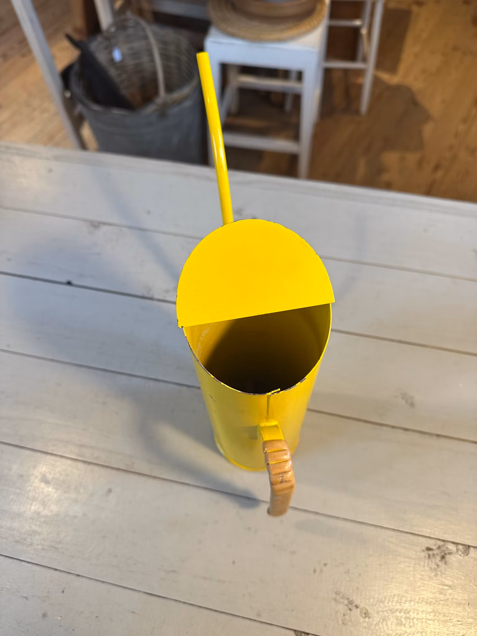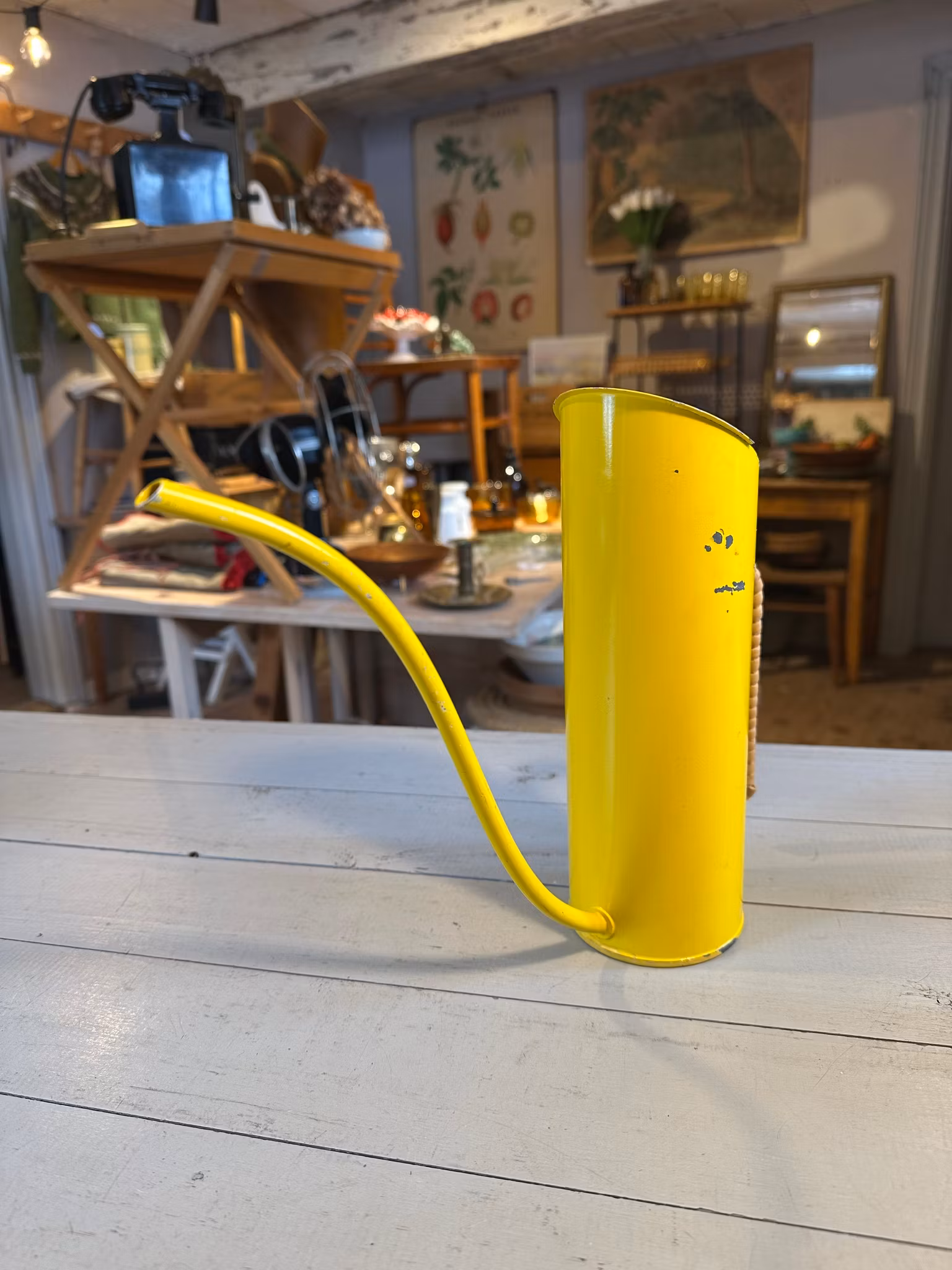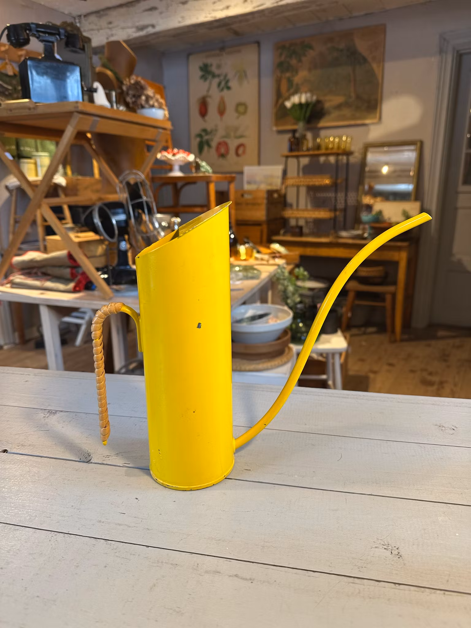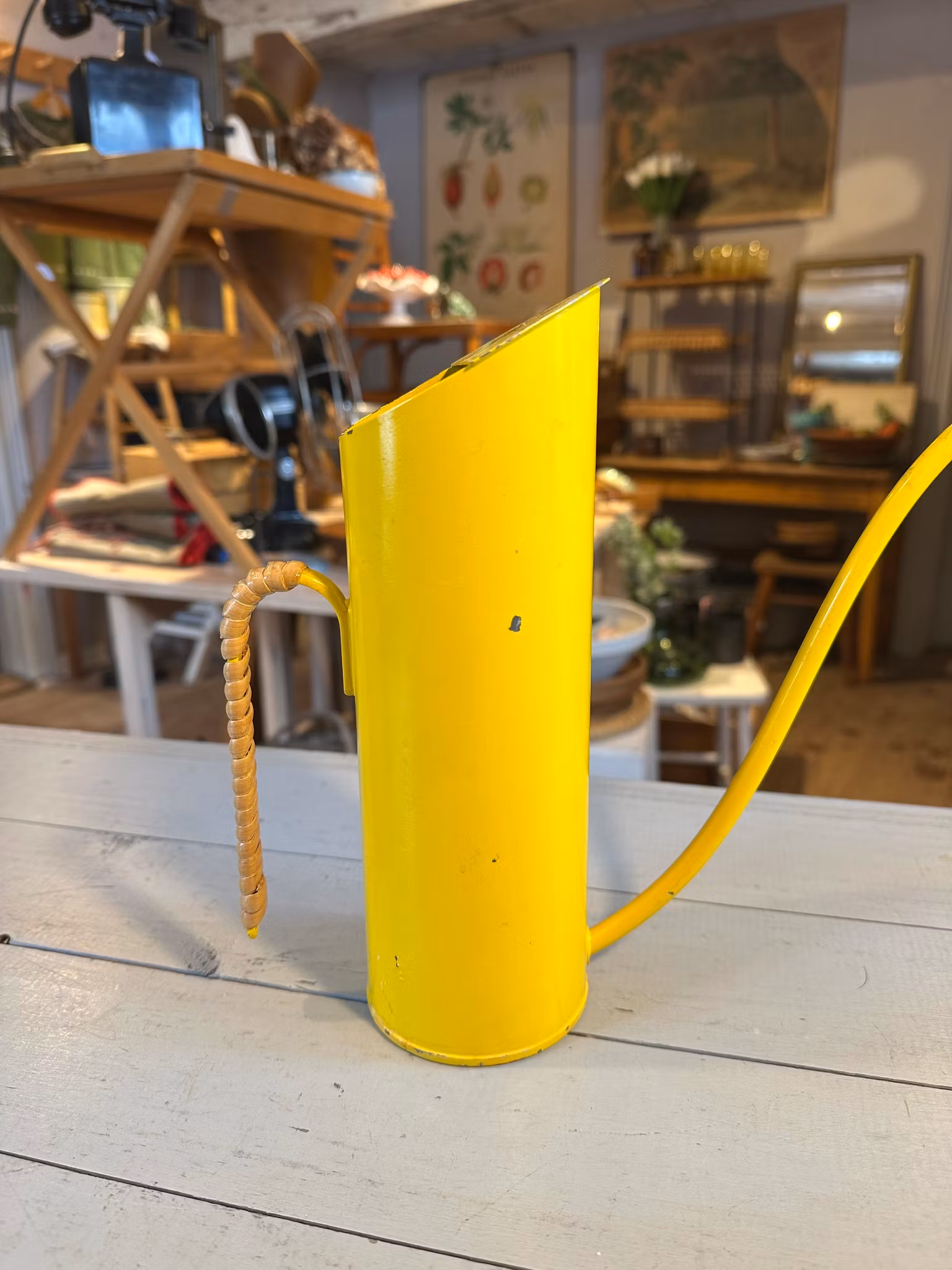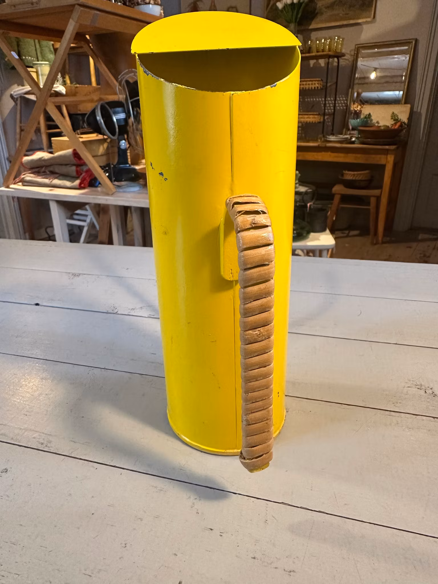 Vacker gammal vattenkanna i gult med flätning på handtaget. Design av Gunnar Ander för Ystad Metall.